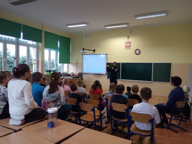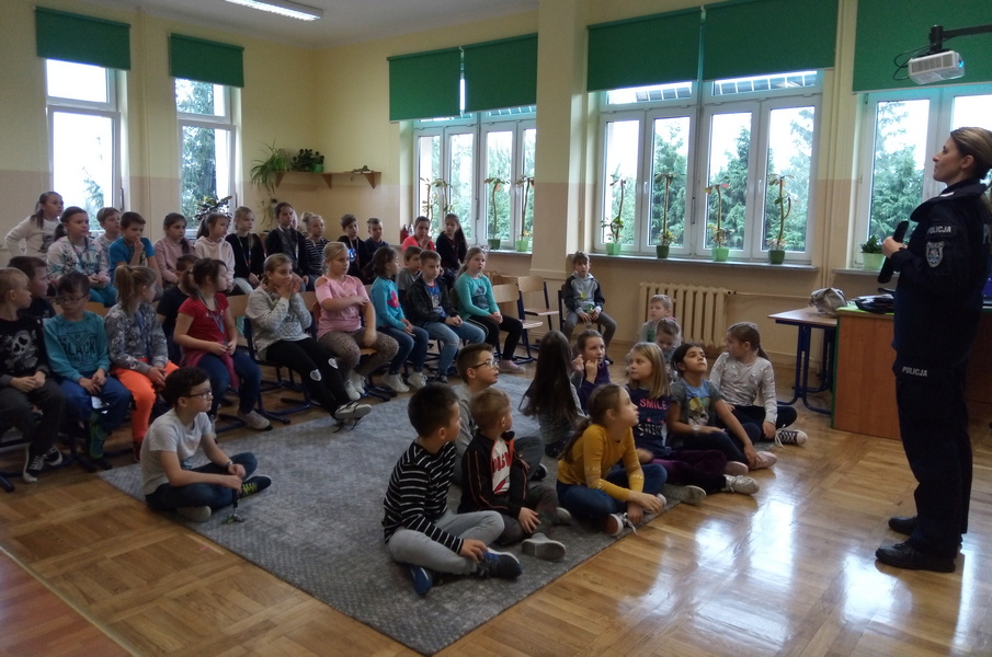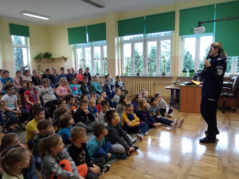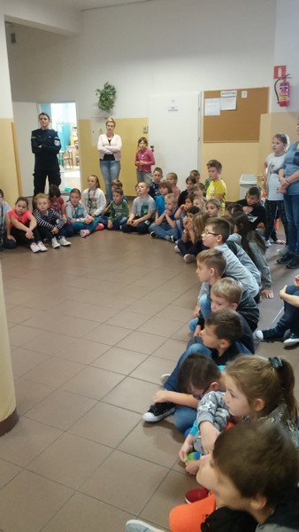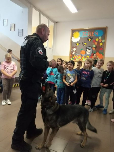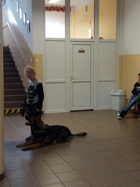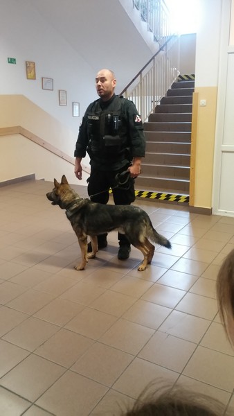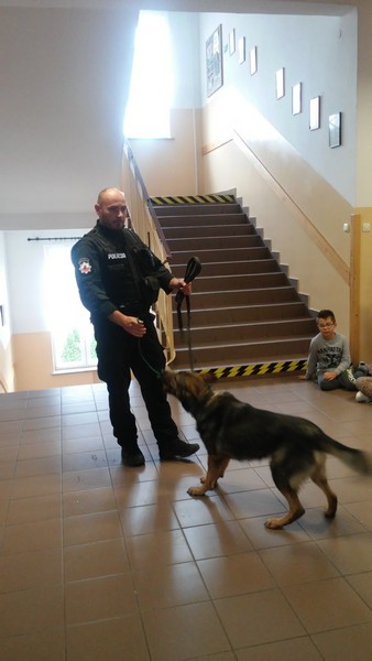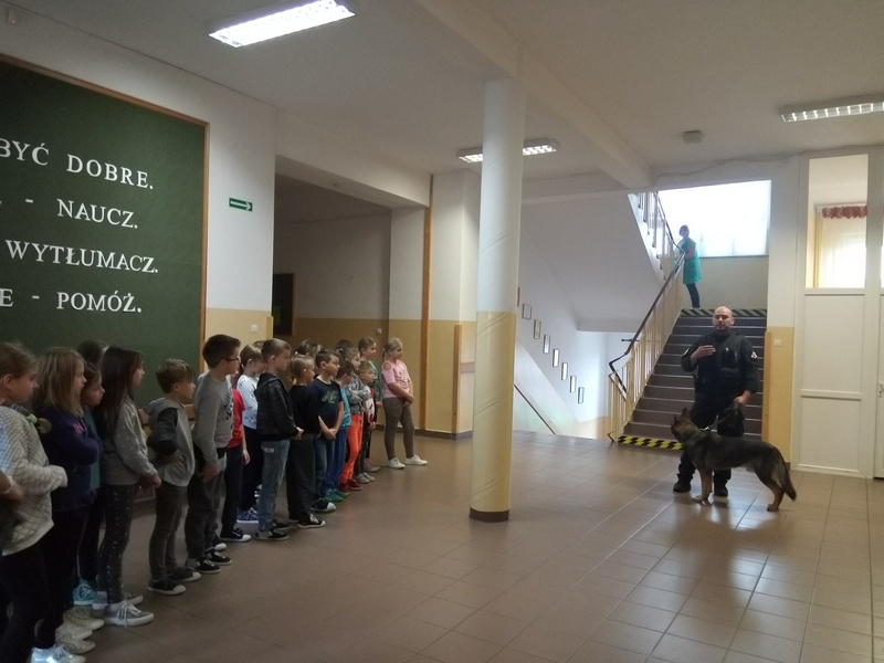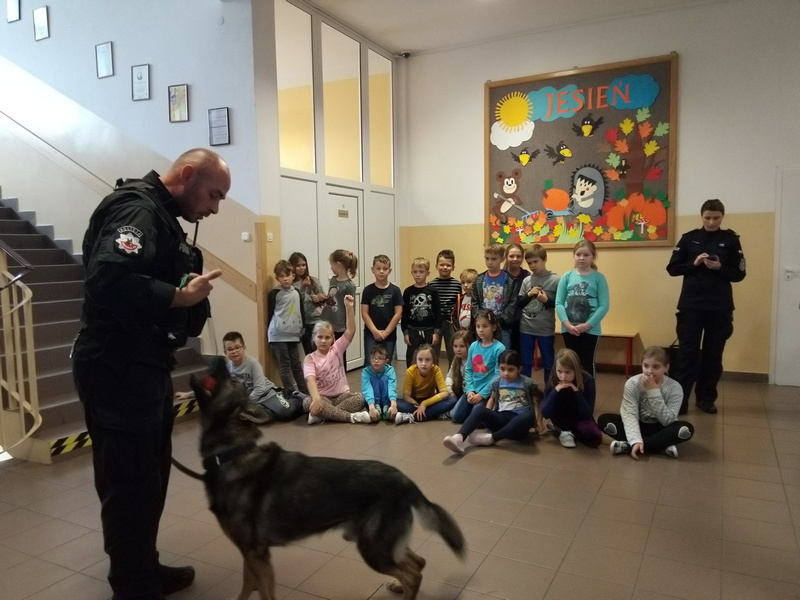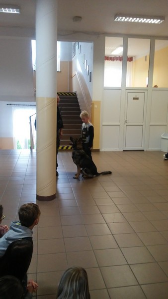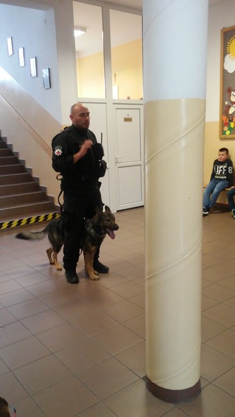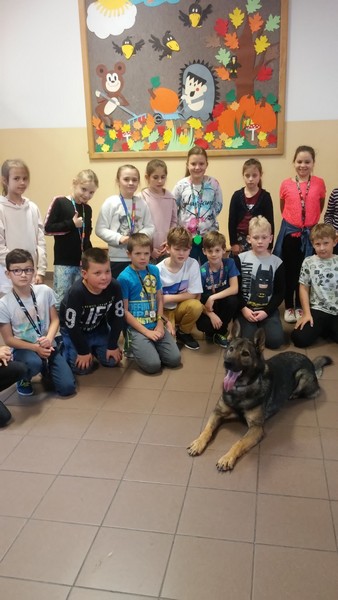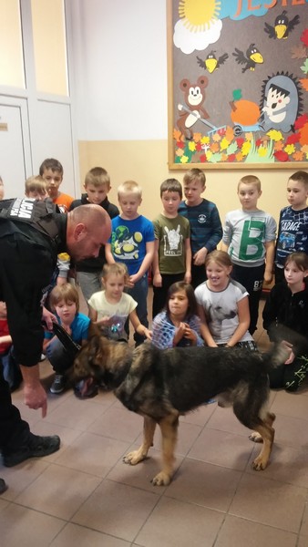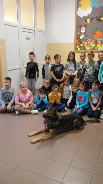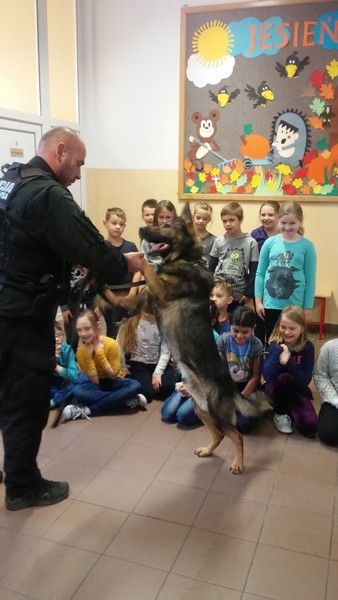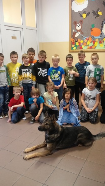 7 listopada w naszej szkole gościliśmy dwoje policjantów. Na początku spotkania pani policjantka zrobiła uczniom klas: IIIa, IIa i IIb powtórkę z zasad zachowania się w szkole, w domu, na drodze, w kontaktach z obcymi oraz z reguł związanych z korzystaniem z Internetu. Następnie na dzieci czekała wyjątkowa niespodzianka. Pan policjant przyprowadził psa tropiącego – wilczura Alfa, wykorzystywanego w policji do zadań specjalnych. Dzieci mogły zobaczyć, jak – na komendy swojego opiekuna – pies wykonuje różne zadania, polecenia, z “lataniem” włącznie. Wspaniale też pozował do wspólnych zdjęć. Było to niezapomniane spotkanie.