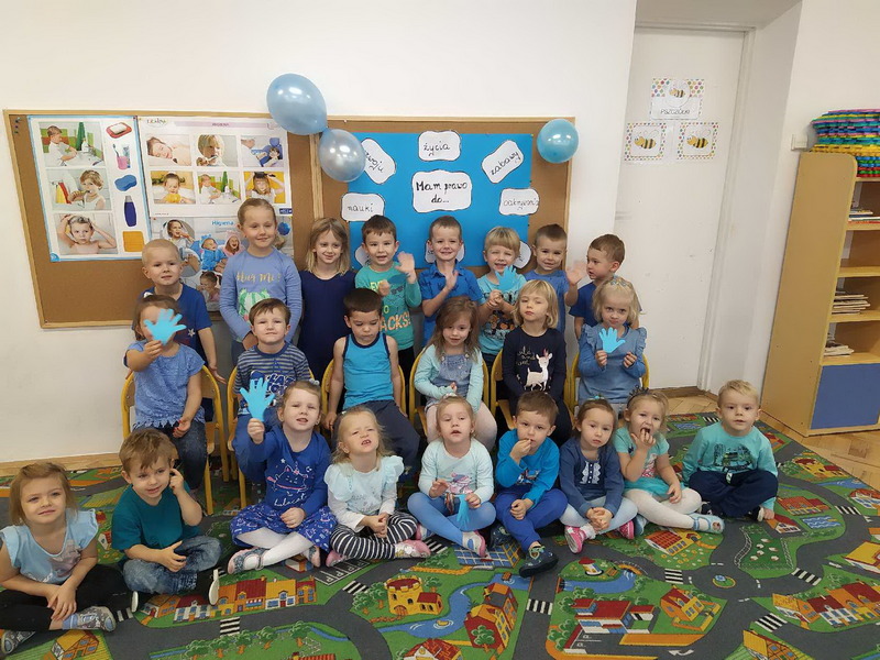 Międzynarodowy Dzień Praw Dziecka obchodzony jest 20 listopada. To dzień, w którym uwaga wszystkich kierowana jest na dzieci i ich prawa. W 2019 r. mija dokładnie 30 lat od uchwalenia przez Organizację Narodów Zjednoczonych najważniejszego dokumentu stanowiącego o prawach najmłodszych – Konwencji o Prawach Dziecka. To najważniejszy dokument dotyczący praw dzieci na świecie. Mówi o tym, że każdemu dziecku, niezależnie od koloru skóry, wyznania czy pochodzenia, przysługują takie same prawa. Przedszkolaki tego dnia przyszły do przedszkola ubrane na niebiesko, ponieważ jest to kolor UNICEF-u i w ten sposób solidaryzowały się ze wszystkimi dziećmi na świecie, również tymi, których prawa nie są przestrzegane.