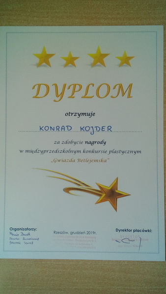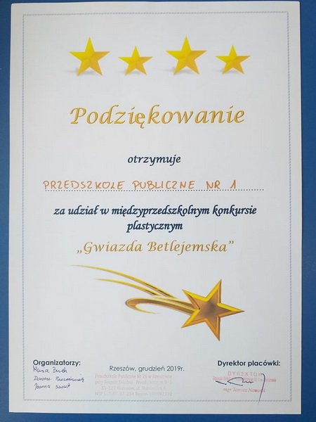 Na początku grudnia został rozstrzygnięty międzyprzedszkolny konkurs zorganizowany przez Publiczne Przedszkole nr 26 w Rzeszowie pod nazwą “Gwiazda betlejemska”. Jury konkursu, biorąc pod uwagę pomysłowość oraz estetykę wykonania prac, doceniło wychowanków naszego przedszkola. Z przyjemnością informujemy, iż nagrody otrzymali: Zuzanna Kubicz z grupy “Żabki” oraz Konrad Kojder z grupy “Biedronki”. Zwycięzcom serdecznie gratulujemy i życzymy kolejnych sukcesów!