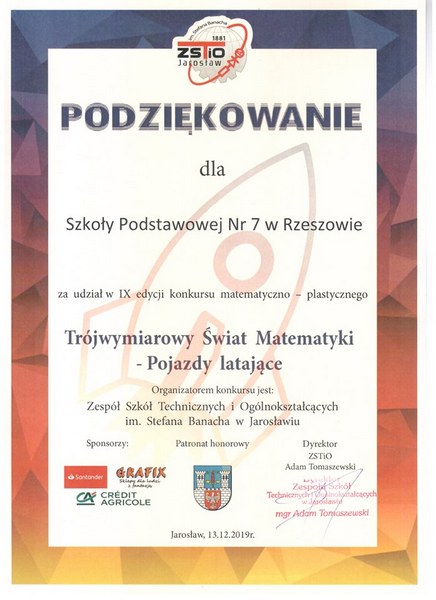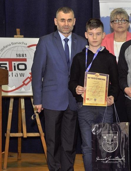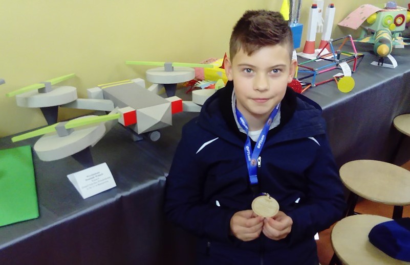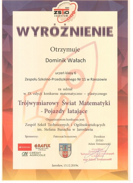 Dominik Wałach (kl. 6a) otrzymał wyróżnienie w konkursie “Trójwymiarowy Świat Matematyki – Pojazdy latające”, zorganizowanym przez Zespół Szkół Technicznych i Ogólnokształcących w Jarosławiu. W konkursie wzięło udział 179 uczniów z 36 szkół. Zadanie konkursowe polegało na wykonaniu, z dowolnego materiału, pojazdu składającego się z przestrzennych figur geometrycznych. Tytuł wyróżnionej pracy: “Dron”. 13 grudnia w Jarosławiu podczas uroczystego podsumowania konkursu Dominik otrzymał pamiątkowy dyplom, medal i nagrody rzeczowe. Opiekunem ucznia jest pani Małgorzata Dronka – nauczyciel matematyki.
