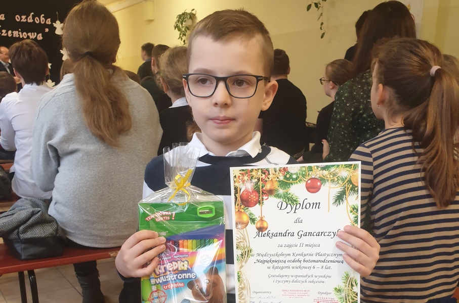 9 stycznia 2020 r. w Szkole Podstawowej nr 29 w Rzeszowie, podczas wspólnego kolędowania, został rozstrzygnięty konkurs, a zwycięzcy otrzymali nagrody i dyplomy. Rywalizacja miała na celu rozwijanie wyobraźni oraz pobudzanie aktywności twórczej uczniów, stworzenie im możliwości prezentacji własnych dokonań twórczych, poszerzanie wiedzy z zakresu różnych technik plastycznych, powrót do tradycji wykonywania ozdób bożonarodzeniowych, umożliwienie przedstawienia własnej wizji, nastroju oraz tradycji świąt Bożego Narodzenia. Wśród nagrodzonych byli również uczniowie z naszej szkoły: I miejsce: Alicja Pocałuń z kl. II a – opiekun pani Marta Piech-Król, II miejsce: Aleksander Gancarczyk z kl. Ia – opiekun pani Maria Wiktor, wyróżnienie Igor Domaradzki z kl. IIa – opiekun pani Marta Piech-Król.