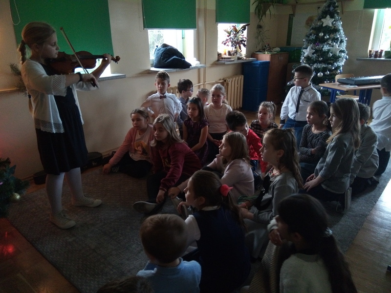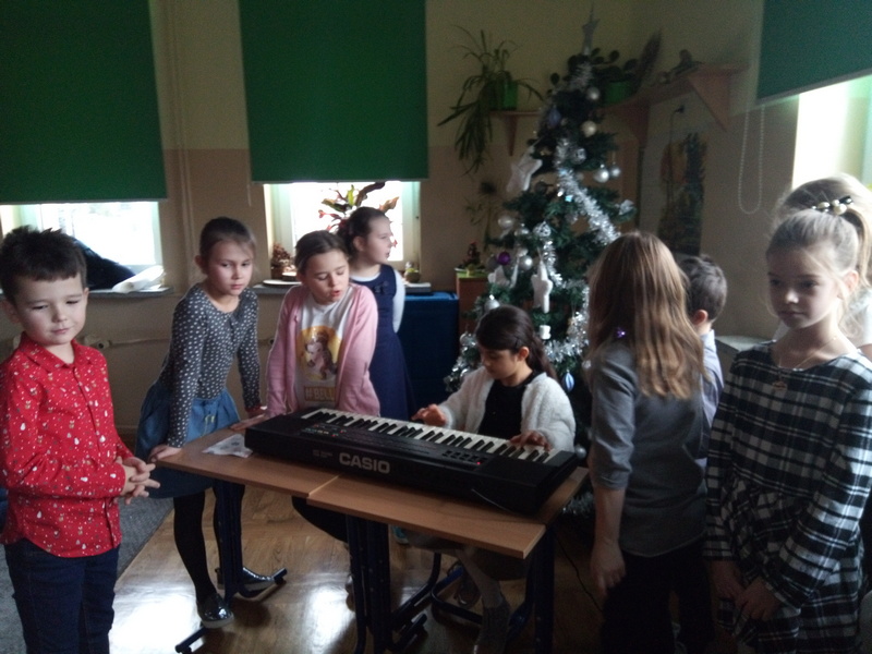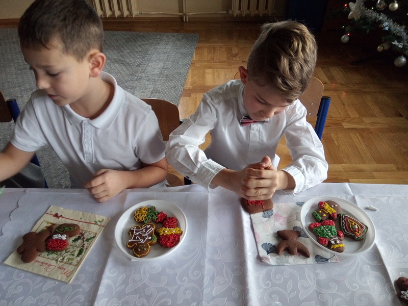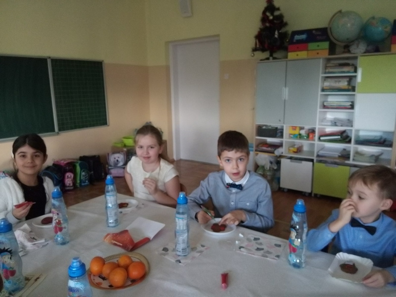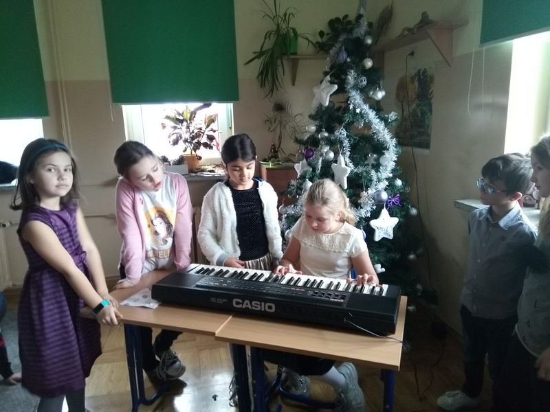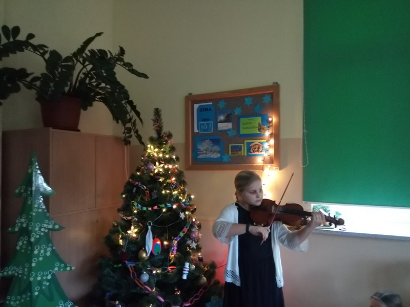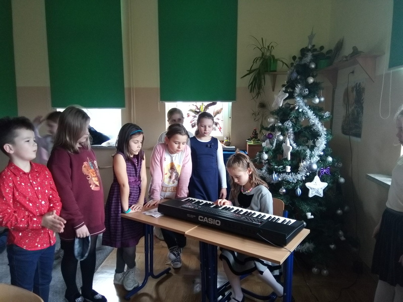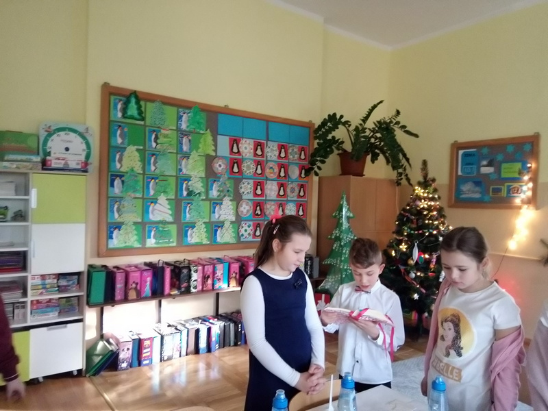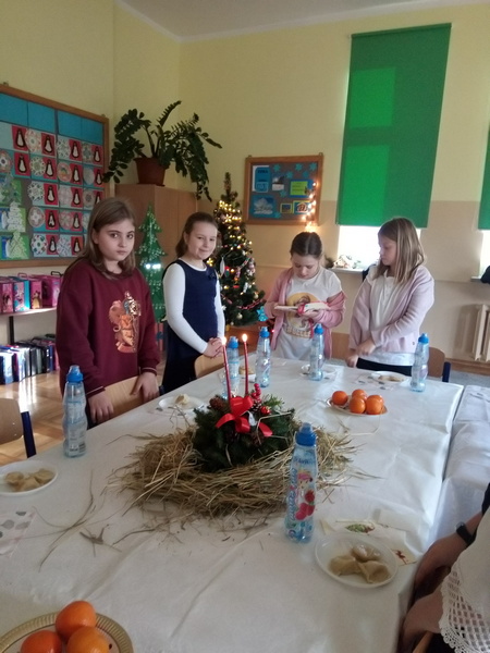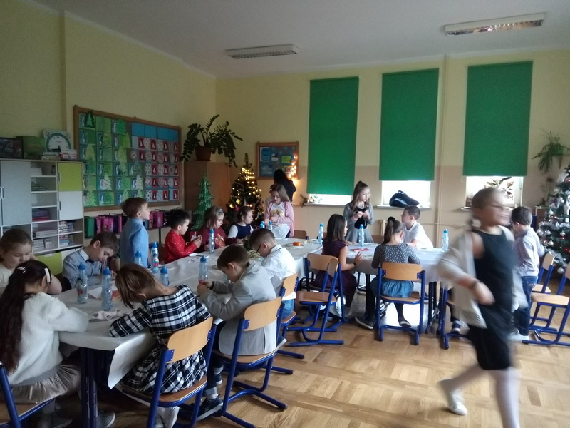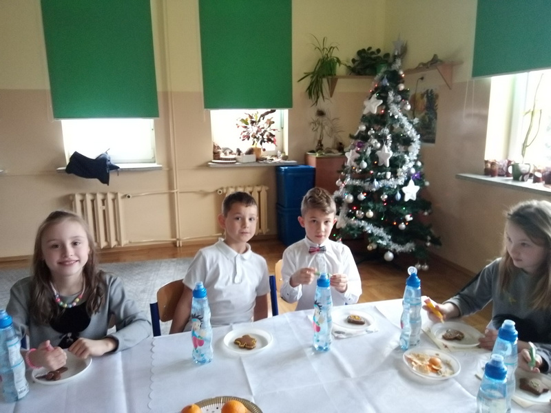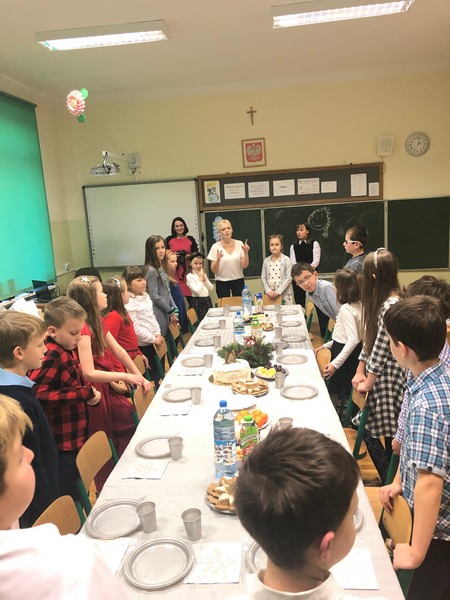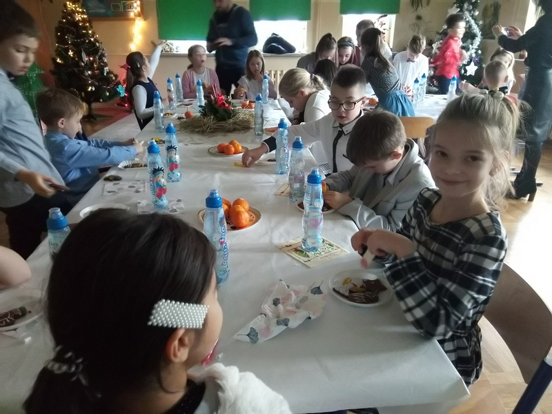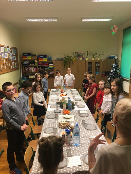Co roku w naszej szkole kultywowany jest zwyczaj obchodzenia wigilii świąt Bożego Narodzenia w klasach I-III. Zgodnie z tradycją, 20 grudnia odbyło się spotkanie opłatkowe. Wychowawcy wraz z uczniami zasiedli do pięknie nakrytych przez rodziców, obfitujących w różne potrawy stołów. Dzieci składały sobie życzenia, kolędowały i grały na instrumentach. W tle widniały przystrojone choinki i ozdoby na oknach. Uczniowie opowiadali o tradycjach Bożego Narodzenia. Panowała serdeczna, rodzinna atmosfera.