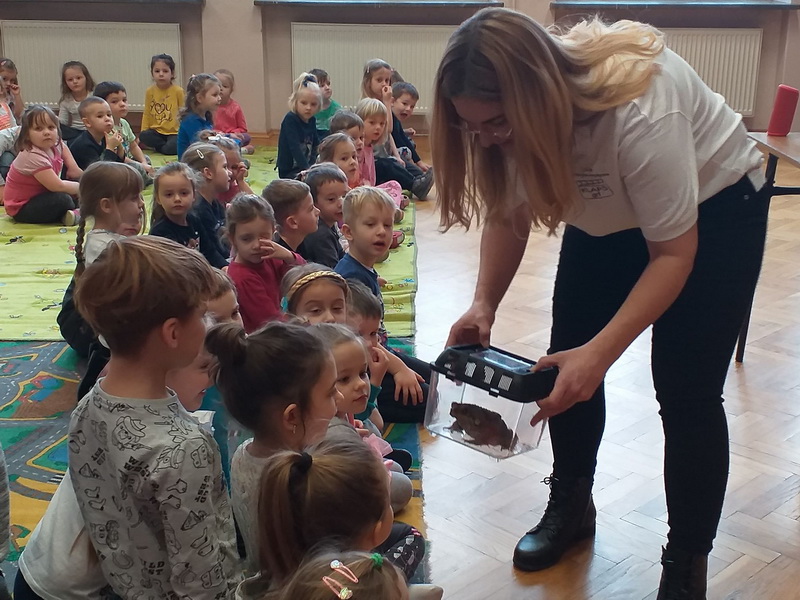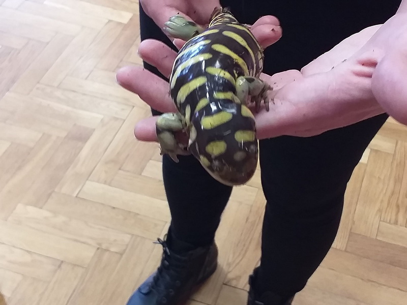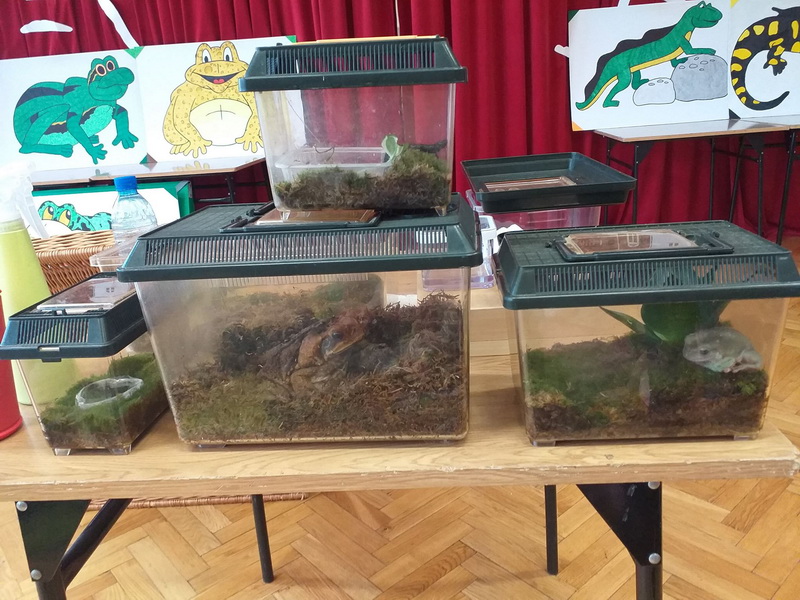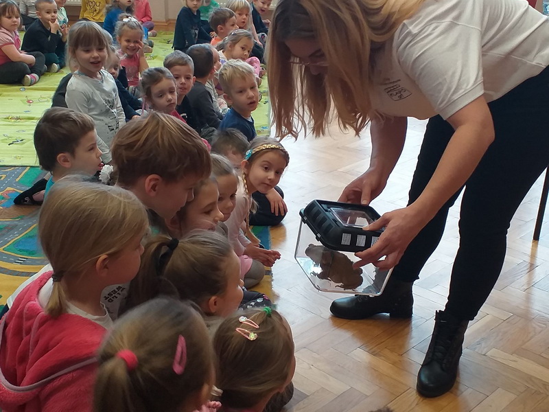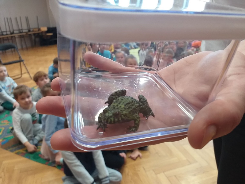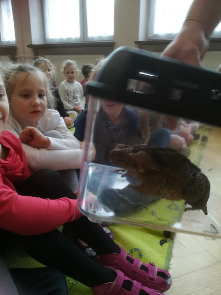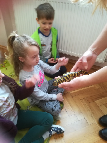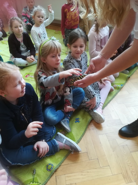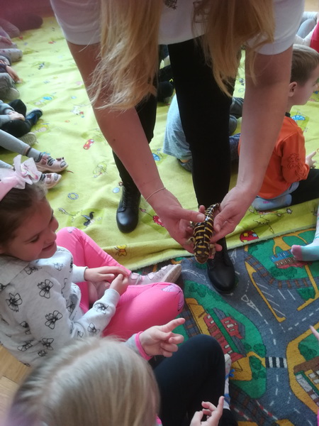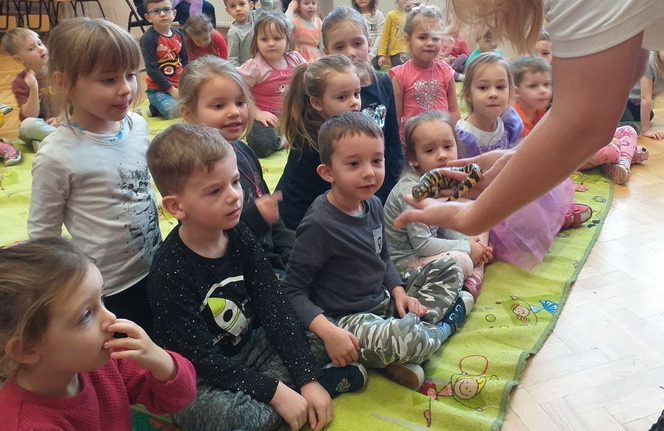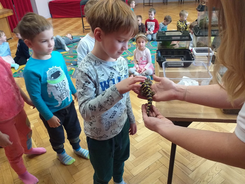 30 stycznia dzieci z naszego przedszkola miały możliwość uczestniczyć w niecodziennej lekcji przyrody w ramach programu “Dzieciaki kochają zwierzaki, czyli ciekawe spotkanie z przyrodą na żywo – płazy”. Mogliśmy obejrzeć interesujące gatunki płazów, m.in. rzekotki, drzewołazy, ropuchę agę, traszki, salamandrę, które pochodzą z różnych rejonów świata, np. Ameryki Południowej, Australii czy Azji. Dowiedzieliśmy się, jakich rozmiarów są te zwierzęta, czym się żywią, po co im takie ubarwienie, a także dzięki czemu mogą się wspinać na drzewa. Duża ilość zadawanych pytań świadczyła o tym, że dzieci były bardzo zainteresowane tymi zajęciami.