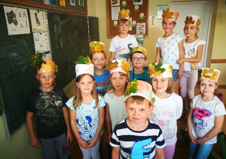 23 września obchodziliśmy w naszej szkole Pierwszy Dzień Jesieni. Z tej okazji dzieci dowiedziały się, dlaczego liście spadają z drzewa, jakie przyroda daje nam skarby, co zbieramy w lesie na jesieni. Tego dnia królowały kolory: brązowy, czerwony, pomarańczowy, żółty i zielony. Wspólnie śpiewaliśmy piosenki o tematyce jesiennej, głoskowaliśmy i układaliśmy z liter wyraz JESIEŃ. Uczniowie klasy 1 wykonali samodzielnie pamiątkowe opaski na głowę z liści. Kolejnym etapem było wykonanie lapbooka pt. ”Jesień”, w którym zostały zebrane wiadomości o tej pięknej porze roku. W sali świetlicowej powstał kącik jesiennych darów.