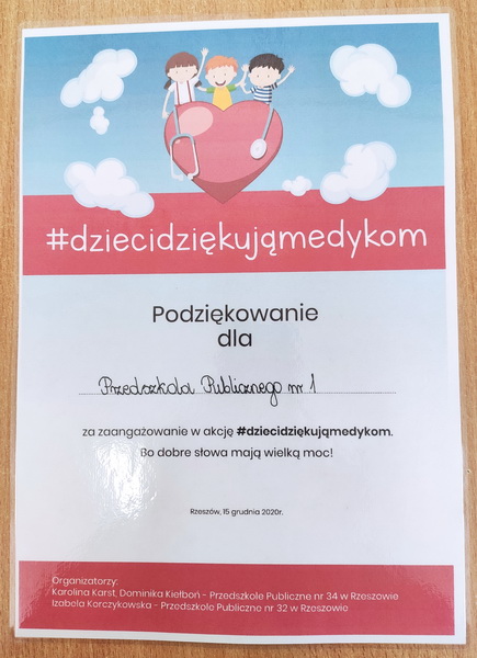 Po raz kolejny nasze przedszkolaki wraz z wychowawcami postanowiły docenić zaangażowanie oraz poświęcenie pracowników służby zdrowia walczących z epidemią koronawirusa, biorąc udział w ogólnopolskiej akcji ,,Dzieci dziękują medykom”, organizowanej przez Przedszkole Publiczne nr 32 i 34 w Rzeszowie. Niech dobre słowa, szczere życzenia oraz piękne prace plastyczne przedszkolaków podniosą na duchu wszystkich pracowników medycznych, by mieli siłę do dalszej walki. DZIĘKUJEMY!!!