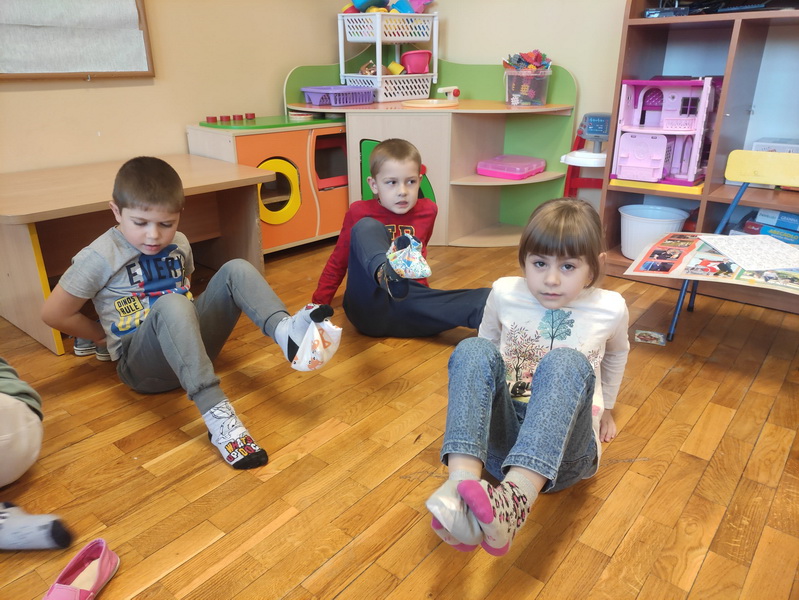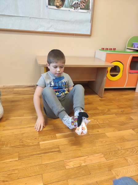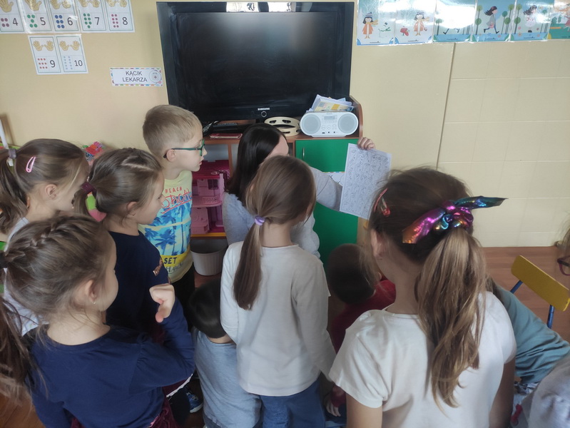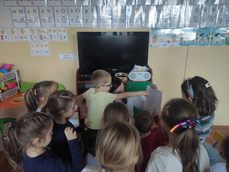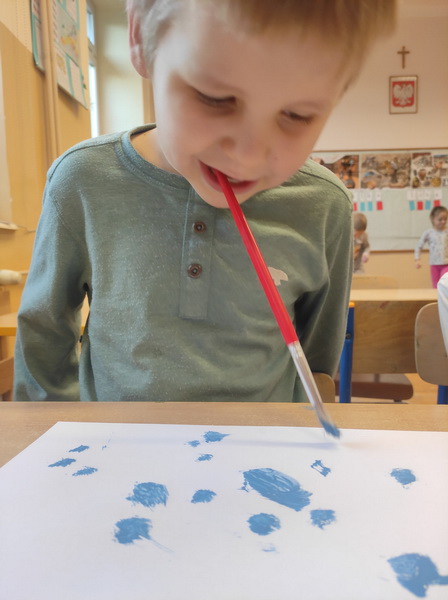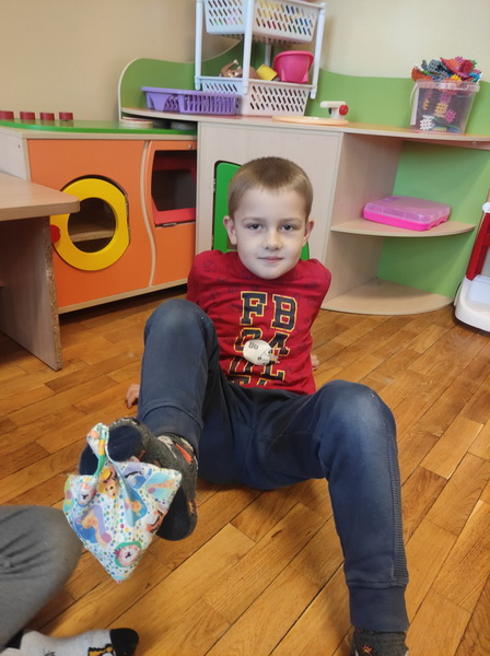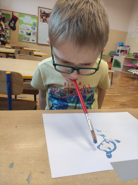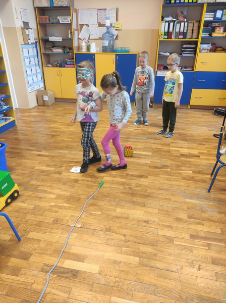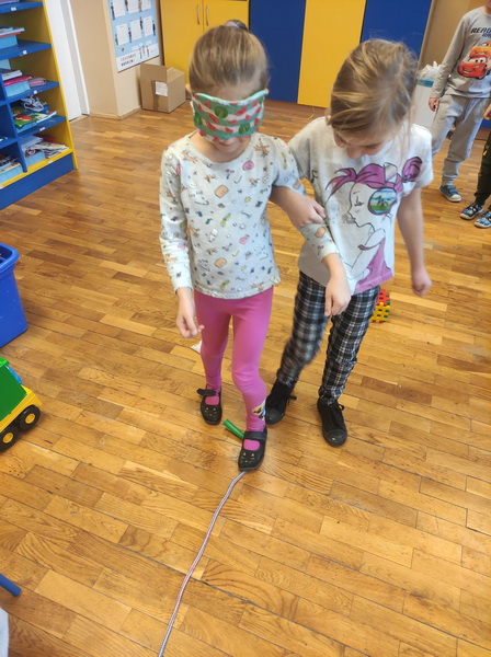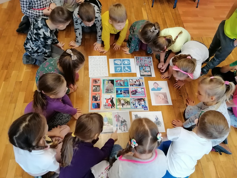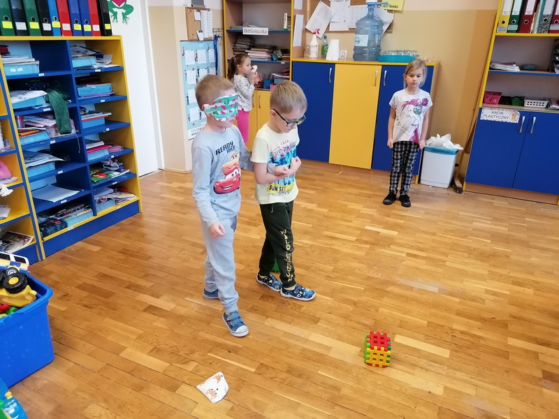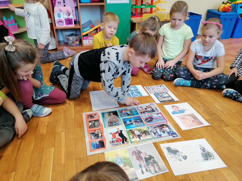 Przedszkolaki z grupy “Żabki” miały okazję podczas zabaw i ćwiczeń wcielić się w rolę osób niepełnosprawnych. Zajęcia otworzył film o tym, jak funkcjonują osoby niepełnosprawne oraz jak społeczeństwo reaguje na osoby „inne”, wyróżniające się. Dzieci wykonały zadanie „Głuche zagadki”, zaciskając palcami uszy, musiały nasłuchiwać dźwięków z otoczenia i poleceń nauczyciela, jednocześnie je wykonując, co nie było łatwym zadaniem. Podczas kolejnej zabawy pt. „Budujemy ciszę” dzieci miały zawiązane oczy, by zobaczyć, że nie jest łatwo osobie słabowidzącej poruszać się w środowisku lokalnym. Jako przewodnik posłużył im kolega/koleżanka z grupy. Prowadząc siebie nawzajem przez tor przeszkód, uczyli się odpowiedzialności, zrozumienia i w pełni musieli zaufać jeden drugiemu. Niepełnosprawność to też braki kończyn lub ich deformacje – “Żabki” przy kolejnej zabawie malowały obraz za pomocą pędzla trzymanego tylko ustami oraz ćwiczyły przenoszenie przedmiotów za pomocą stóp. Niepełnosprawność nie musi ograniczać, każdy chce być możliwie samodzielny, radzić sobie w codziennym życiu, być częścią społeczeństwa.