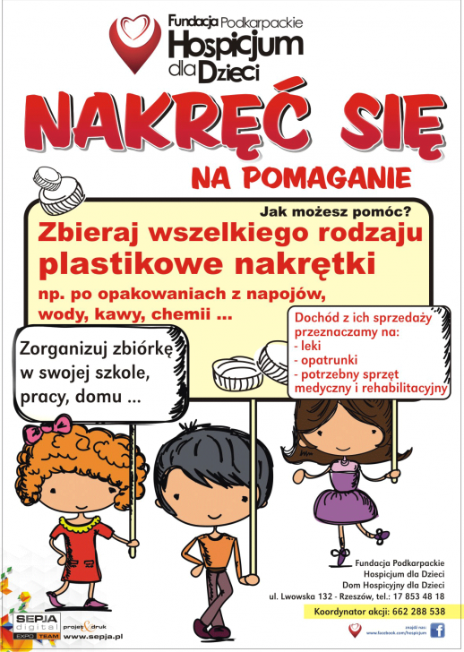 Po powrocie do szkoły odbierzemy nakrętki i przekażemy Fundacji Podkarpackie Hospicjum dla Dzieci. Zebrany towar zostanie sprzedany firmie recyklingowej, która zakupione zakrętki przerabia na surowiec wtórny (plastikowy granulat). Producent może przetworzyć wówczas zebrane odpady na nowe zakrętki, opakowania, rury PCV czy obudowy komputerów. Uzyskane w ten sposób pieniądze przekazane zostają z kolei na leczenie – leki, opatrunki medyczne, rehabilitację dzieci lub sprzęt specjalistyczny dla podopiecznych Fundacji Podkarpackie Hospicjum dla Dzieci.