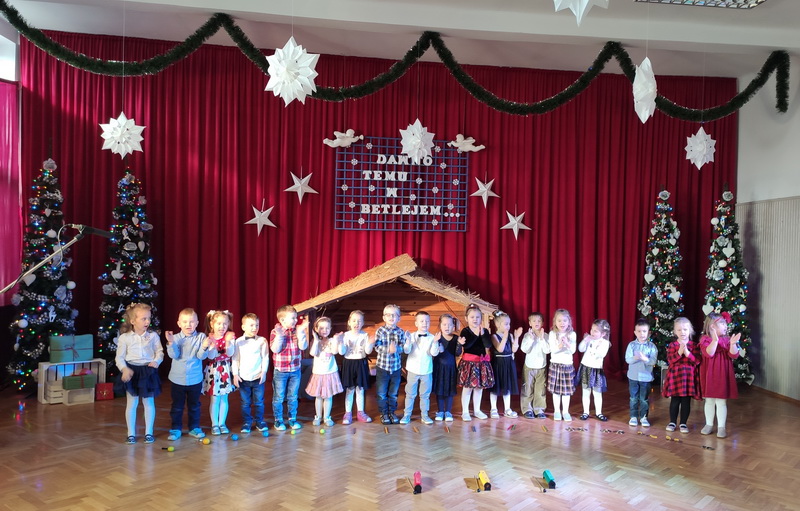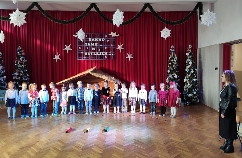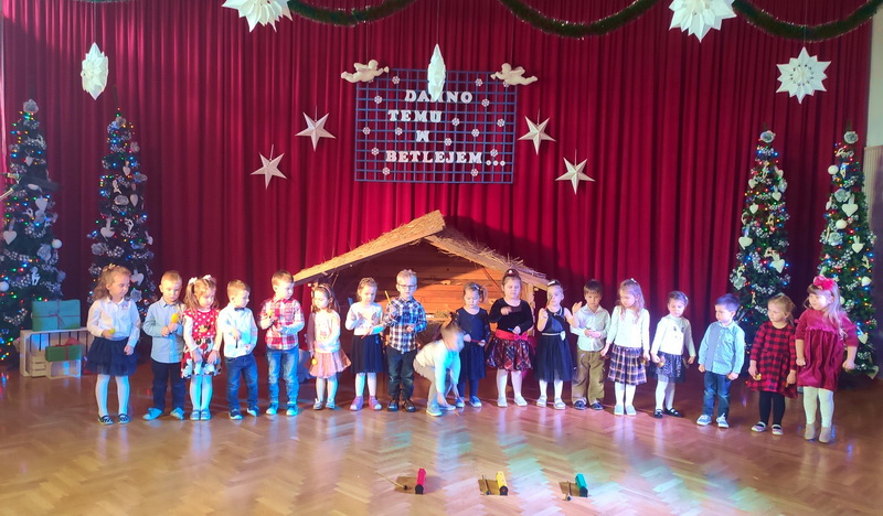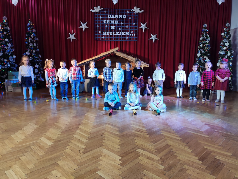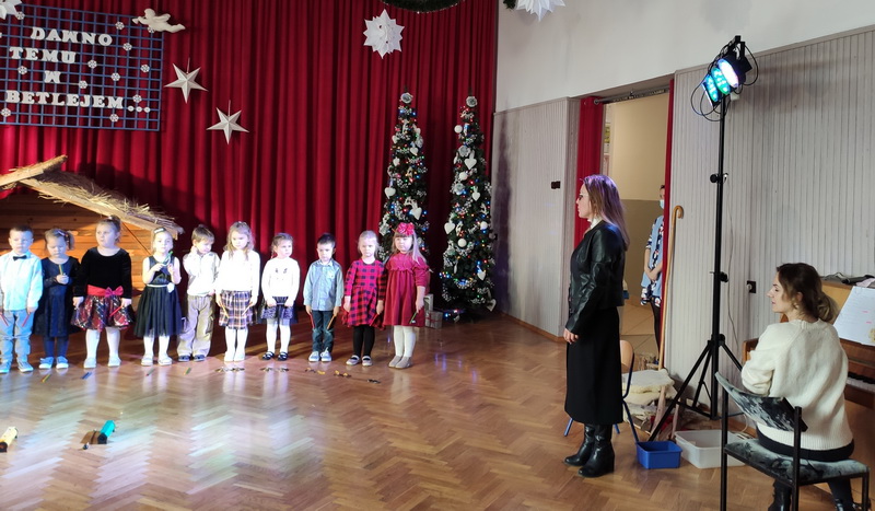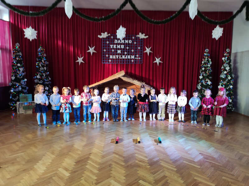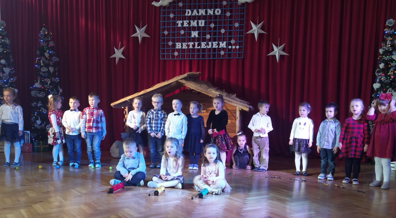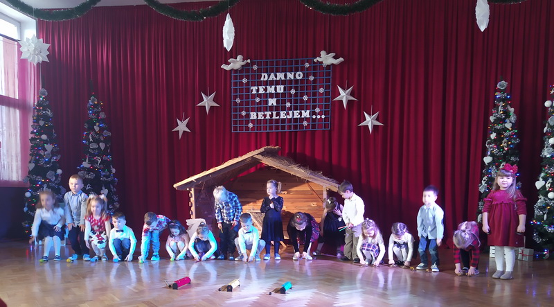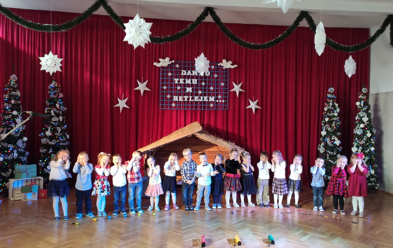 W ramach Ogólnopolskiego Projektu Edukacyjnego „Z kulturą mi do twarzy” przedszkolaki z grupy „Smerfy” wraz z wychowawczyniami zorganizowały koncert kolęd i pastorałek „Wśród nocnej ciszy”. W naszym koncercie nie zabrakło poważnych kolęd, takich jak: „Lulajże Jezuniu” czy „Gdy się Chrystus rodzi”, ale również wesołych i skocznych pastorałek. Świąteczna dekoracja, piękne odświętne stroje dzieci i ukochane polskie kolędy sprawiły, że poczuliśmy magiczny czas Świąt Bożego Narodzenia.