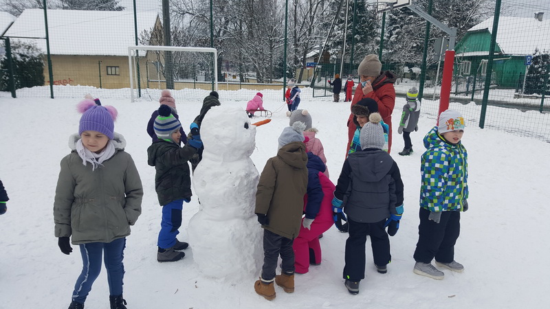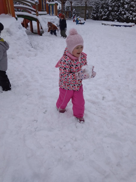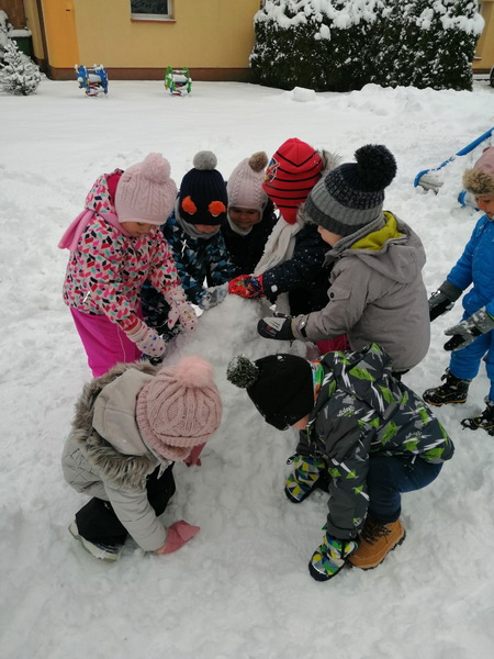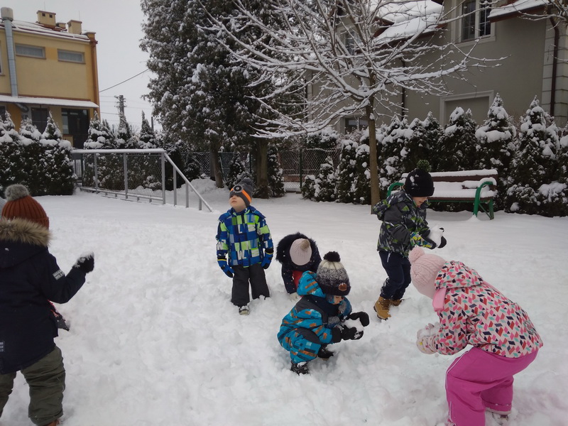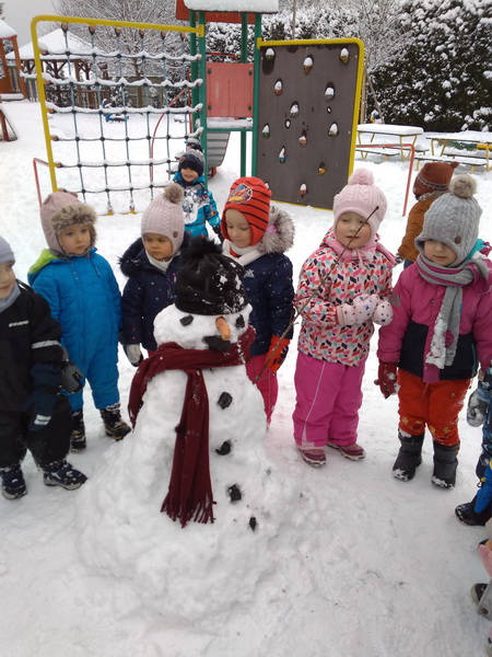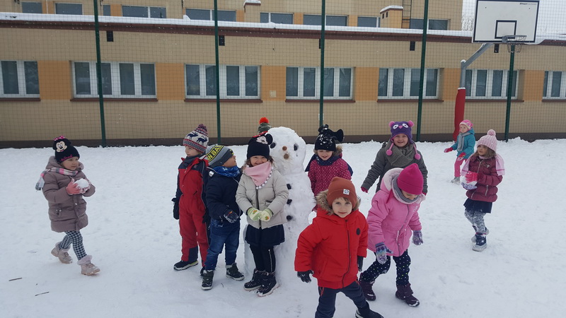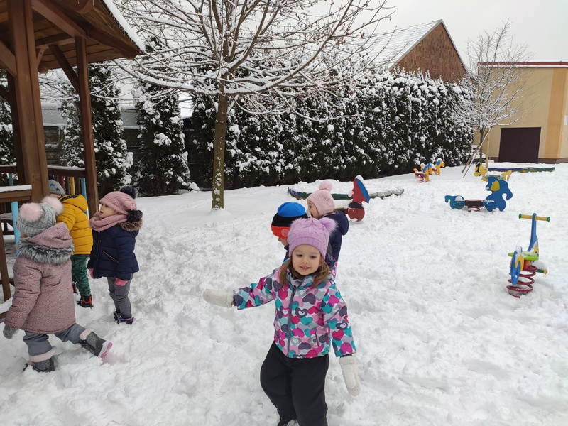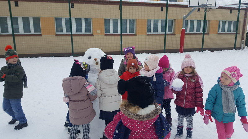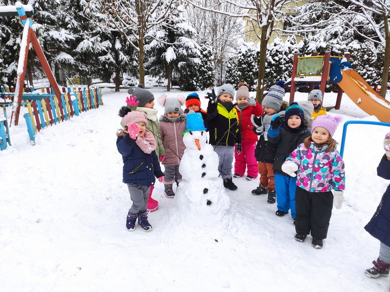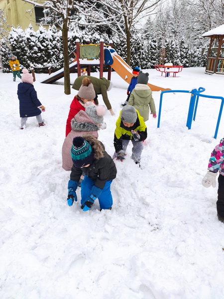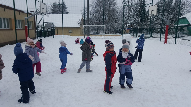 Pani Zima postanowiła nas odwiedzić i sprawiła nam wielką radość. Z tego powodu dzieci z wszystkich grup, dbając o zdrowie i hartując organizm, wybrały się na przedszkolny plac zabaw i boisko szkolne. Wreszcie mogliśmy urządzić wesołe zabawy na śniegu. Przedszkolaki oddały się zimowemu szaleństwu, chętnie lepiąc bałwana, rzucając śnieżkami do siebie, a także „atakując” kulami śniegowymi swoje panie (oczywiście zachowując zasady bezpieczeństwa). Pogoda była trochę mroźna, ale nikomu to nie przeszkadzało, bo dzieci wiedzą, że zabawy na świeżym powietrzu to świetna rozrywka. Z czerwonymi noskami i z uśmiechem wróciliśmy do przedszkola na ciepły posiłek. Było mroźnie, ale wesoło i radośnie.