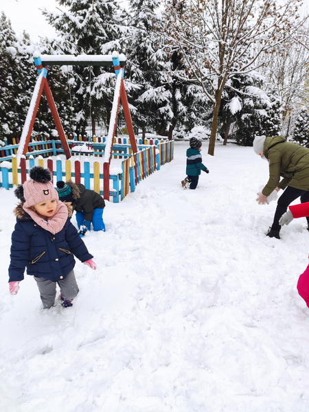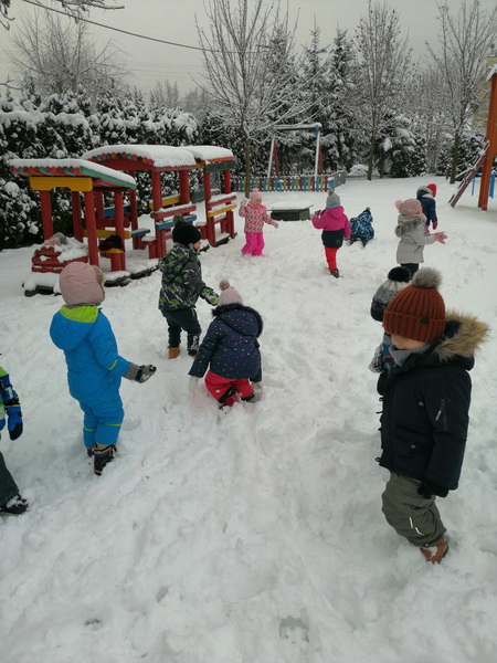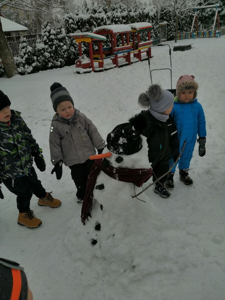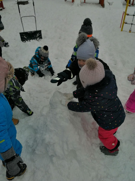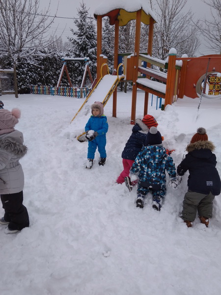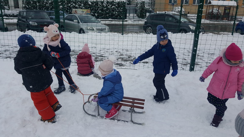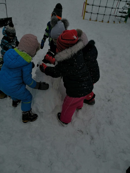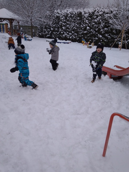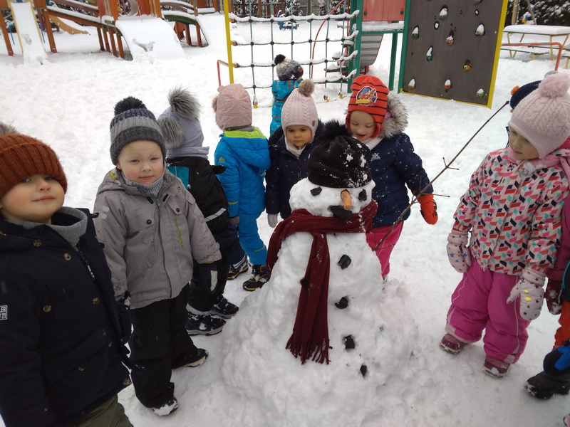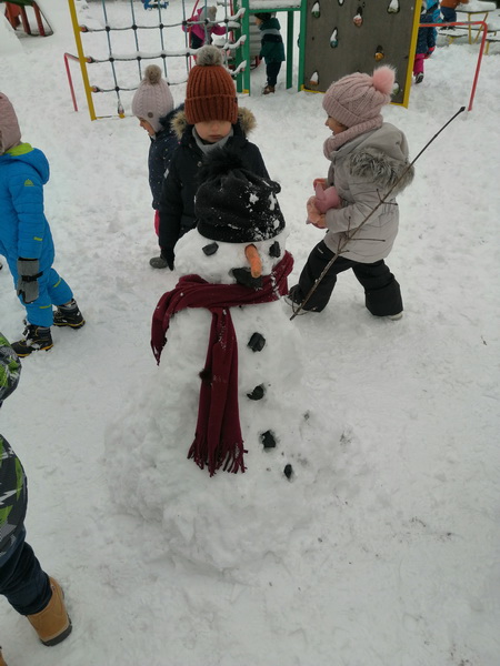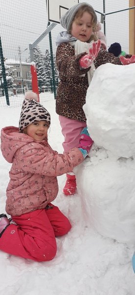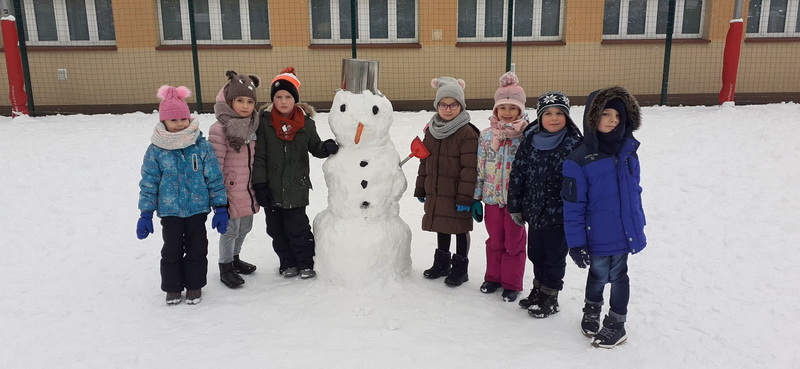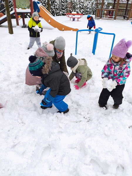 Pani Zima postanowiła nas odwiedzić i sprawiła nam wielką radość. Z tego powodu dzieci z wszystkich grup, dbając o zdrowie i hartując organizm, wybrały się na przedszkolny plac zabaw i boisko szkolne. Wreszcie mogliśmy urządzić wesołe zabawy na śniegu. Przedszkolaki oddały się zimowemu szaleństwu, chętnie lepiąc bałwana, rzucając śnieżkami do siebie, a także „atakując” kulami śniegowymi swoje panie (oczywiście zachowując zasady bezpieczeństwa). Pogoda była trochę mroźna, ale nikomu to nie przeszkadzało, bo dzieci wiedzą, że zabawy na świeżym powietrzu to świetna rozrywka. Z czerwonymi noskami i z uśmiechem wróciliśmy do przedszkola na ciepły posiłek. Było mroźnie, ale wesoło i radośnie.