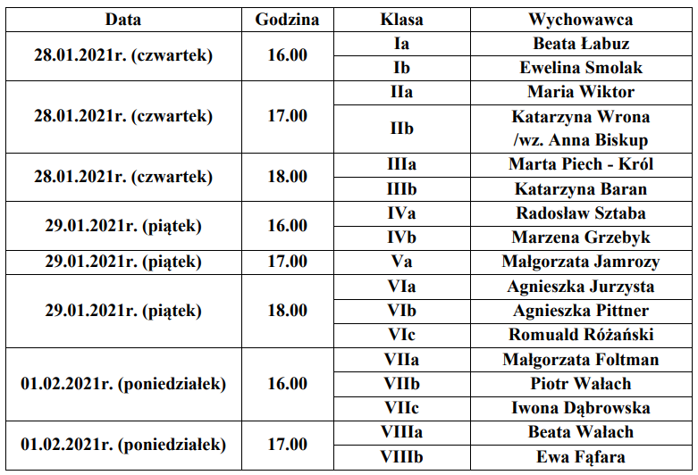 Uprzejmie informujemy, że spotkania wychowawców klas szkoły podstawowej z rodzicami będą odbywać się w formie zdalnej za pomocą aplikacji TEAMS wg harmonogramu zamieszczonego poniżej: