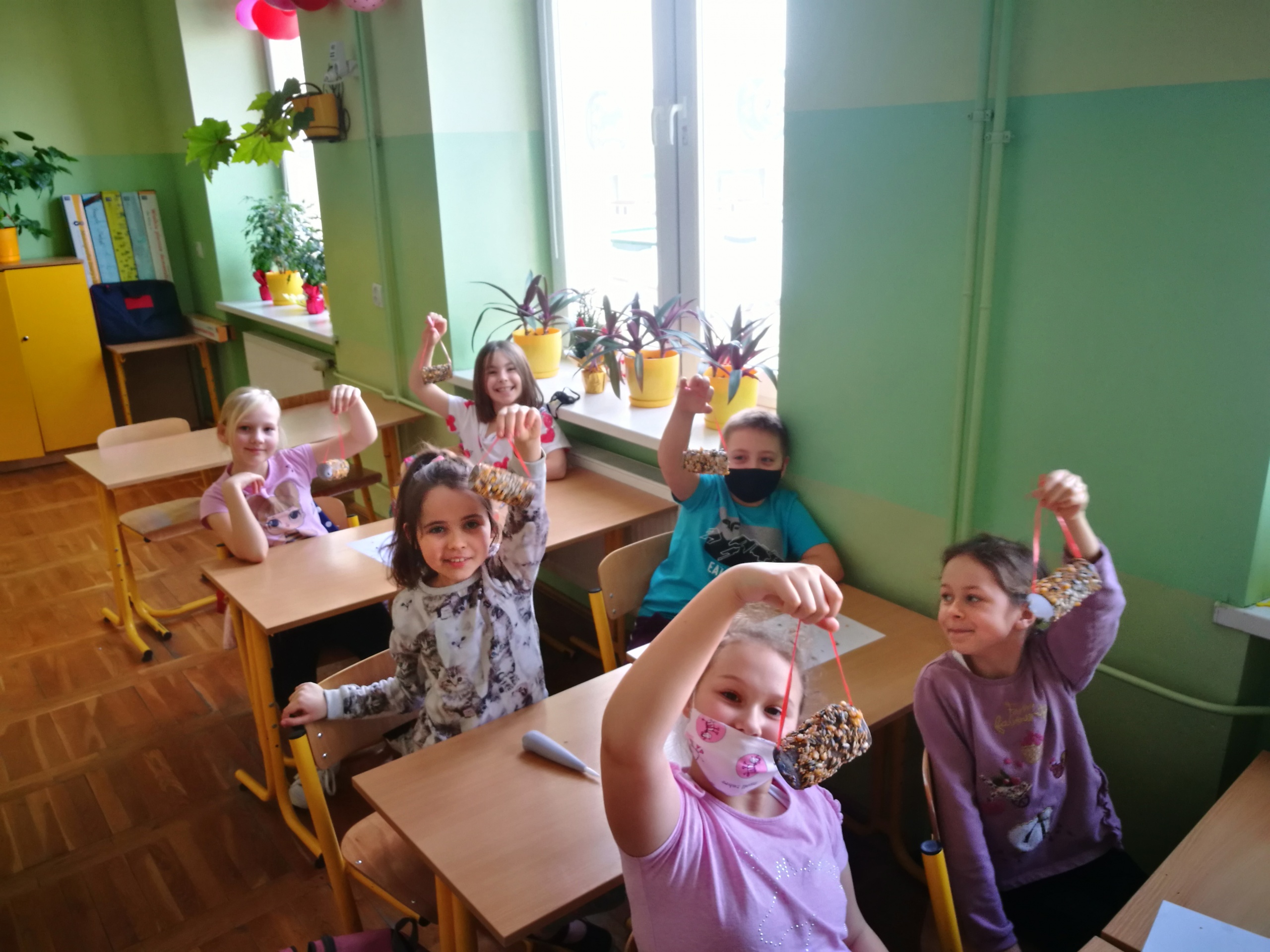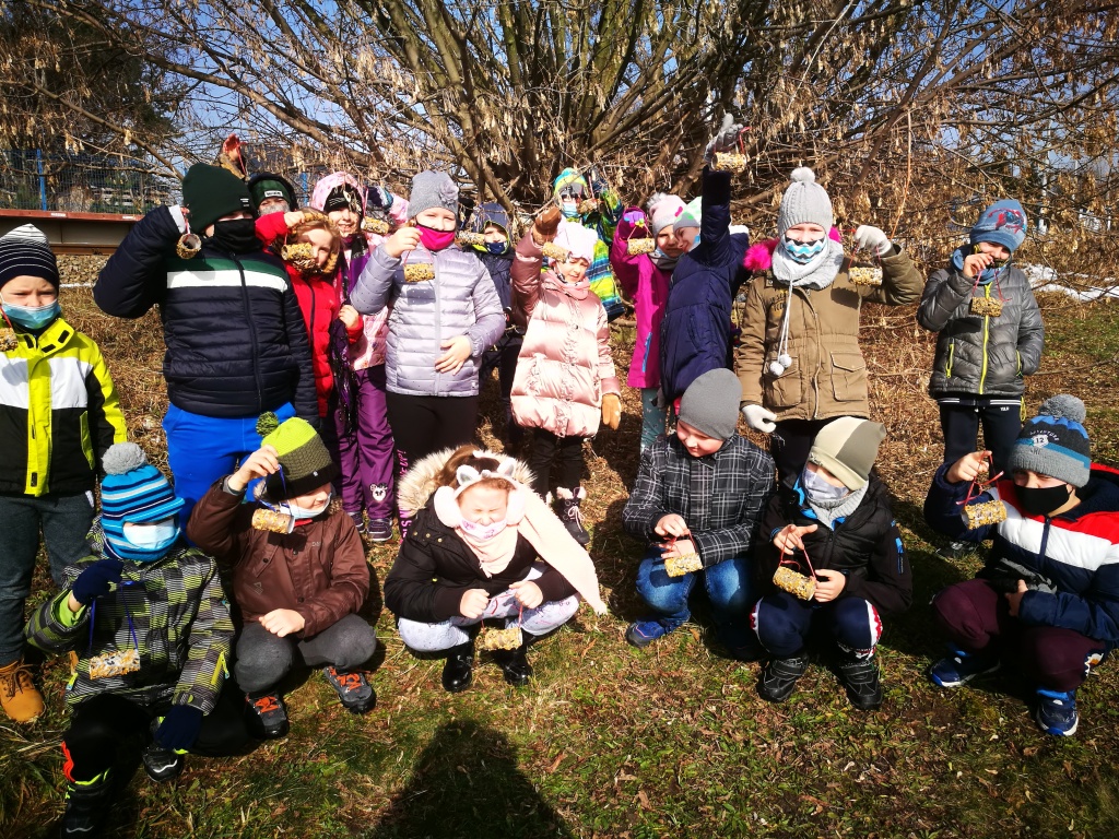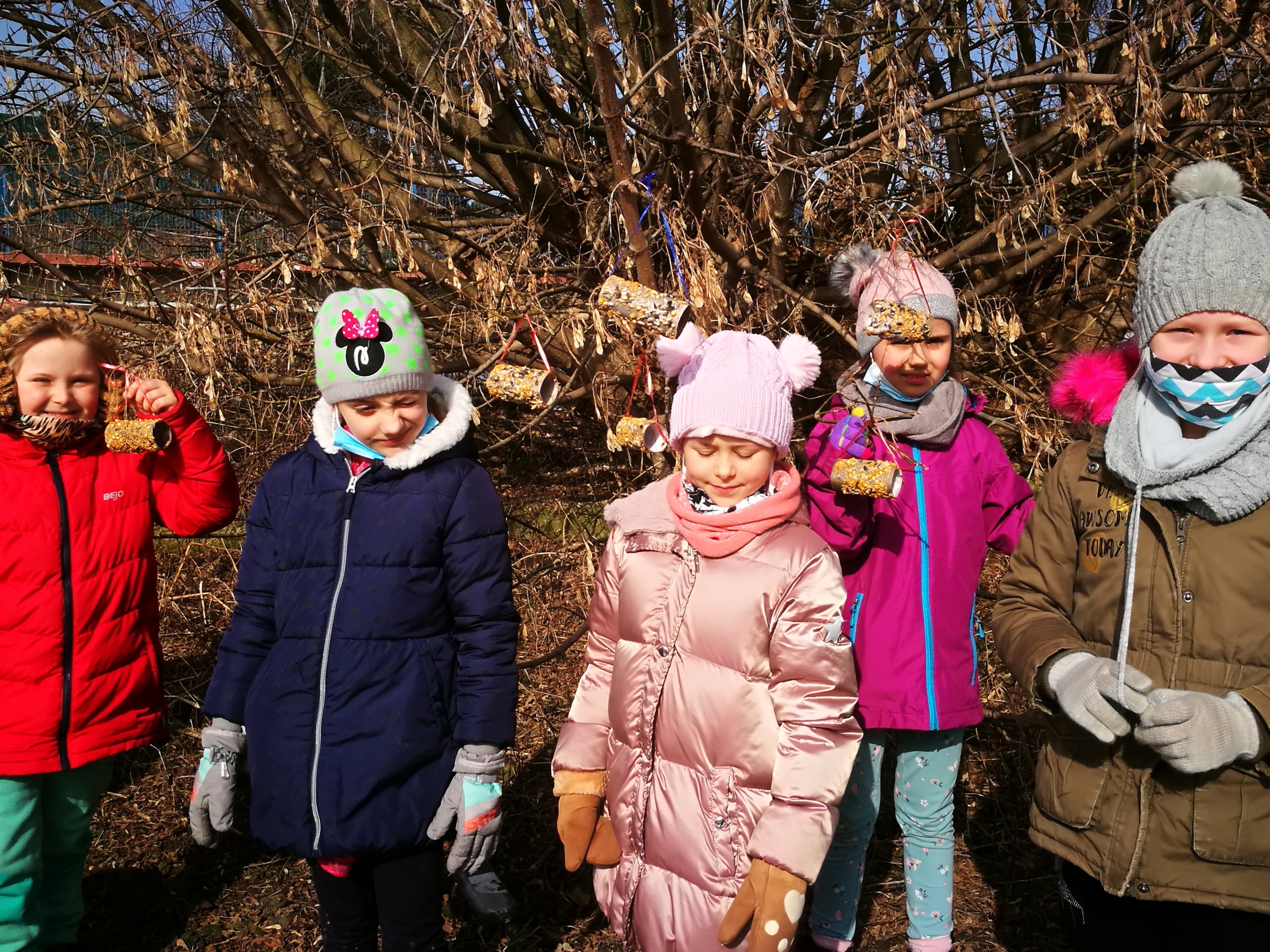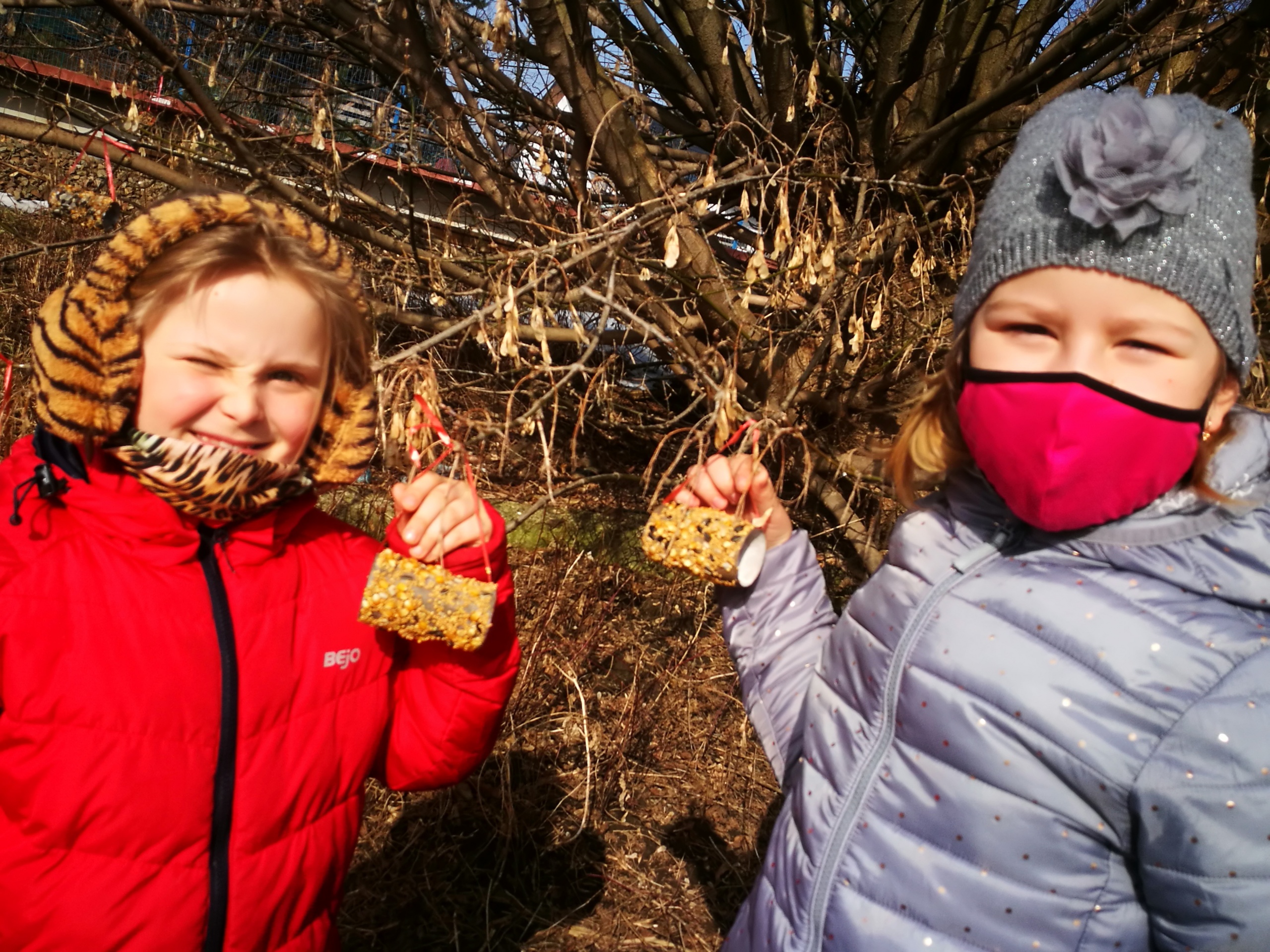 Podczas zajęć kreatywnych uczniowie klasy 2b samodzielnie wykonali karmniki dla ptaków. Do ich wykonania dzieci wykorzystały papierowe rolki, smalec, nasiona słonecznika, mieszankę ziaren, kukurydzę. Podczas spaceru uczniowie zawiesili je na pobliskim drzewie, by móc dokarmiać wygłodzone ptaki.