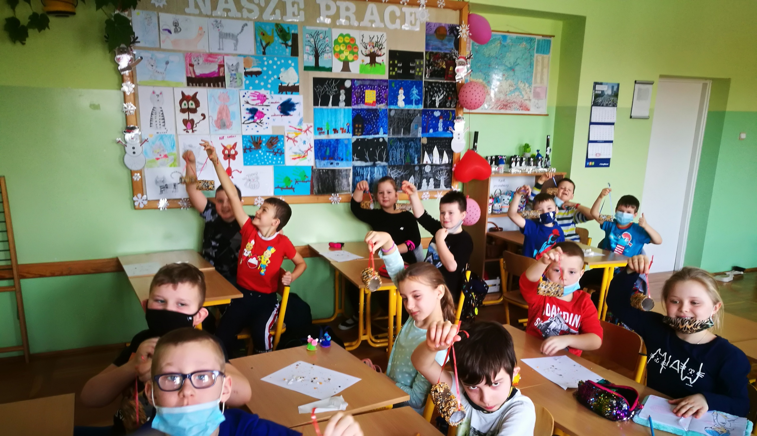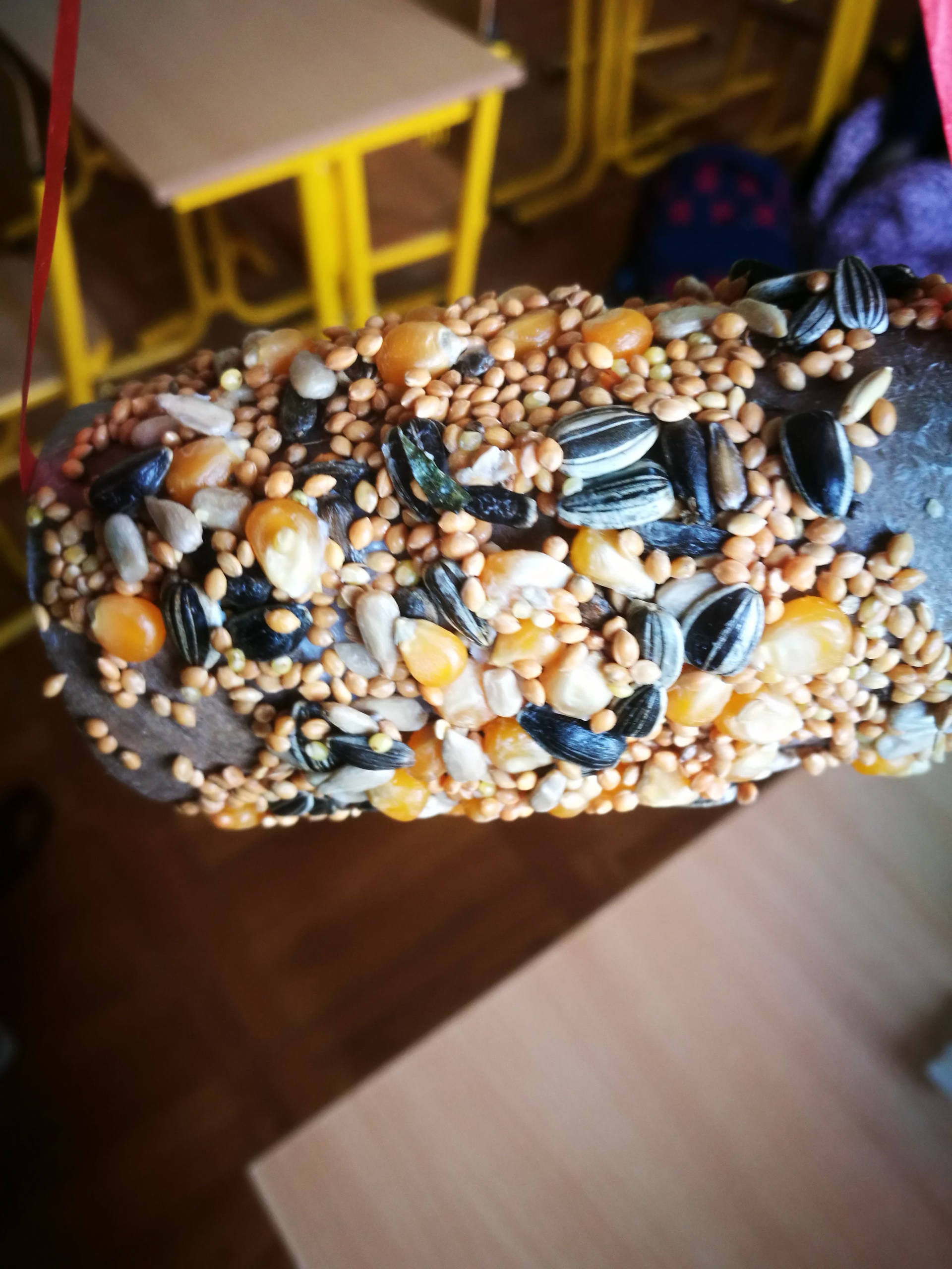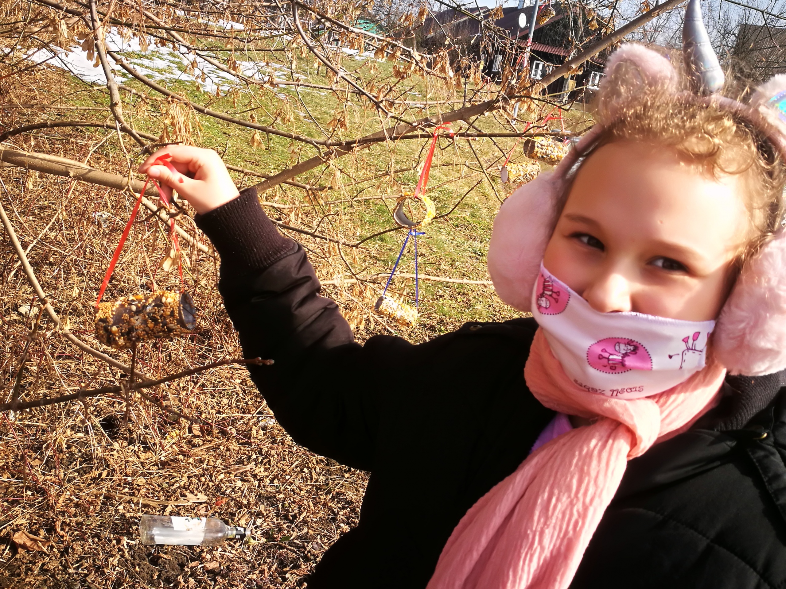 Podczas zajęć kreatywnych uczniowie klasy 2b samodzielnie wykonali karmniki dla ptaków. Do ich wykonania dzieci wykorzystały papierowe rolki, smalec, nasiona słonecznika, mieszankę ziaren, kukurydzę. Podczas spaceru uczniowie zawiesili je na pobliskim drzewie, by móc dokarmiać wygłodzone ptaki.