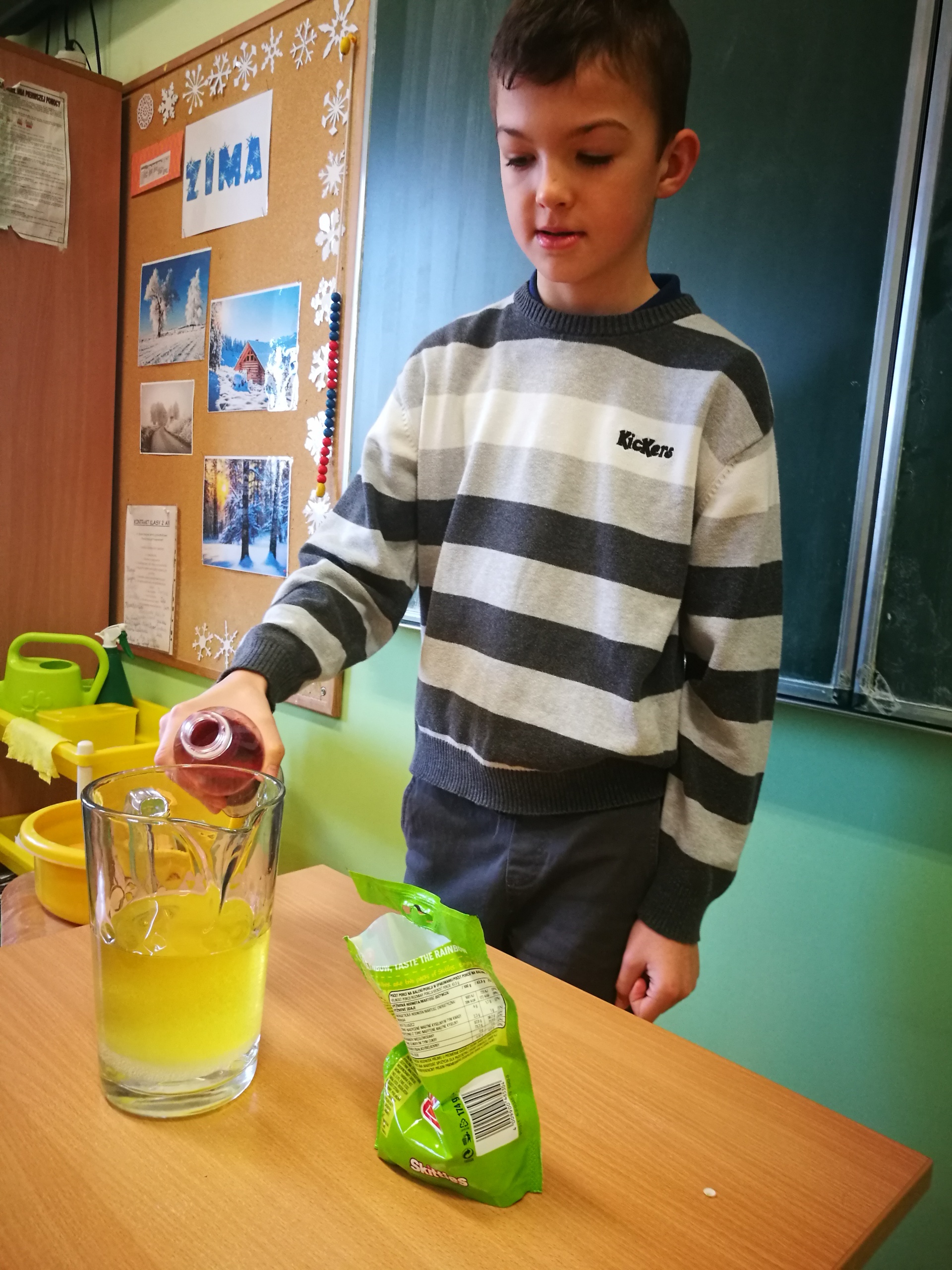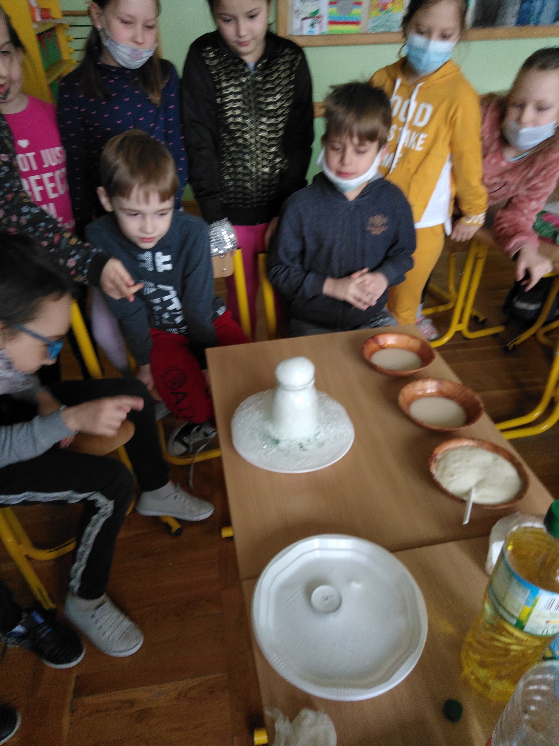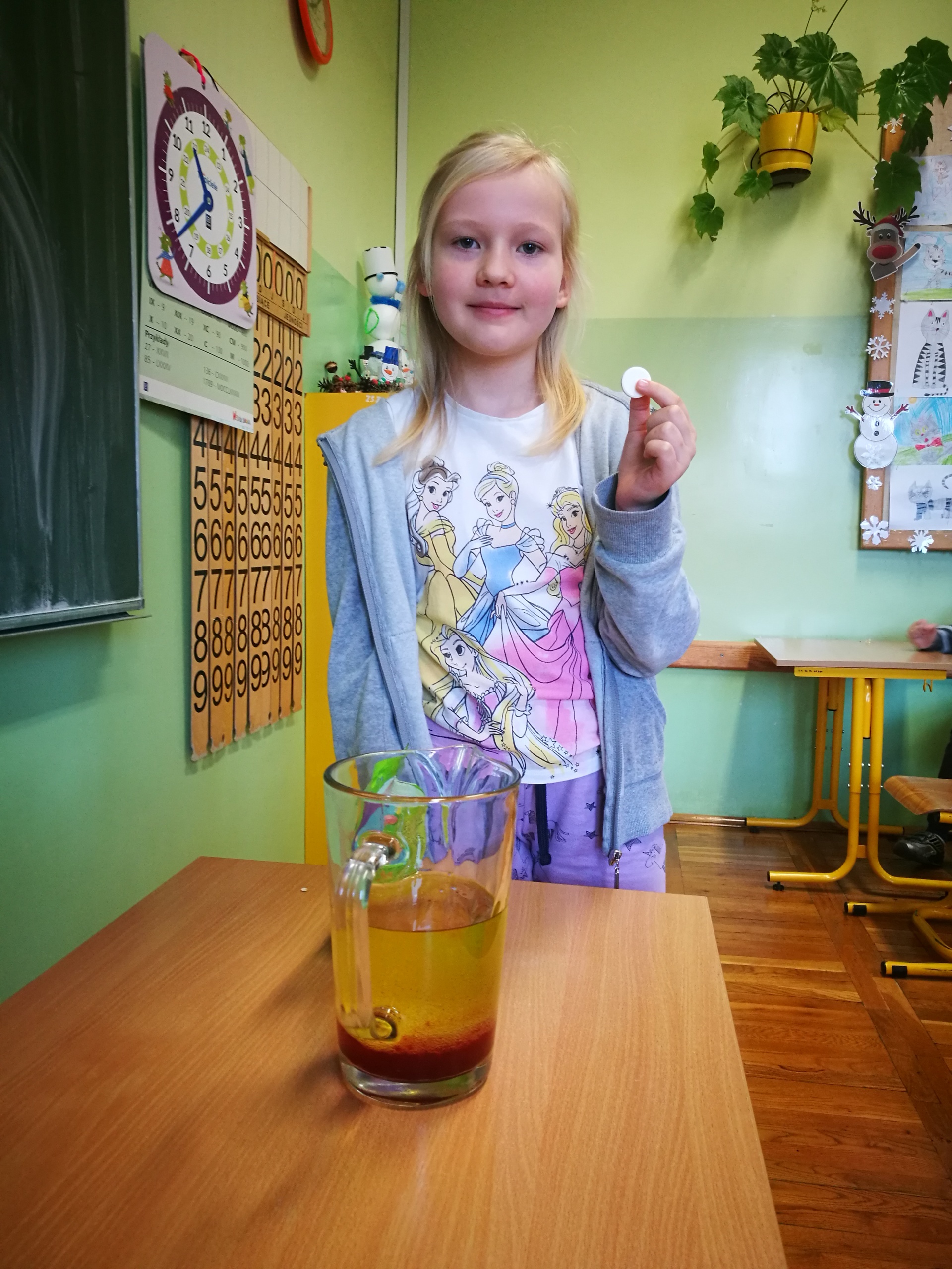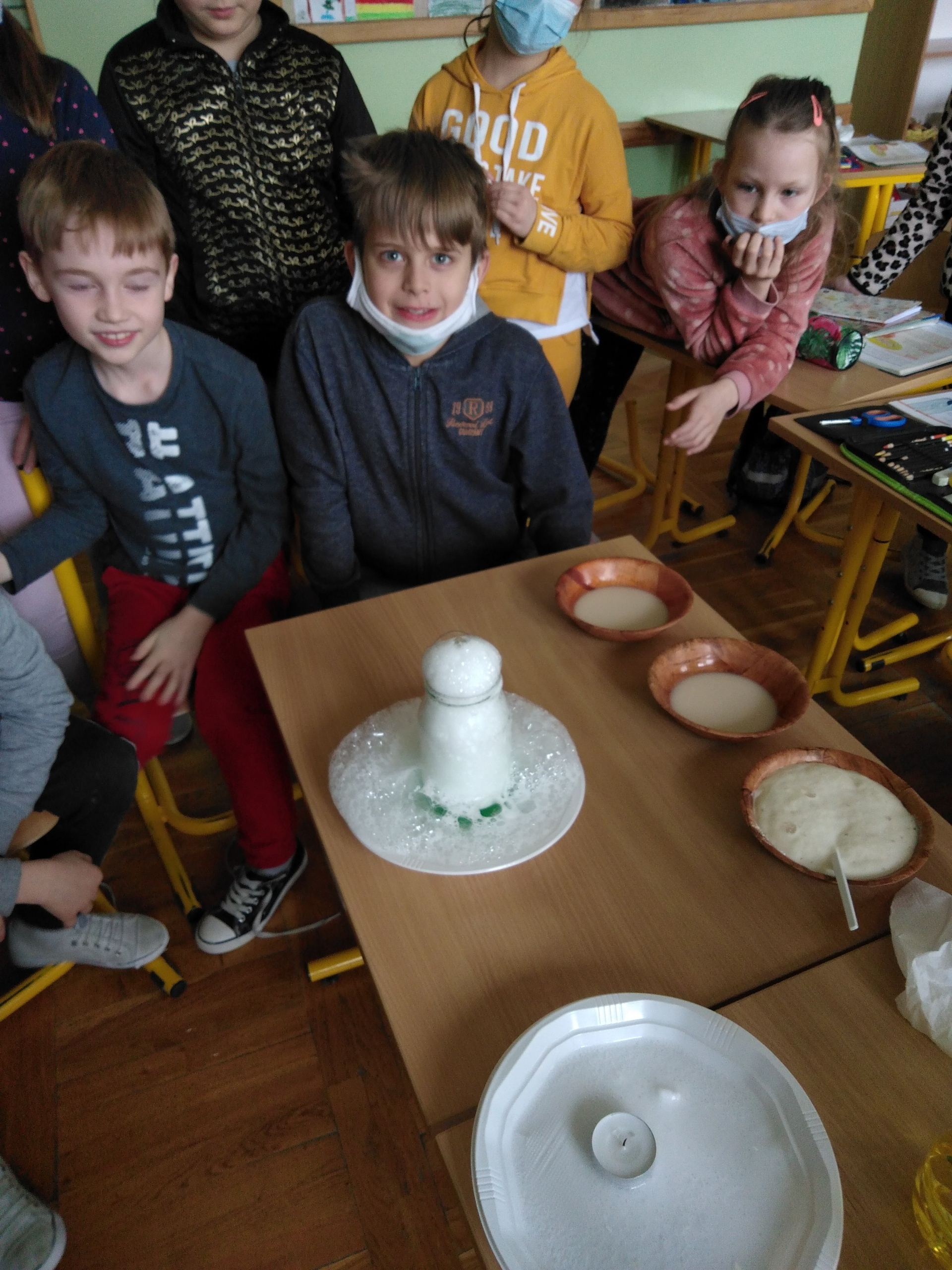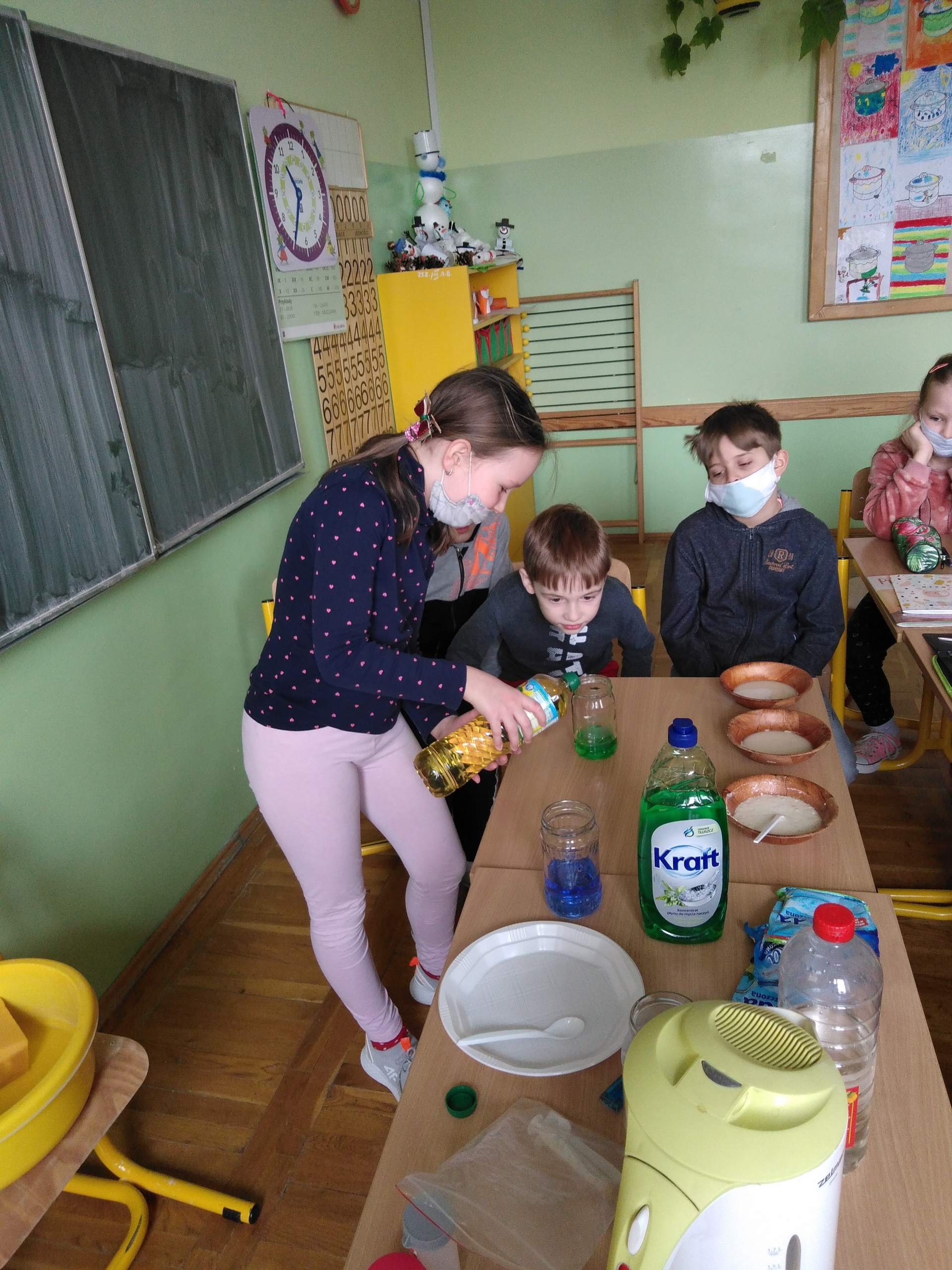 Uczniowie z klas 2a i 2b podczas zajęć poznawali tajniki chemii. Celem pokazu było rozbudzenie u dzieci ciekawości otaczającym światem przyrody, nauczenie ich prowadzenia obserwacji i wyciągania trafnych wniosków z przeprowadzonych doświadczeń oraz zachęcanie do eksperymentowania z rodzicami. O tym, że wiedza chemiczna może przydać się w codziennym życiu, a także dostarczyć ciekawej rozrywki, przekonali się uczniowie na zajęciach. Dzieci z zainteresowaniem obejrzały i pomagały przeprowadzić następujące eksperymenty: „Dlaczego ciasto rośnie?”, „Wulkan”, „Jak zrobić kolorowe warstwy w szklance?”, „Dlaczego świeczka gaśnie przykryta szklanką?”. Wszyscy stwierdzili, że doświadczenia są ciekawe i na pewno będą eksperymentować pod opieką rodziców.