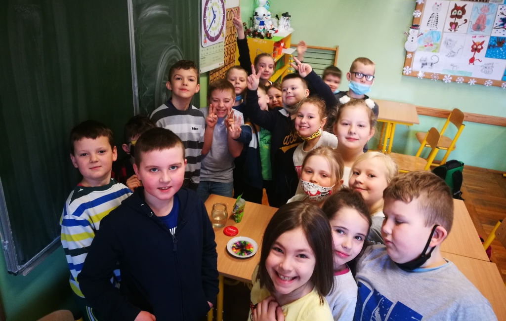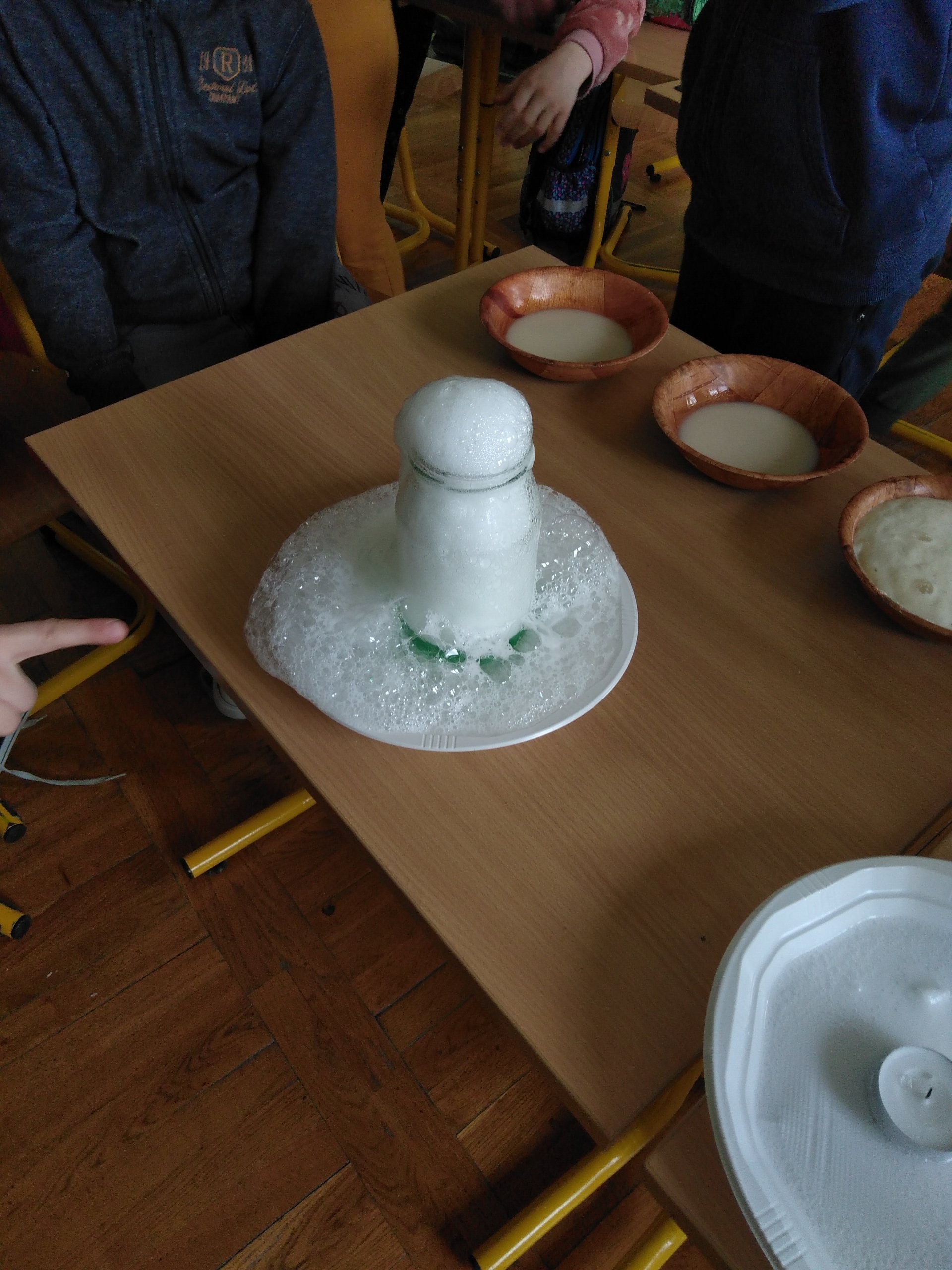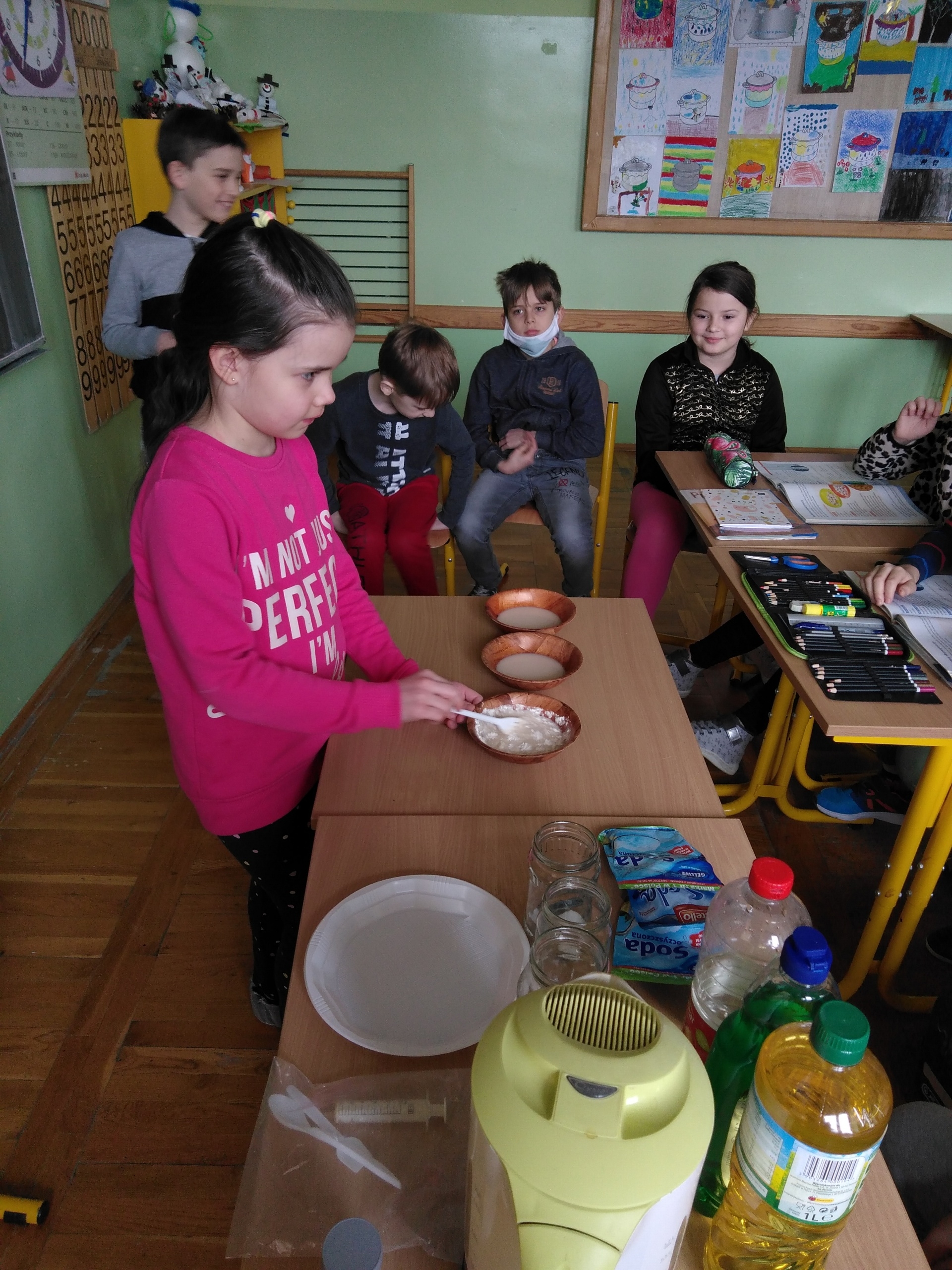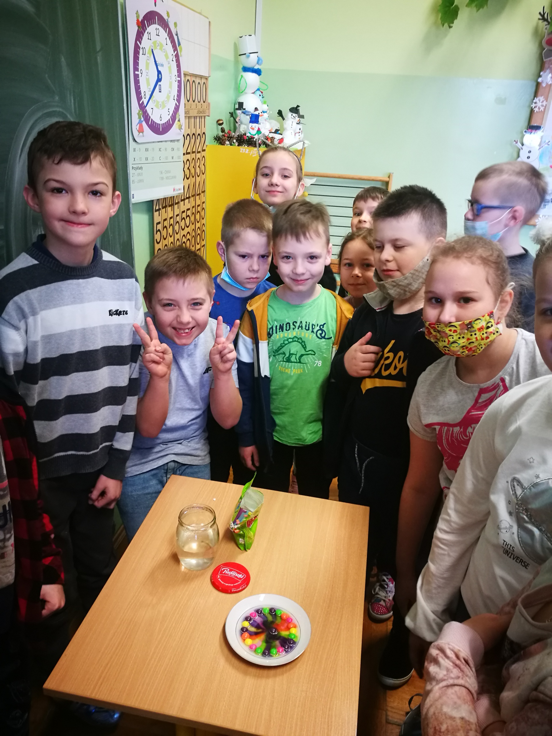 Uczniowie z klas 2a i 2b podczas zajęć poznawali tajniki chemii. Celem pokazu było rozbudzenie u dzieci ciekawości otaczającym światem przyrody, nauczenie ich prowadzenia obserwacji i wyciągania trafnych wniosków z przeprowadzonych doświadczeń oraz zachęcanie do eksperymentowania z rodzicami. O tym, że wiedza chemiczna może przydać się w codziennym życiu, a także dostarczyć ciekawej rozrywki, przekonali się uczniowie na zajęciach. Dzieci z zainteresowaniem obejrzały i pomagały przeprowadzić następujące eksperymenty: „Dlaczego ciasto rośnie?”, „Wulkan”, „Jak zrobić kolorowe warstwy w szklance?”, „Dlaczego świeczka gaśnie przykryta szklanką?”. Wszyscy stwierdzili, że doświadczenia są ciekawe i na pewno będą eksperymentować pod opieką rodziców.