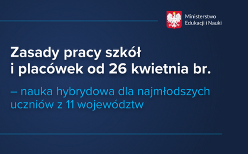 Od poniedziałku, 26 kwietnia lekcje w systemie hybrydowym w klasach I-III w szkołach podstawowych będą mieli uczniowie w 11 województwach: zachodniopomorskim, pomorskim, warmińsko-mazurskim, lubuskim, kujawsko-pomorskim, mazowieckim, podlaskim, świętokrzyskim, lubelskim, podkarpackim, małopolskim. Uczniowie z pozostałych klas będą się uczyć jak dotychczas – zdalnie.