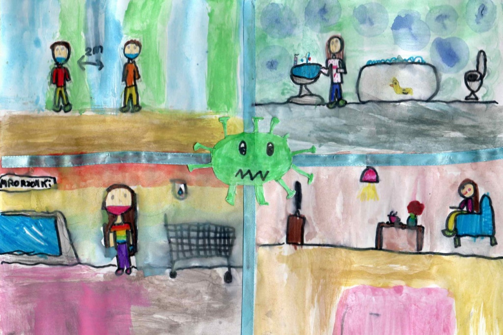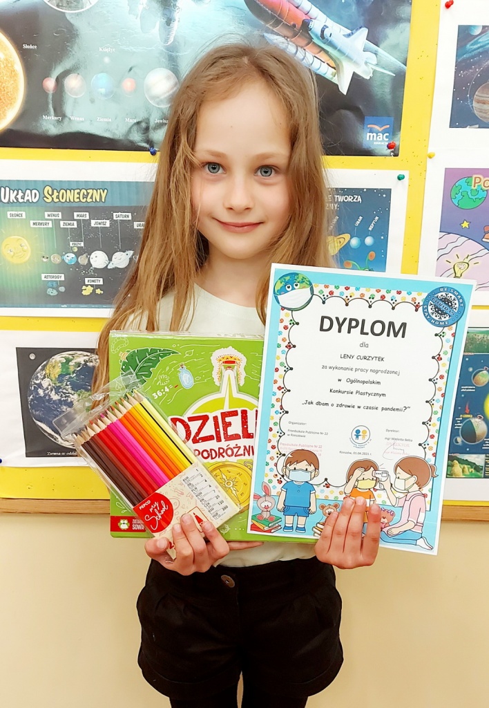 Serdecznie gratulujemy kolejnego sukcesu Lence Curzytek. Tym razem dziewczynka z grupy Słoneczek została nagrodzona w Ogólnopolskim Konkursie Plastycznym “Jak dbam o zdrowie w czasie pandemii?”, zorganizowanym przez Przedszkole Publiczne nr 2 w Rzeszowie. W swojej pracy Lenka pięknie zaprezentowała zasady, których należy przestrzegać, by chronić się przez koronawirusem.