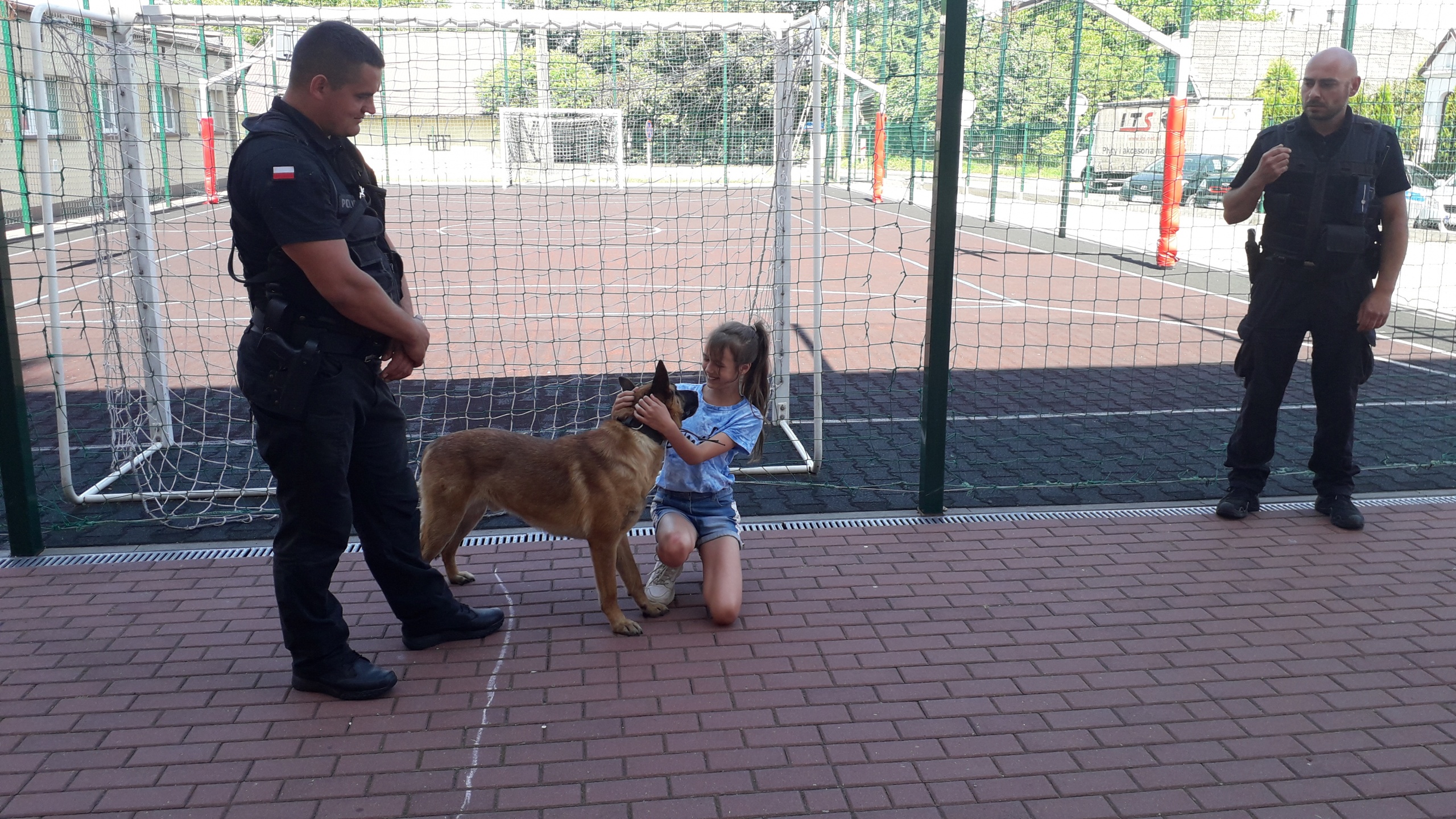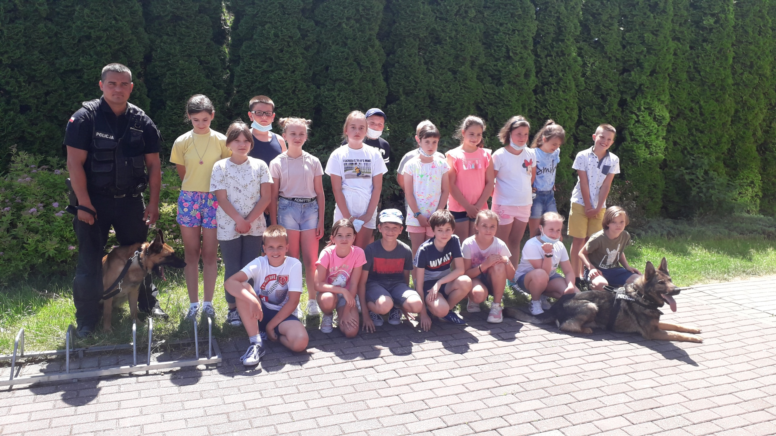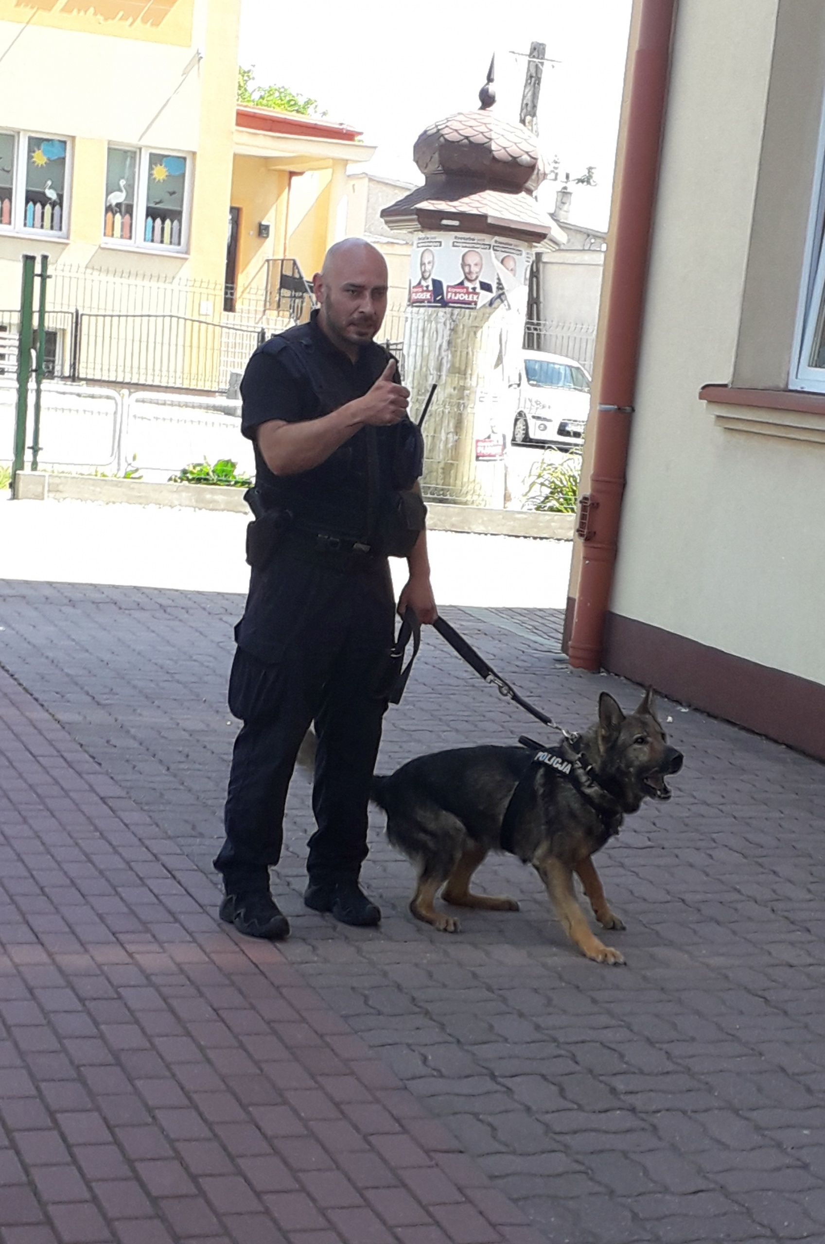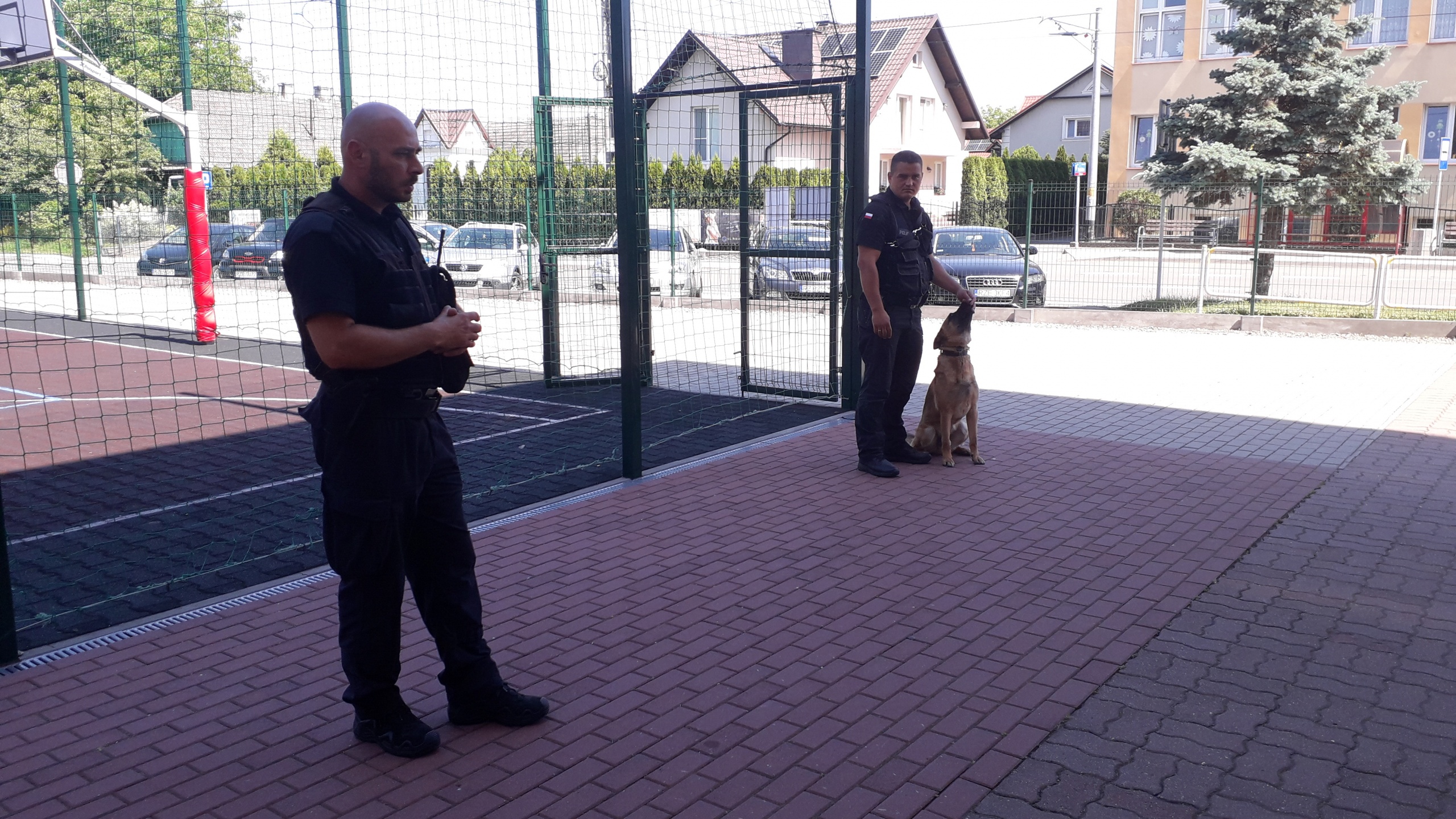 21 czerwca, tuż przed zakończeniem roku szkolnego, klasy 4a i 4b uczestniczyły w spotkaniu z policjantami przewodnikami psów. Panowie przypomnieli dzieciom zasady, do których należy się stosować podczas letniego wypoczynku, a także wskazali, jak należy zachowywać się w sytuacjach zagrożenia. Najmilszą częścią odwiedzin była prezentacja dwóch psów – Alfa i Lobo, które pokazały robiące wielkie wrażenie umiejętności, jeden z nich brał udział w przeciąganiu liny, a nawet “latał”.
