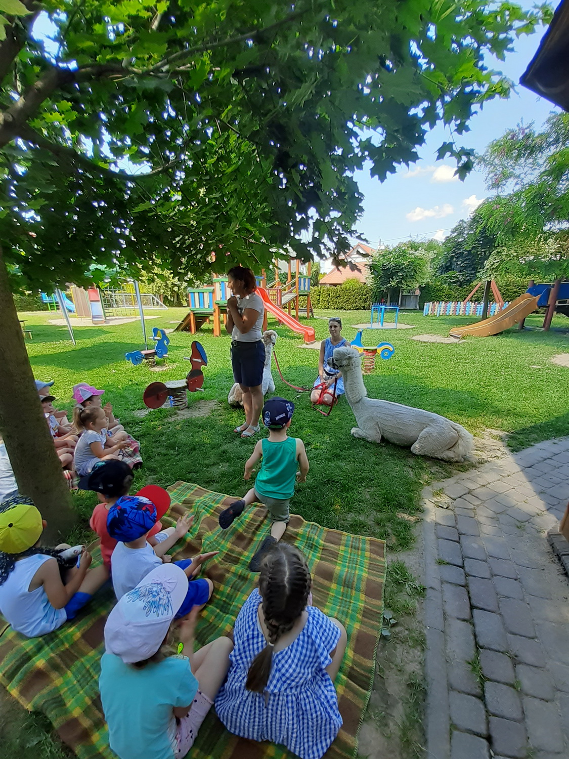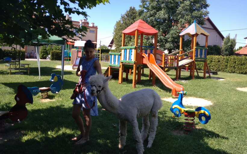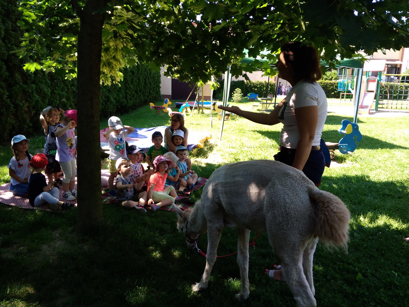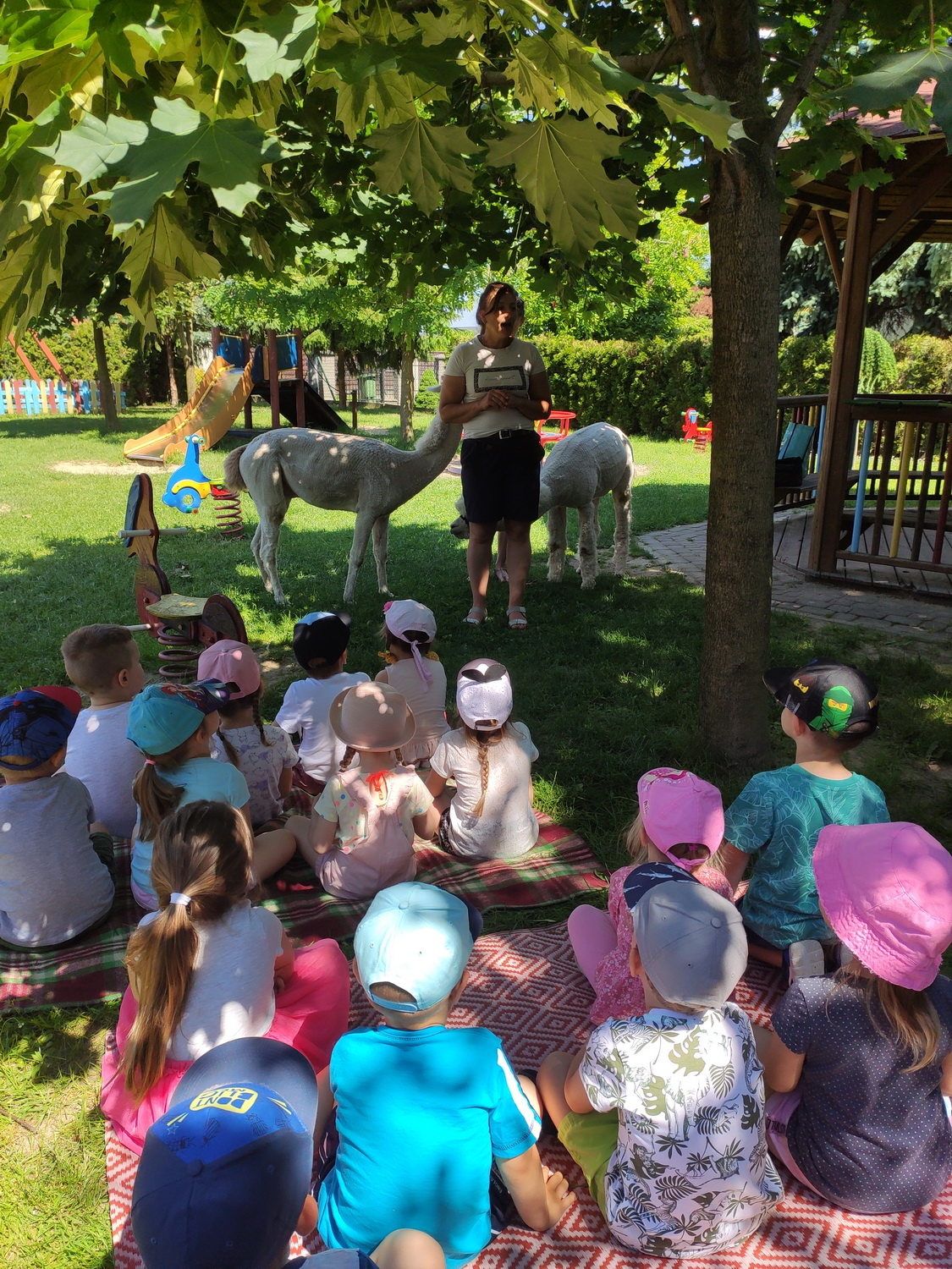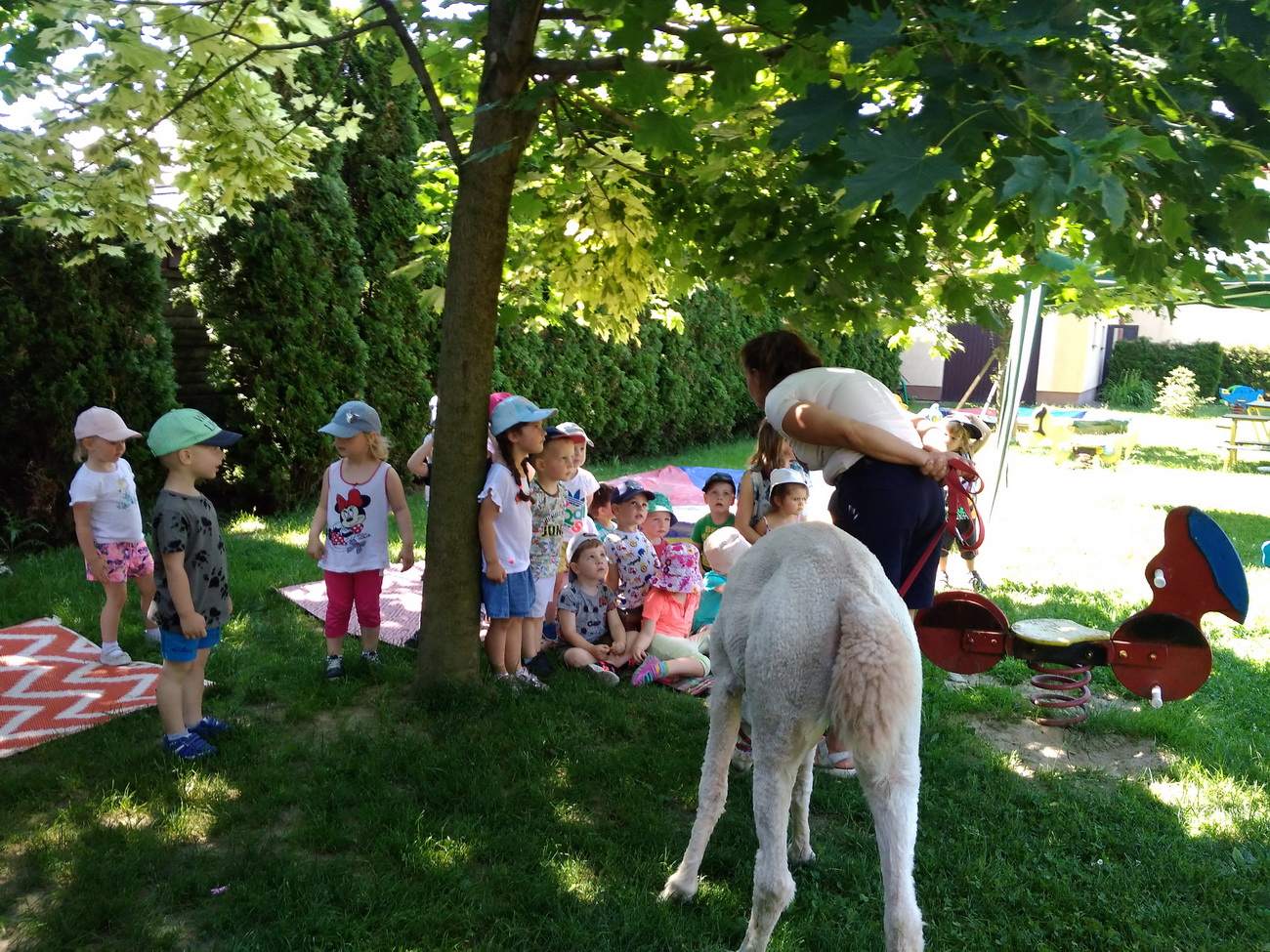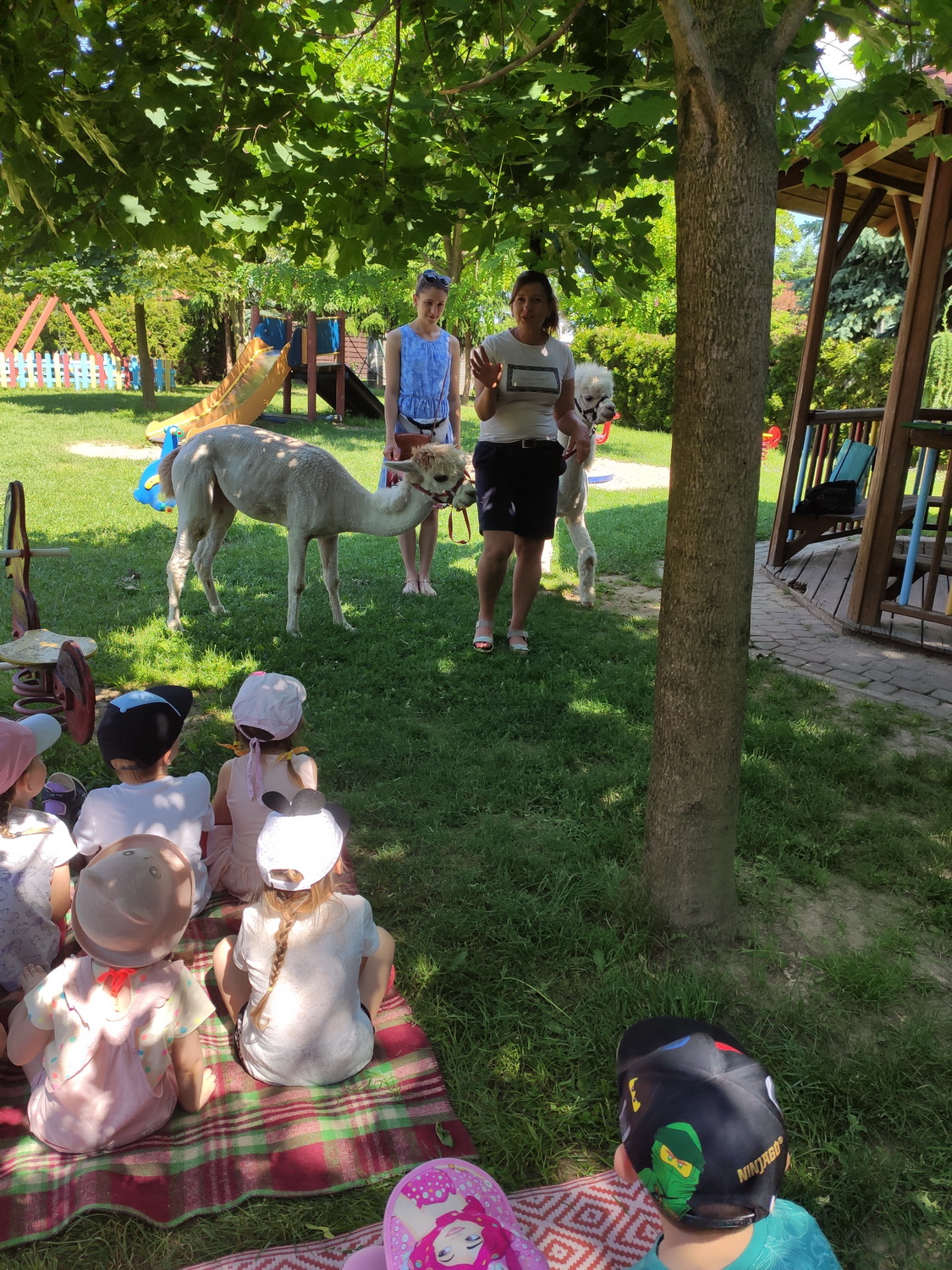 W piątek, 18 czerwca gościliśmy w naszej placówce alpaki. Henio i Miki rozgościli się w naszym ogrodzie przedszkolnym. Na początku p. Ewa, opiekunka zwierząt, opowiedziała wiele ciekawostek z ich życia. Alpaki to inteligentne i łagodne zwierzęta, które szczególnie pozytywnie nastawione są do dzieci. Przedszkolaki z grup: Biedronki, Tygryski oraz Smerfy dowiedziały się, że alpaki nie mają górnych zębów i nie mogą ugryźć, dlatego bez większych obaw częstowały je pokrojonymi w plasterki marchewkami!