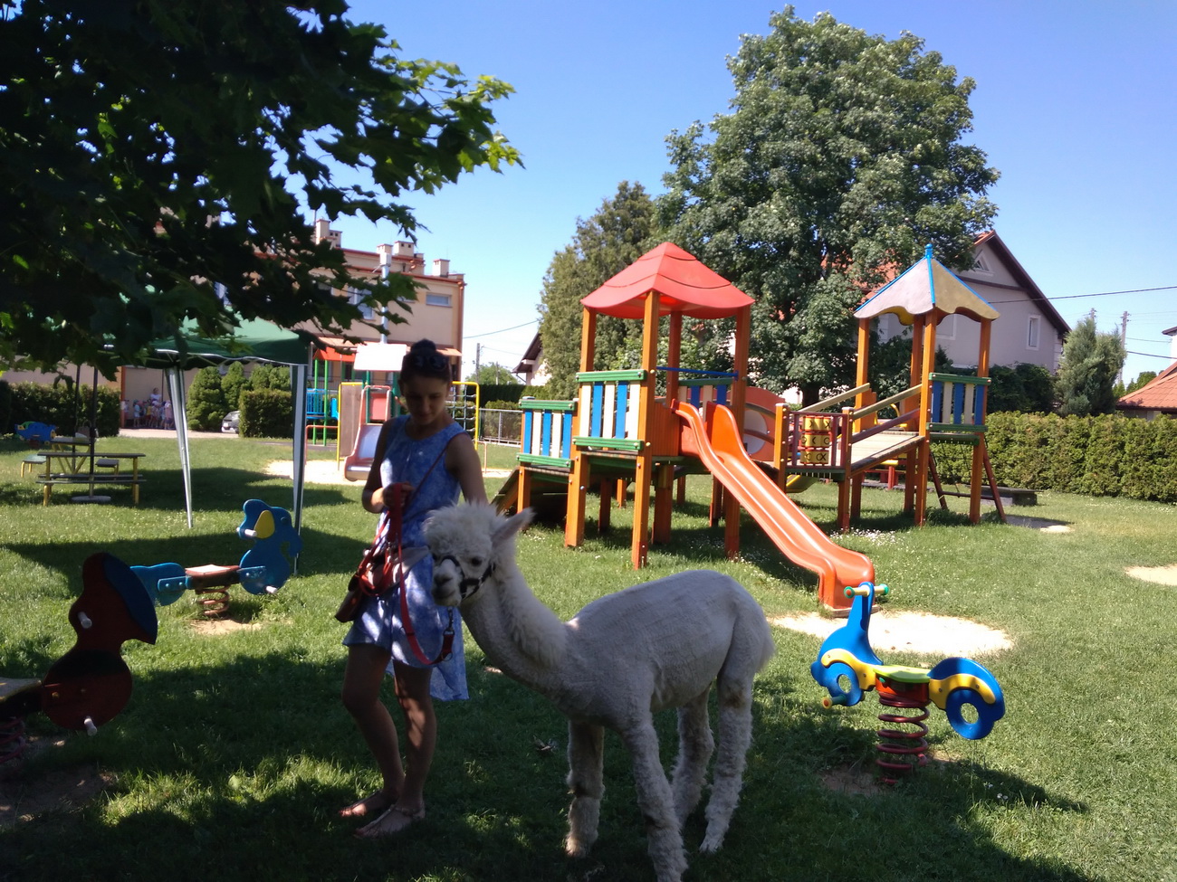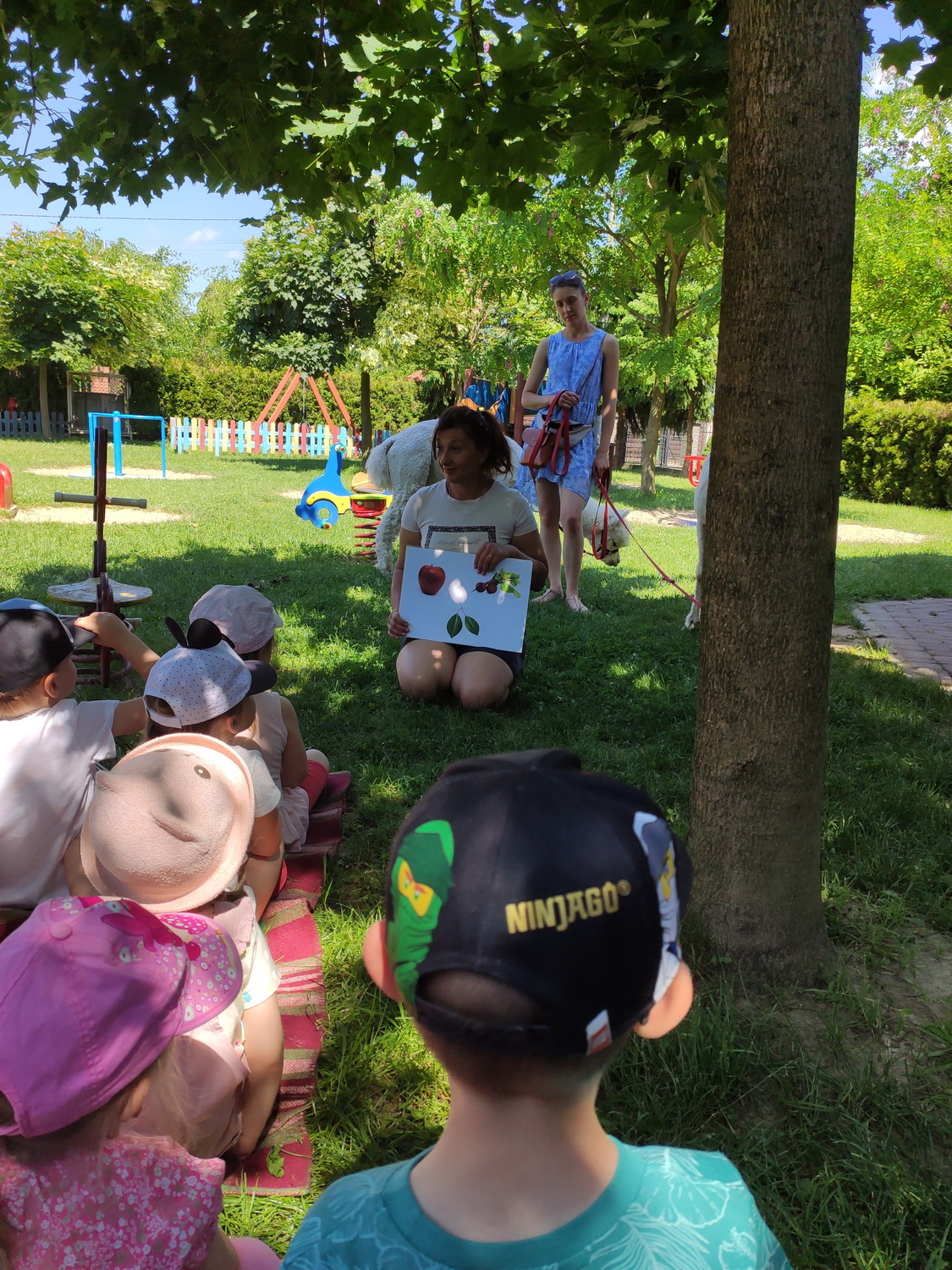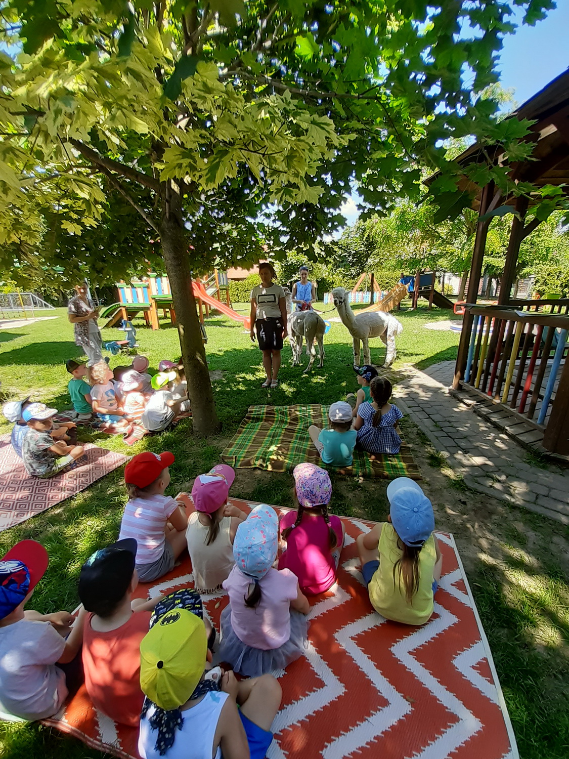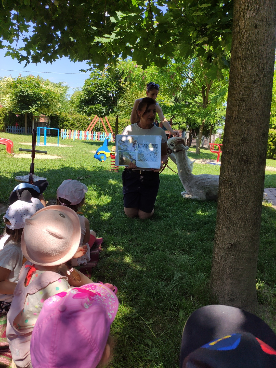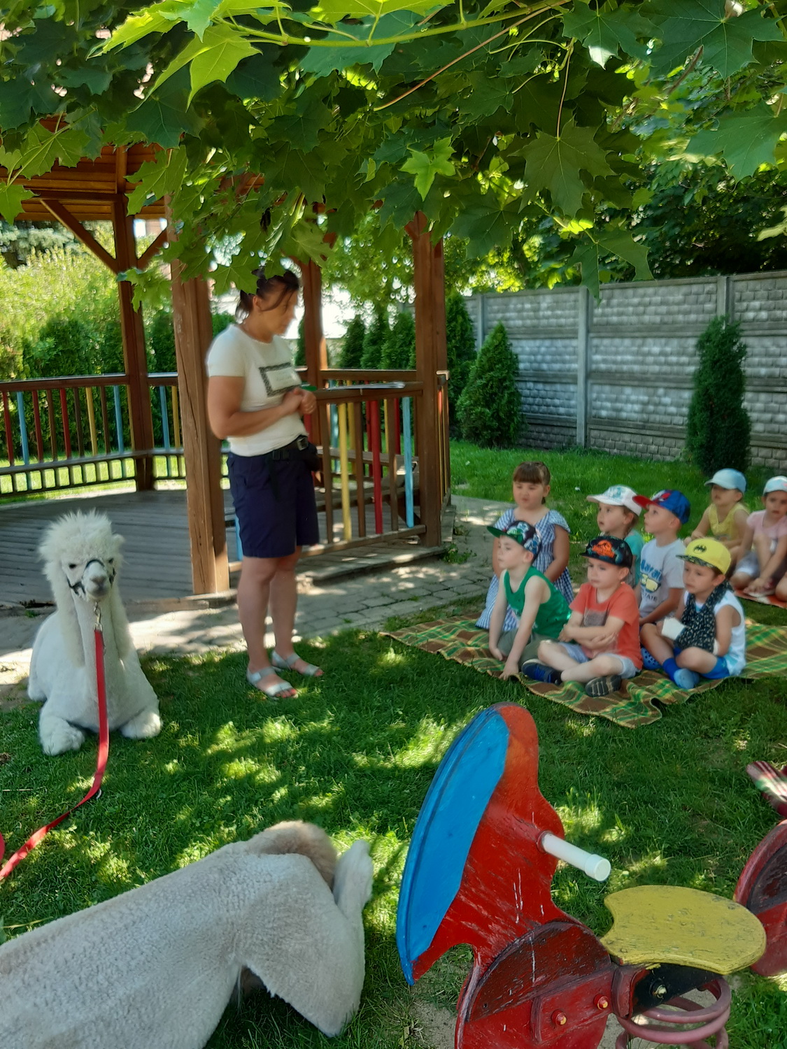 W piątek, 18 czerwca gościliśmy w naszej placówce alpaki. Henio i Miki rozgościli się w naszym ogrodzie przedszkolnym. Na początku p. Ewa, opiekunka zwierząt, opowiedziała wiele ciekawostek z ich życia. Alpaki to inteligentne i łagodne zwierzęta, które szczególnie pozytywnie nastawione są do dzieci. Przedszkolaki z grup: Biedronki, Tygryski oraz Smerfy dowiedziały się, że alpaki nie mają górnych zębów i nie mogą ugryźć, dlatego bez większych obaw częstowały je pokrojonymi w plasterki marchewkami!