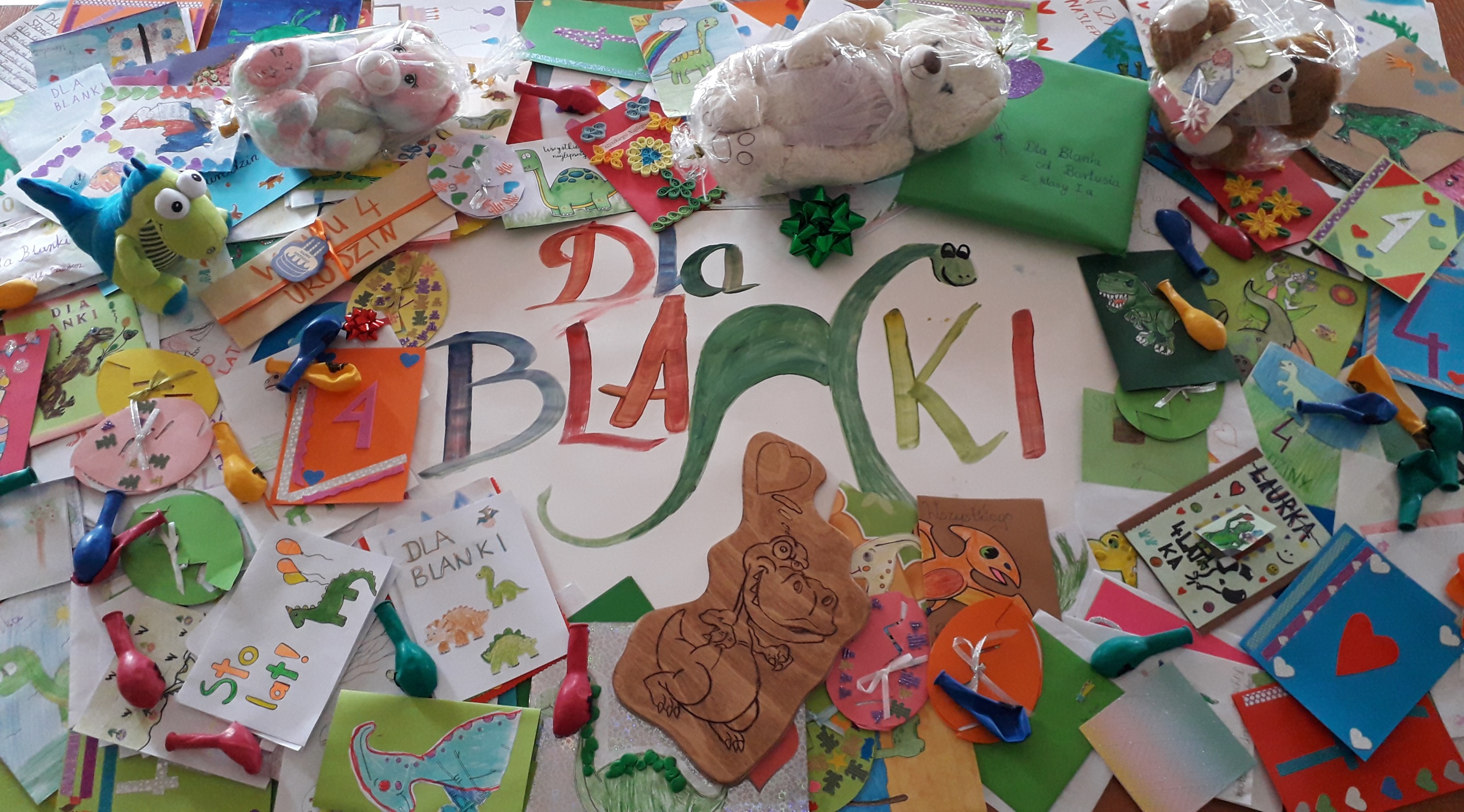 W ciągu tygodnia trwania tej akcji otrzymaliśmy ponad 200 laurek z życzeniami dla dziewczynki. Prace wykonywały dzieci z przedszkola oraz uczniowie klas 4-8 szkoły podstawowej. Na kartkach dominował ulubiony motyw dziewczynki, czyli dinozaury. Wszyscy wykazali się wielką pomysłowością podczas tworzenia kartek, a zawarte w nich życzenia płynęły prosto z serca.