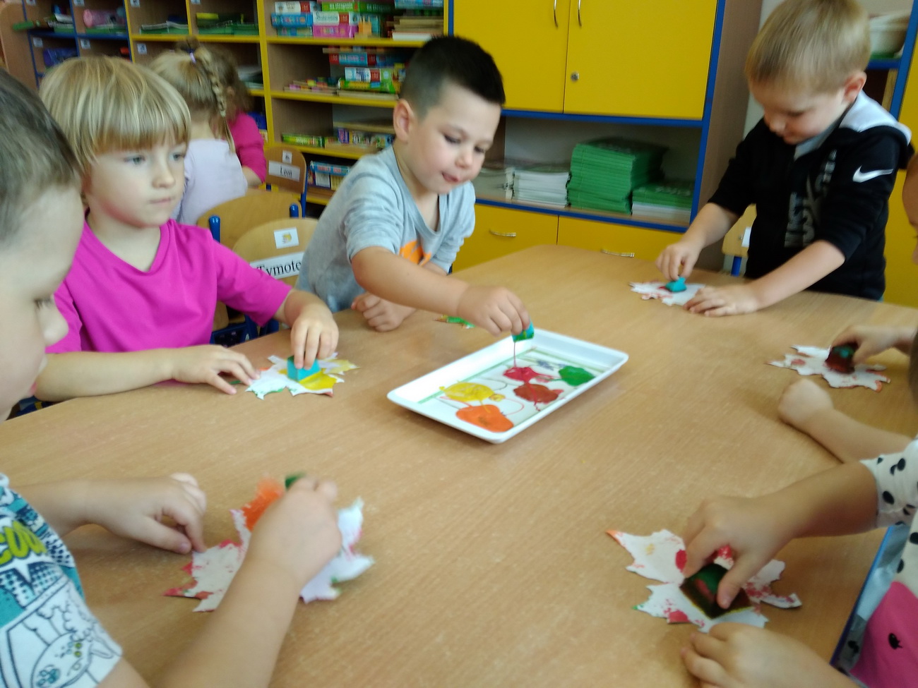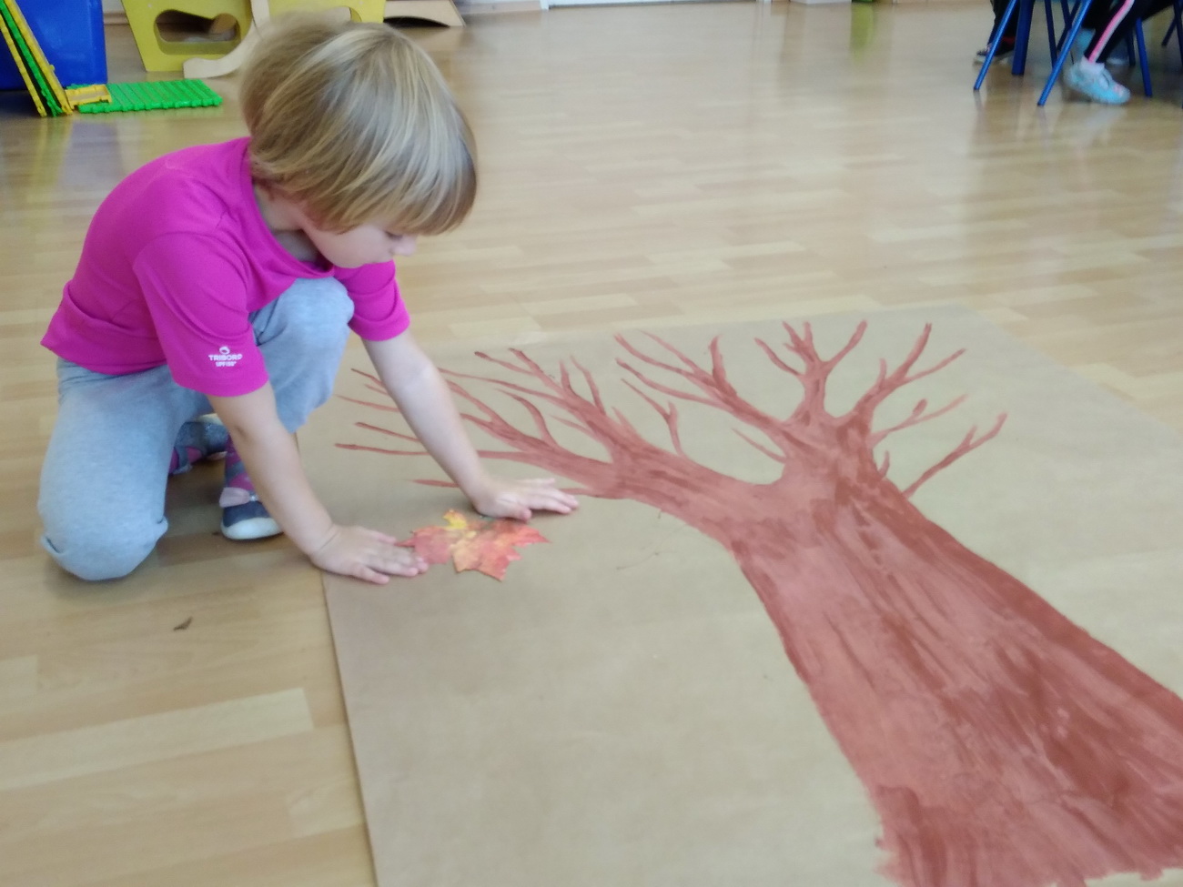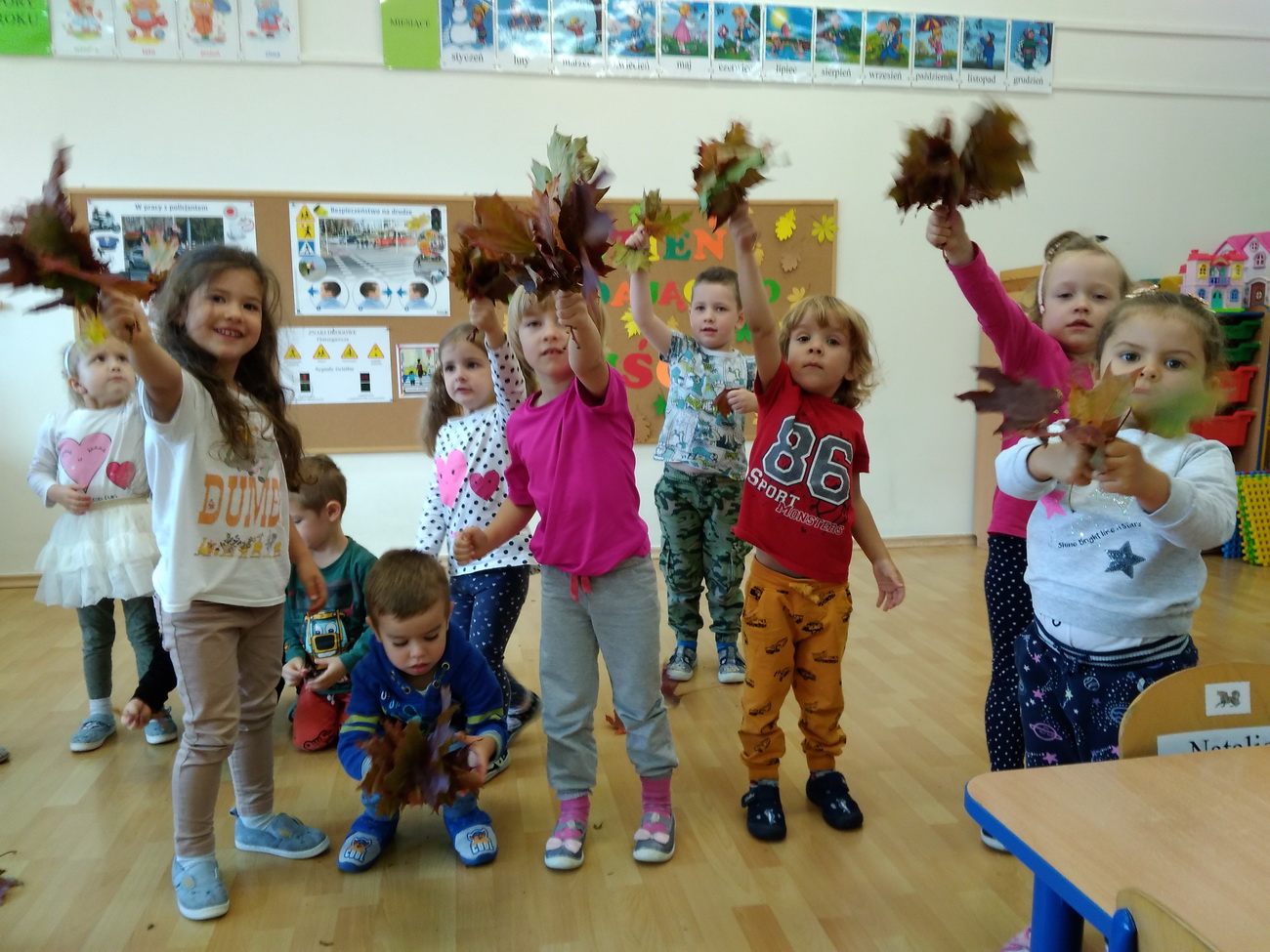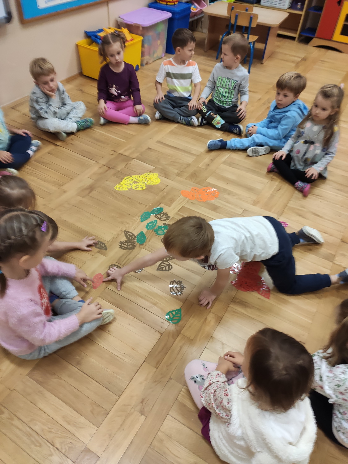 W tym dniu rozmawialiśmy nie tylko o oznakach nowej pory roku, ale także o liściach – jakie mają kształty, jakie są ich rodzaje, jakie kolory przybierają jesienią, porównywaliśmy wielkość liści przyniesionych do sali, odgadywaliśmy nazwy drzew, z których już spadły. Podzieliliśmy liście według kolorów, kształtów i wielkości, sprawdziliśmy co szybciej spada – podrzucony do góry liść czy klocek. Nie zabrakło także spaceru połączonego z obserwacją zmian zachodzących w przyrodzie. Uwieńczeniem zajęć było wykonanie prac plastycznych.