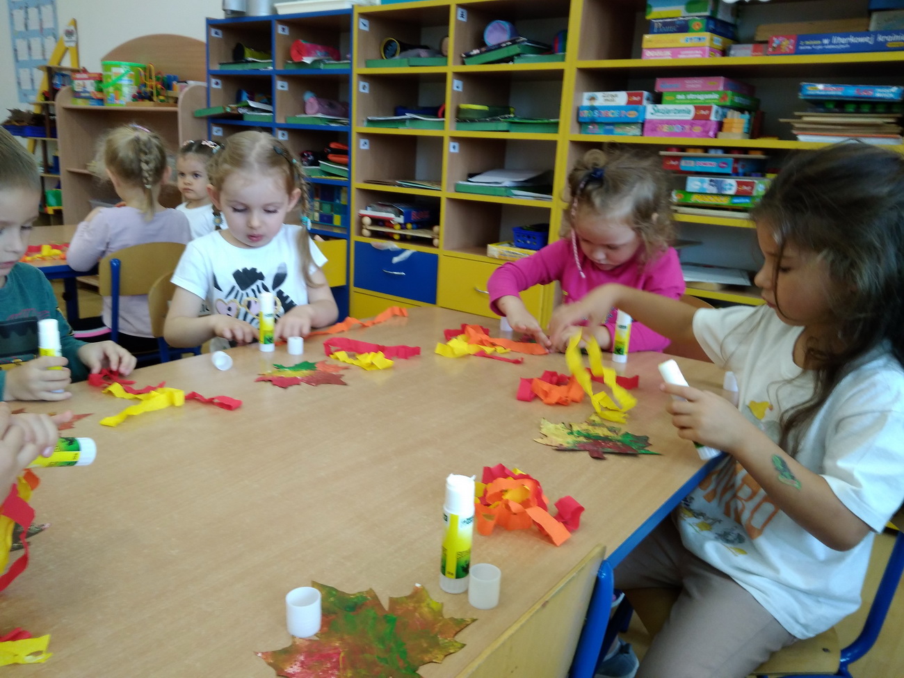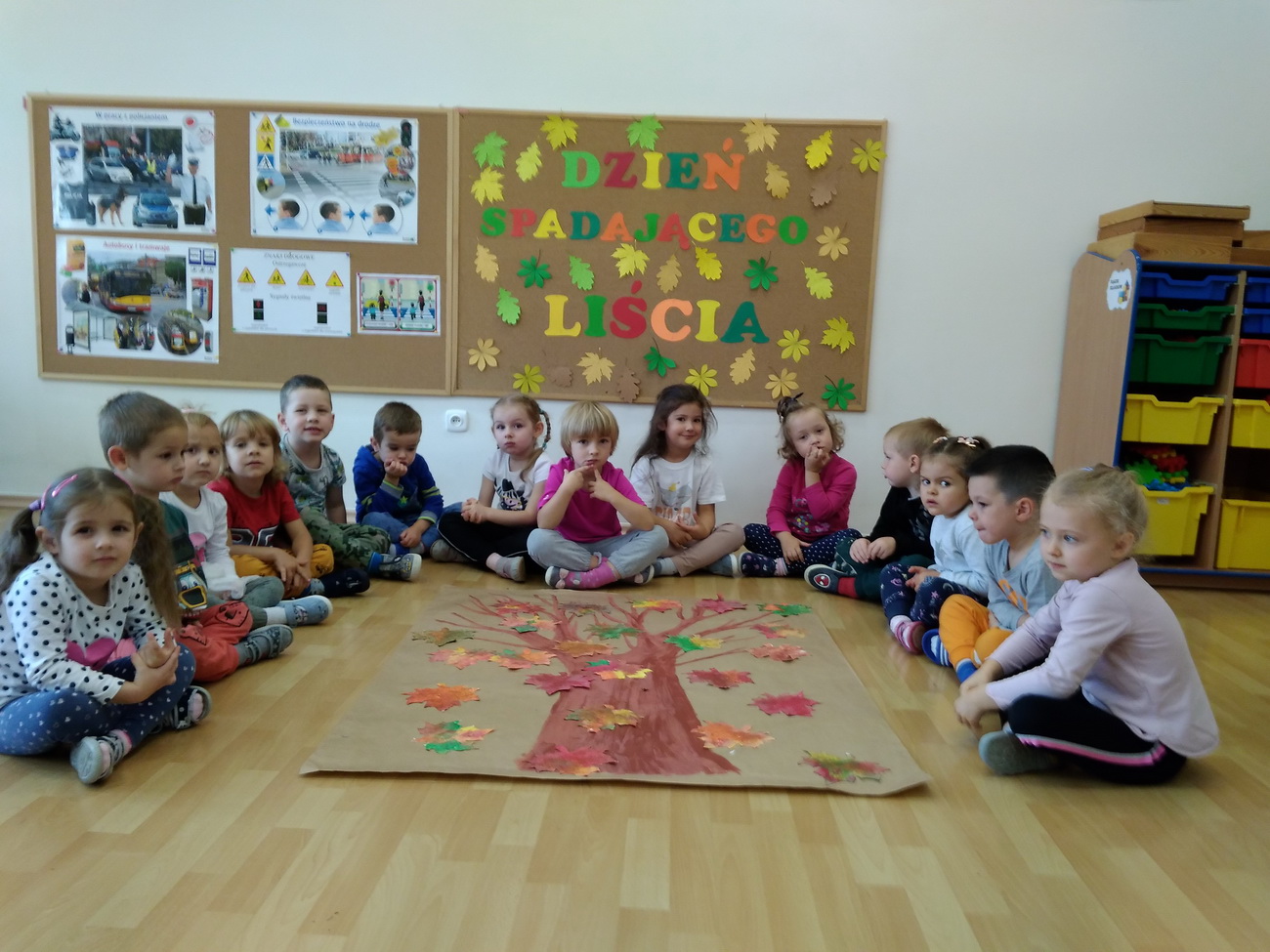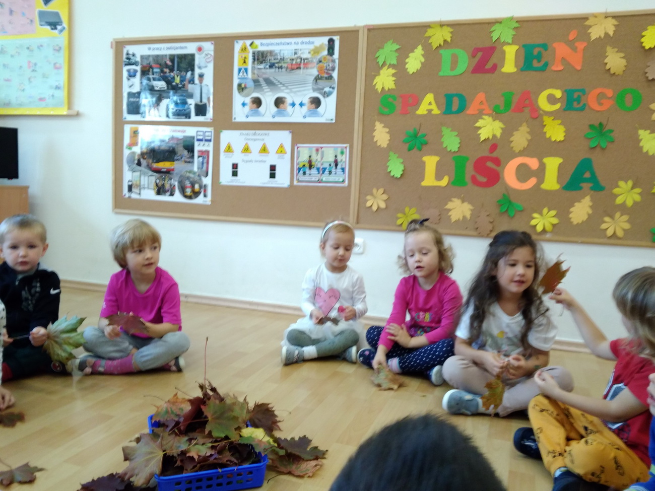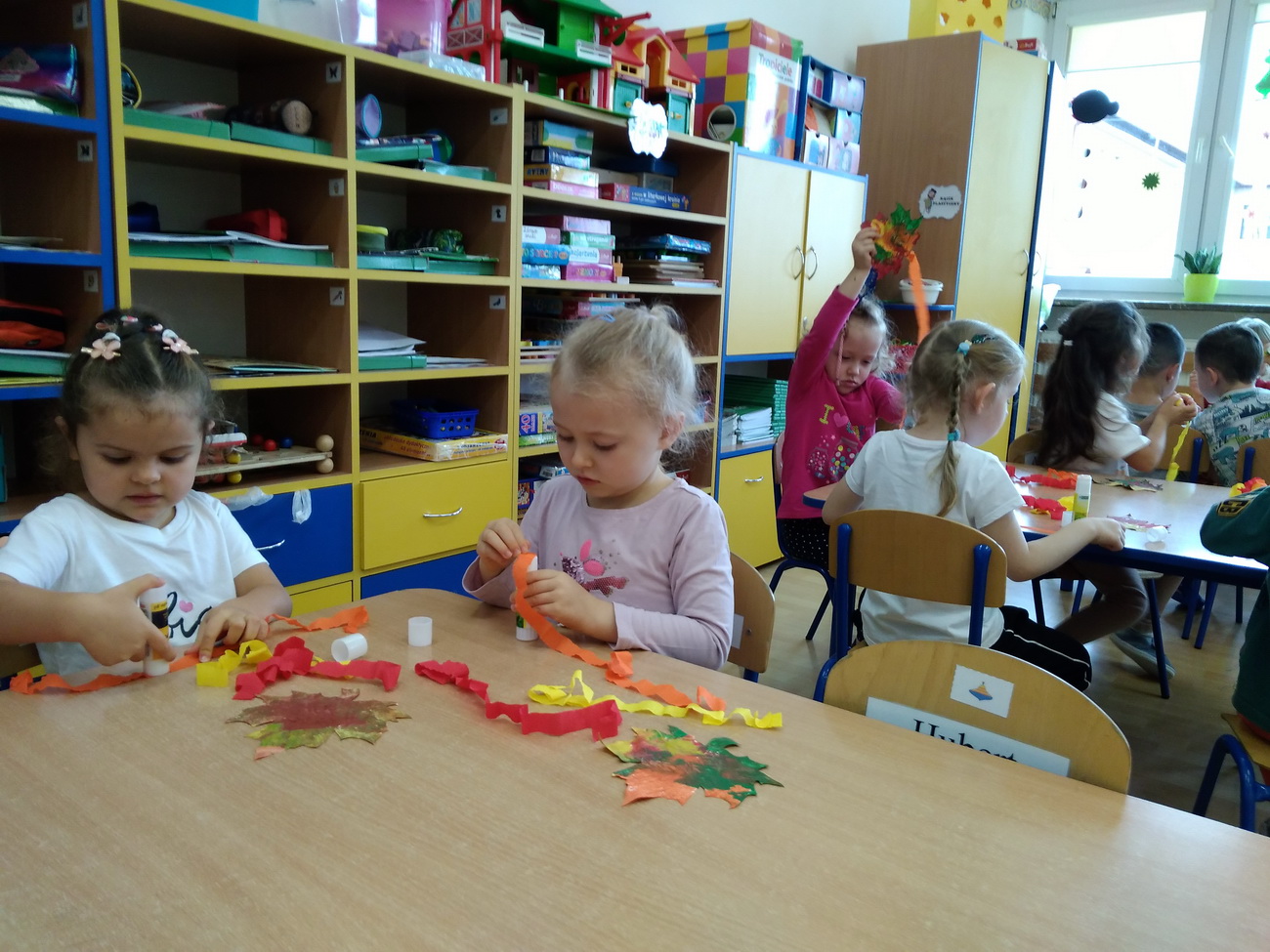 W tym dniu rozmawialiśmy nie tylko o oznakach nowej pory roku, ale także o liściach – jakie mają kształty, jakie są ich rodzaje, jakie kolory przybierają jesienią, porównywaliśmy wielkość liści przyniesionych do sali, odgadywaliśmy nazwy drzew, z których już spadły. Podzieliliśmy liście według kolorów, kształtów i wielkości, sprawdziliśmy co szybciej spada – podrzucony do góry liść czy klocek. Nie zabrakło także spaceru połączonego z obserwacją zmian zachodzących w przyrodzie. Uwieńczeniem zajęć było wykonanie prac plastycznych.