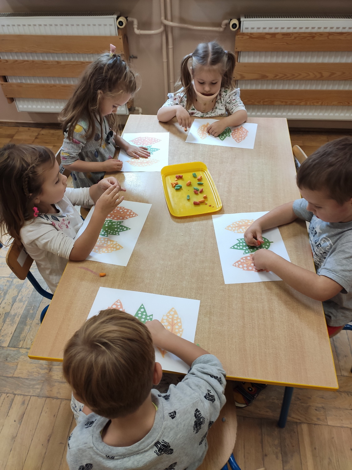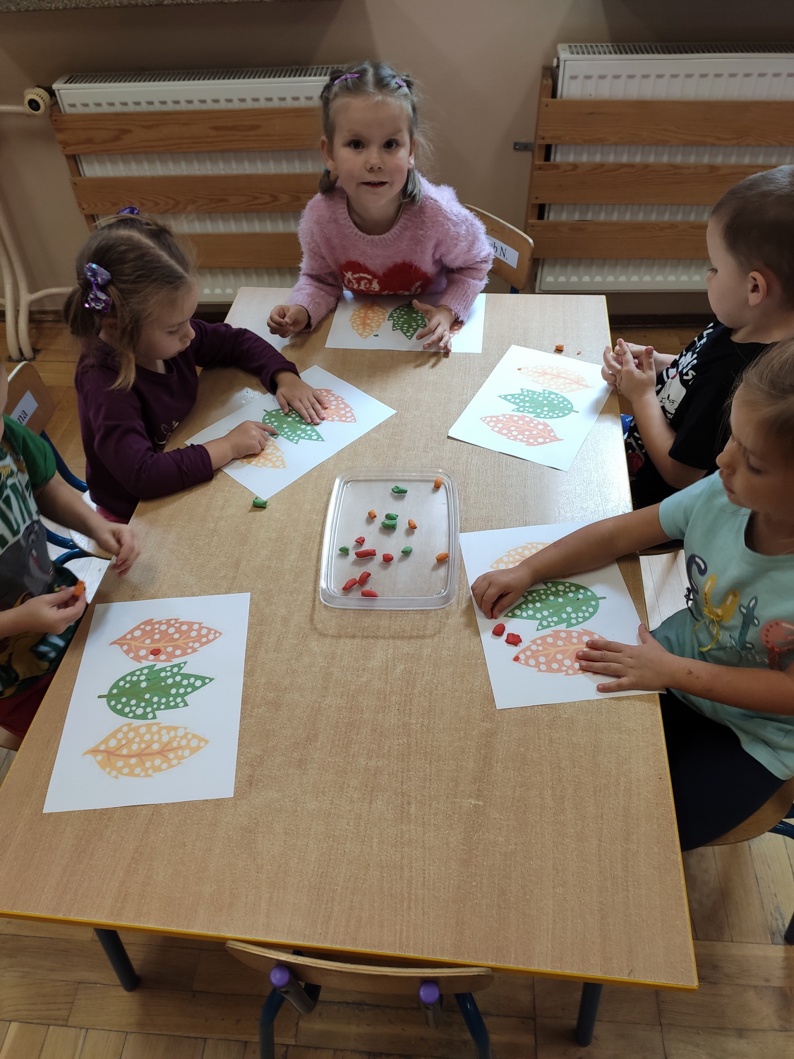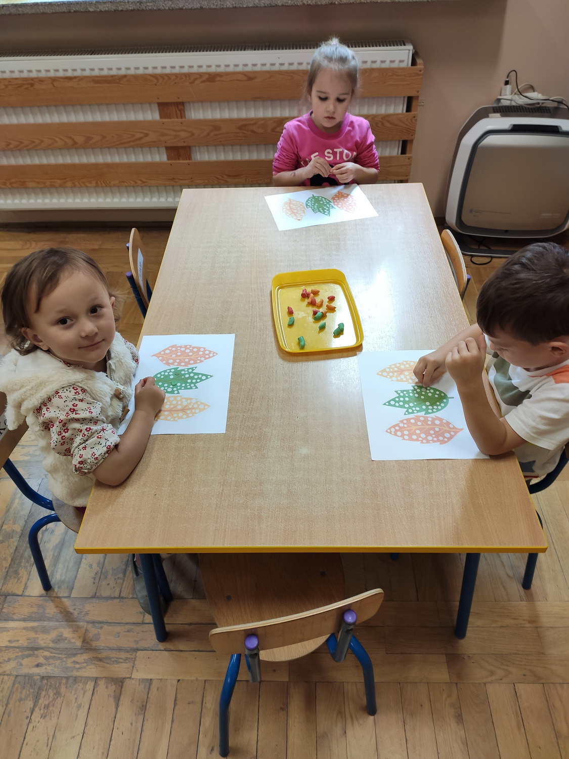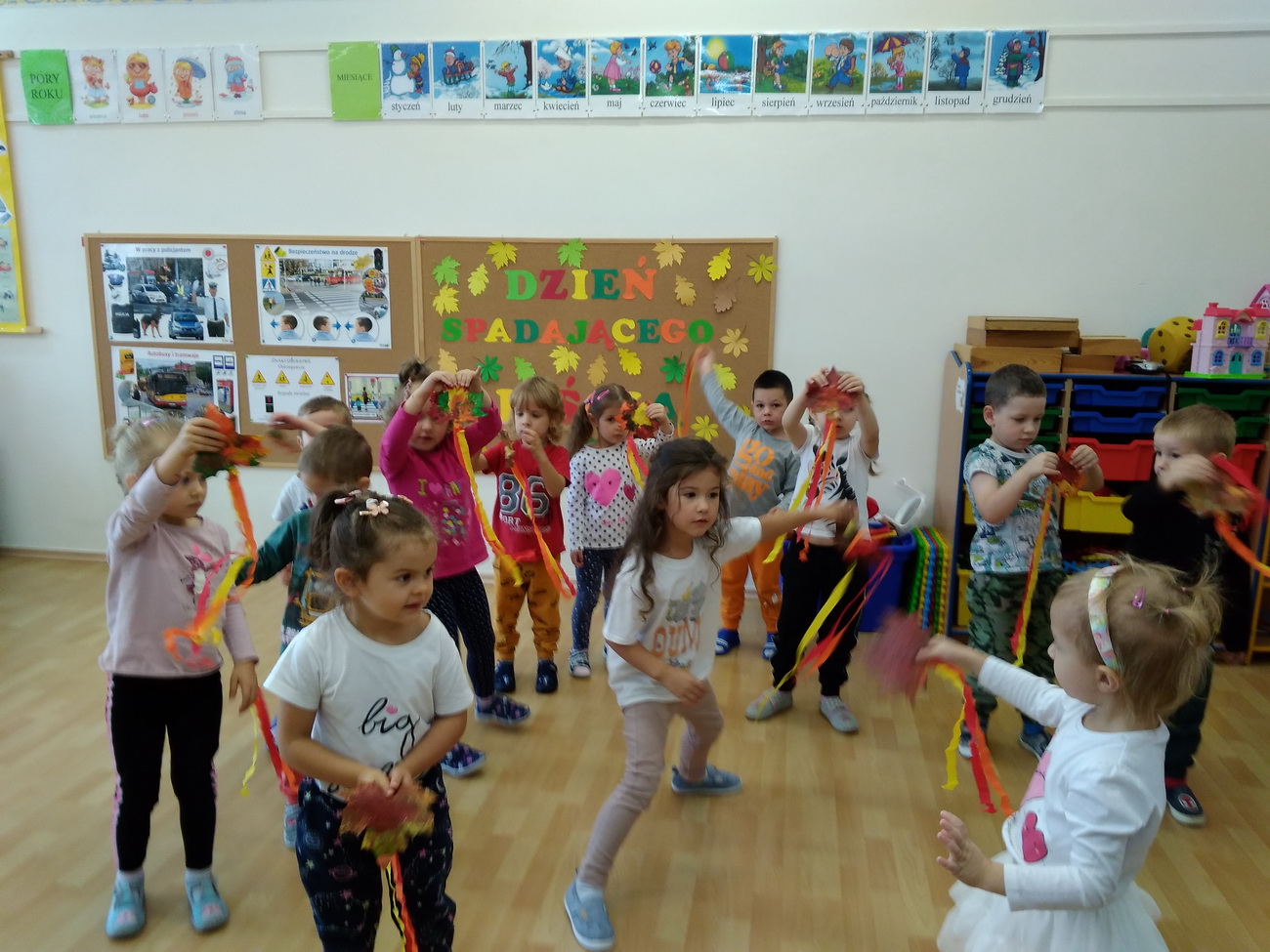 W tym dniu rozmawialiśmy nie tylko o oznakach nowej pory roku, ale także o liściach – jakie mają kształty, jakie są ich rodzaje, jakie kolory przybierają jesienią, porównywaliśmy wielkość liści przyniesionych do sali, odgadywaliśmy nazwy drzew, z których już spadły. Podzieliliśmy liście według kolorów, kształtów i wielkości, sprawdziliśmy co szybciej spada – podrzucony do góry liść czy klocek. Nie zabrakło także spaceru połączonego z obserwacją zmian zachodzących w przyrodzie. Uwieńczeniem zajęć było wykonanie prac plastycznych.