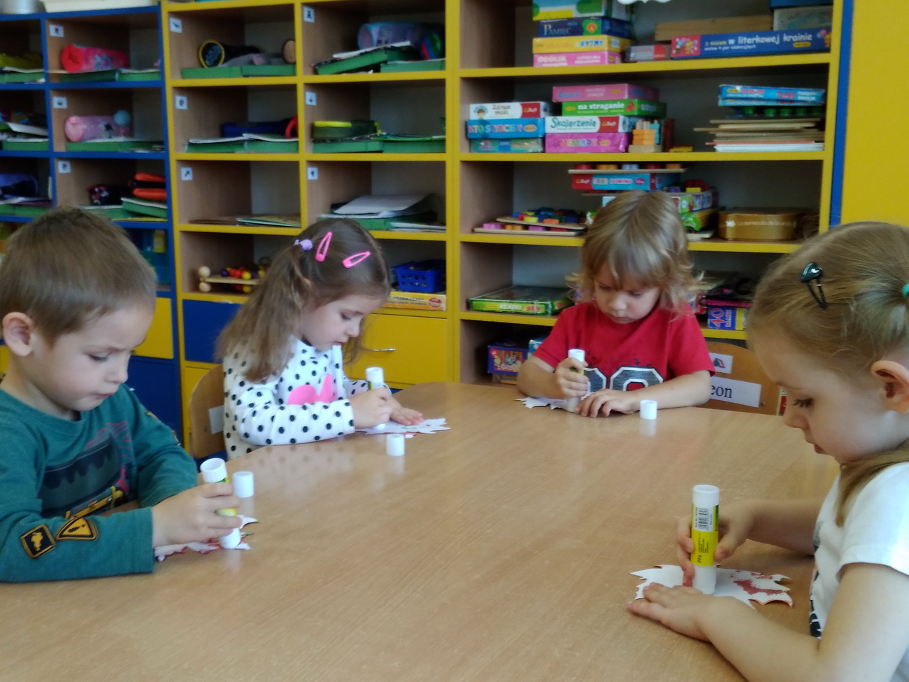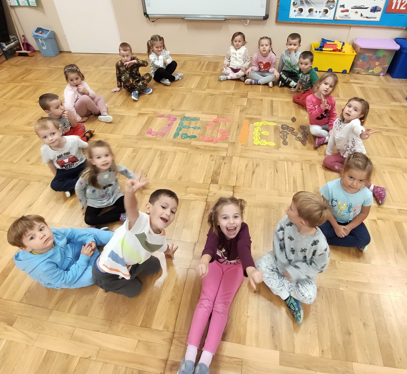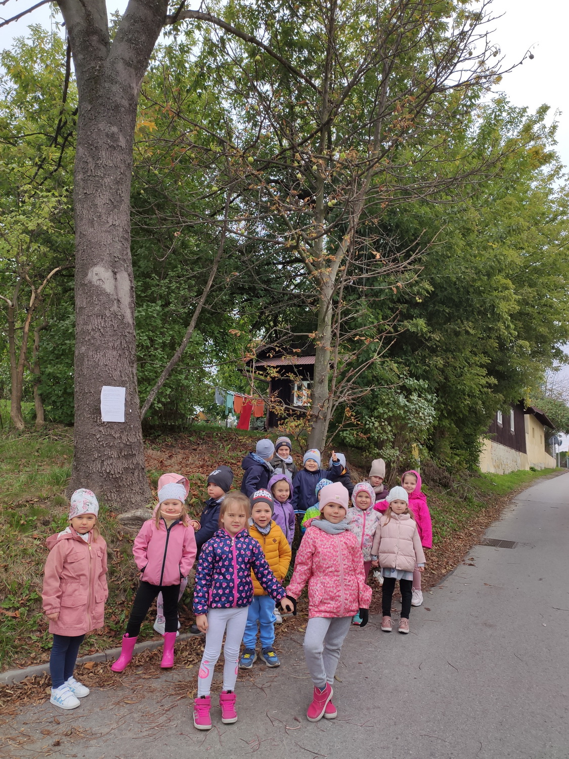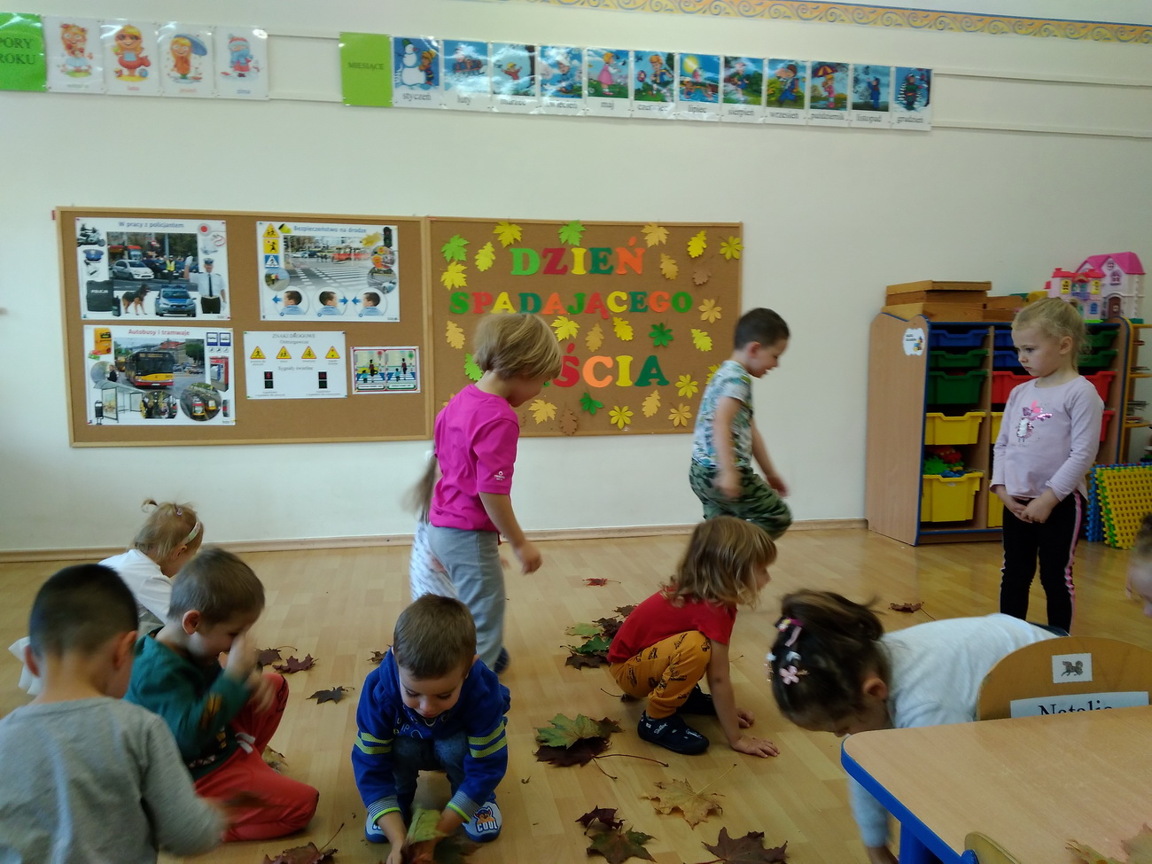 W tym dniu rozmawialiśmy nie tylko o oznakach nowej pory roku, ale także o liściach – jakie mają kształty, jakie są ich rodzaje, jakie kolory przybierają jesienią, porównywaliśmy wielkość liści przyniesionych do sali, odgadywaliśmy nazwy drzew, z których już spadły. Podzieliliśmy liście według kolorów, kształtów i wielkości, sprawdziliśmy co szybciej spada – podrzucony do góry liść czy klocek. Nie zabrakło także spaceru połączonego z obserwacją zmian zachodzących w przyrodzie. Uwieńczeniem zajęć było wykonanie prac plastycznych.