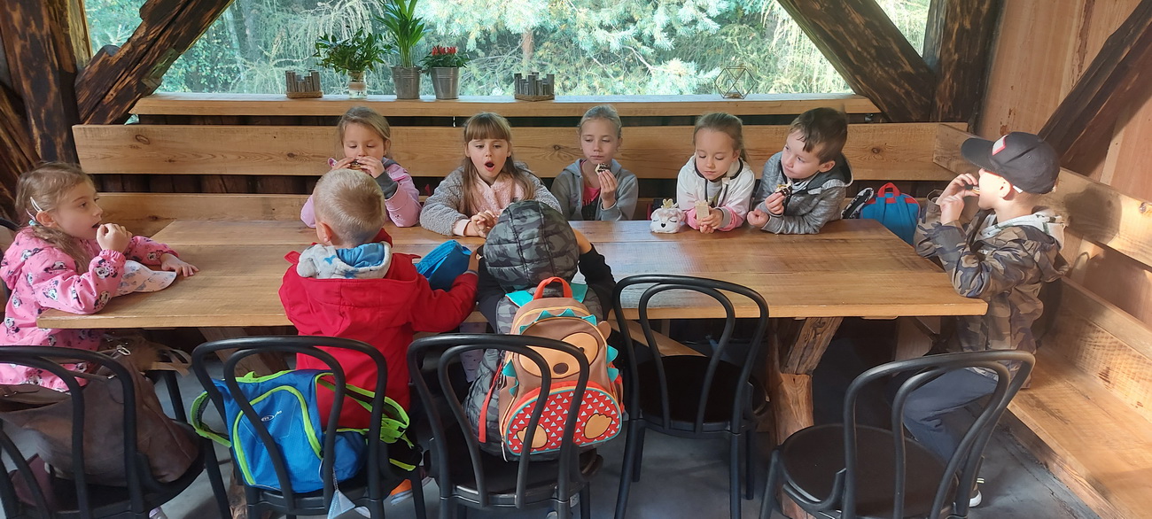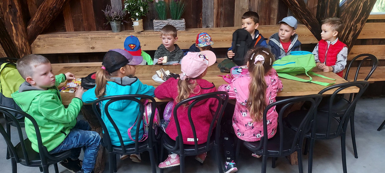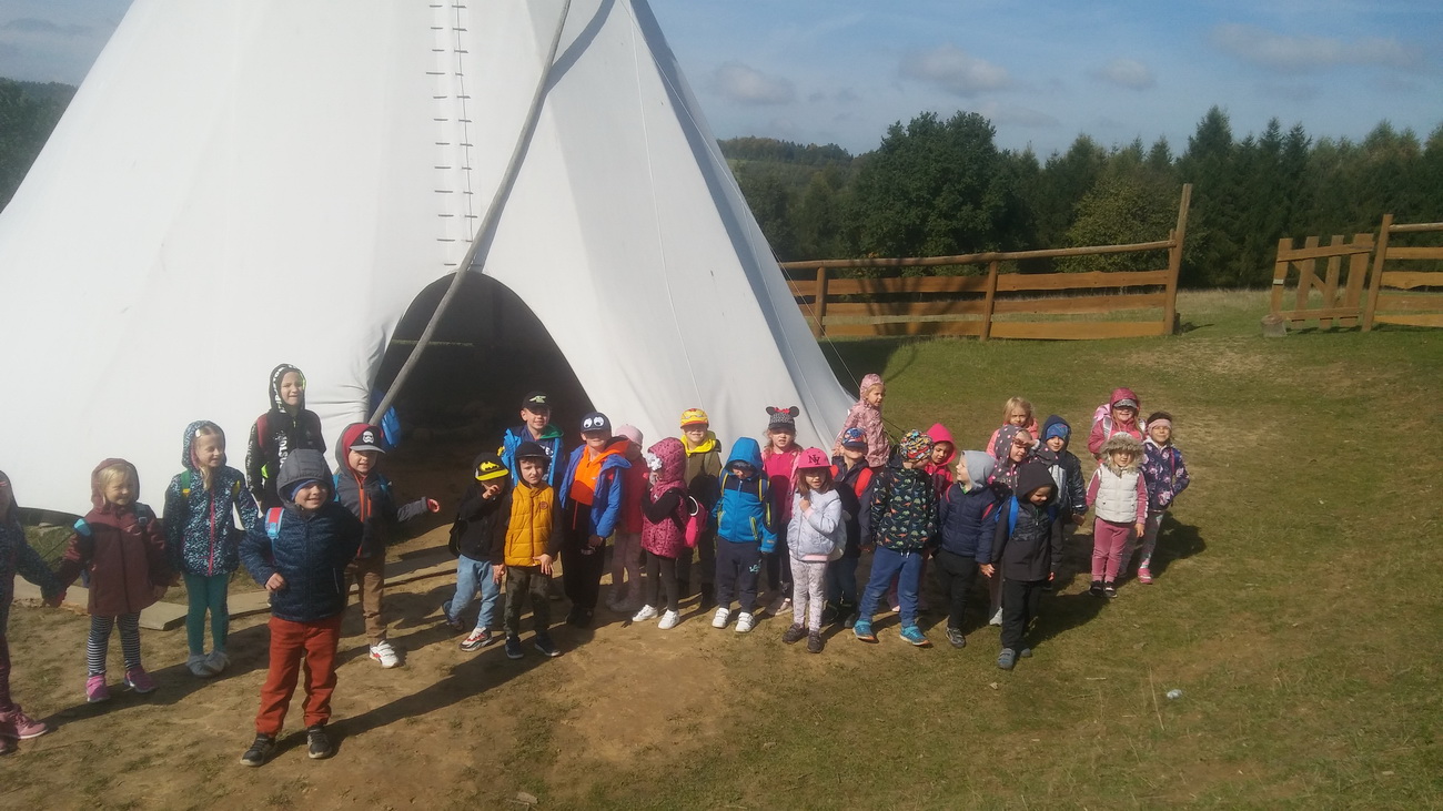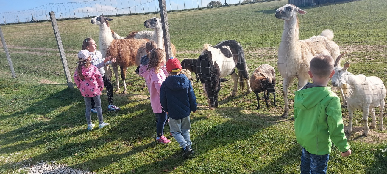 28 września 2021 r. grupy VI i VII wybrały się autokarem do zagrody ekologicznej Ranczo w Pstrągowej. Sama jazda autokarem była dla dzieci nie lada gratką, a to był dopiero początek, ponieważ tam czekała masa atrakcji. Przedszkolaki zwiedzały teren zagrody, podziwiając piękne widoki. Na leśnej polanie, gdzie znajdowało się mini ZOO w stylu safari, miały niepowtarzalną okazję niemalże dotknąć zwierząt. Oswojone lamy, daniele, sarny, kucyki dosłownie jadły dzieciom z ręki. Wielką niespodzianką była także przejażdżka wozem przez wieś Pstrągowa.