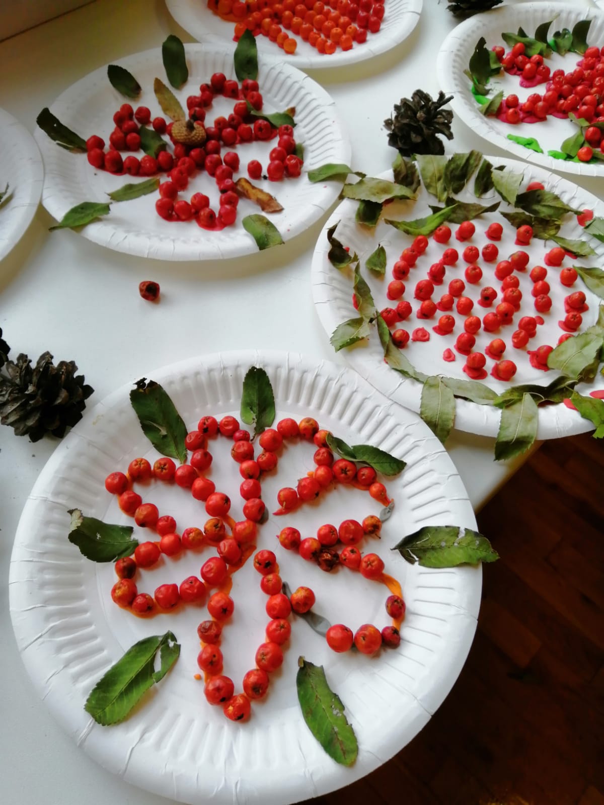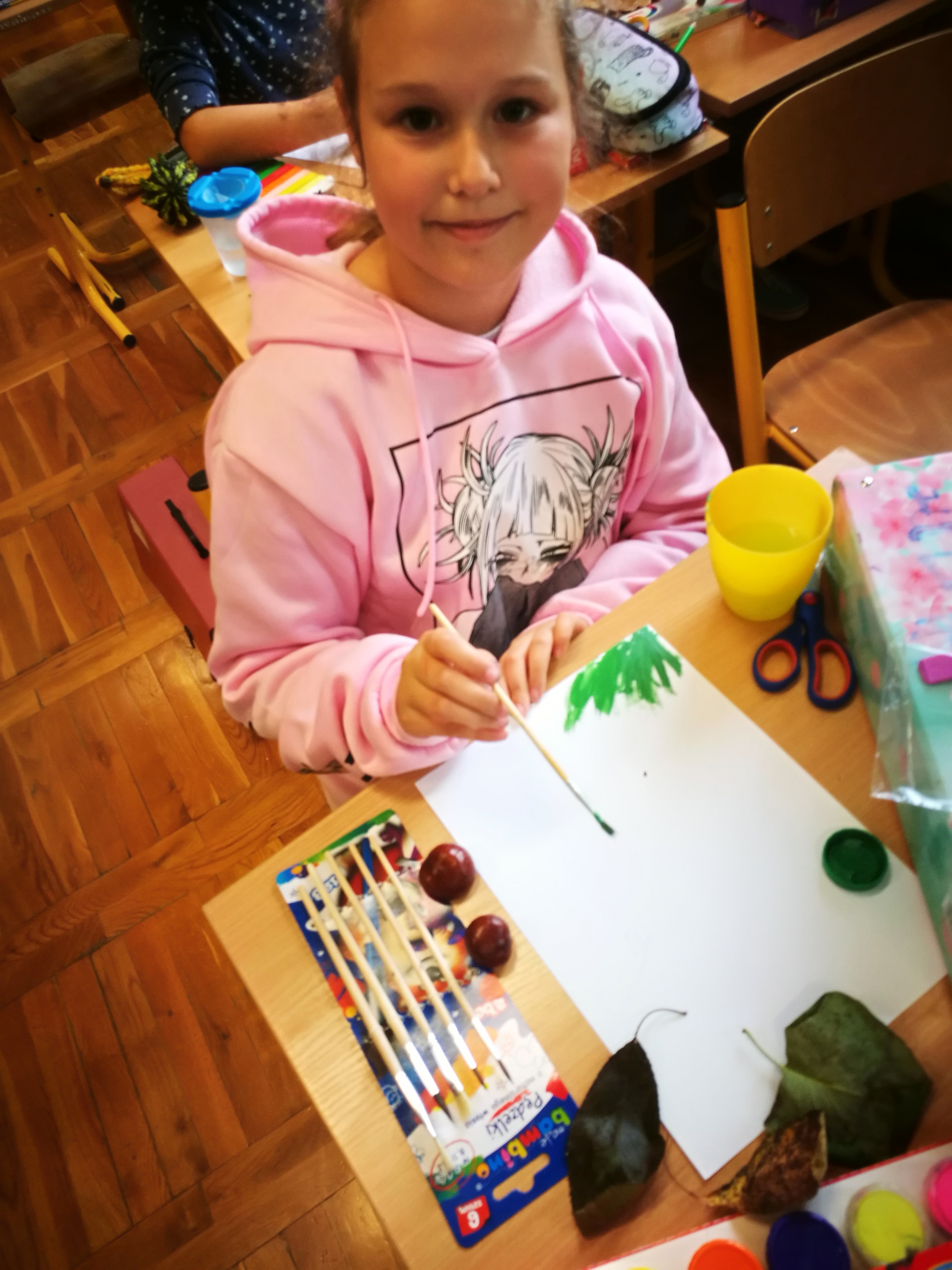 Jesień zagościła także w naszych szkolnych murach. W wiklinowych koszach znalazły się jeszcze zielone liście oraz owoce z lasu – żołędzie, kasztany, szyszki.