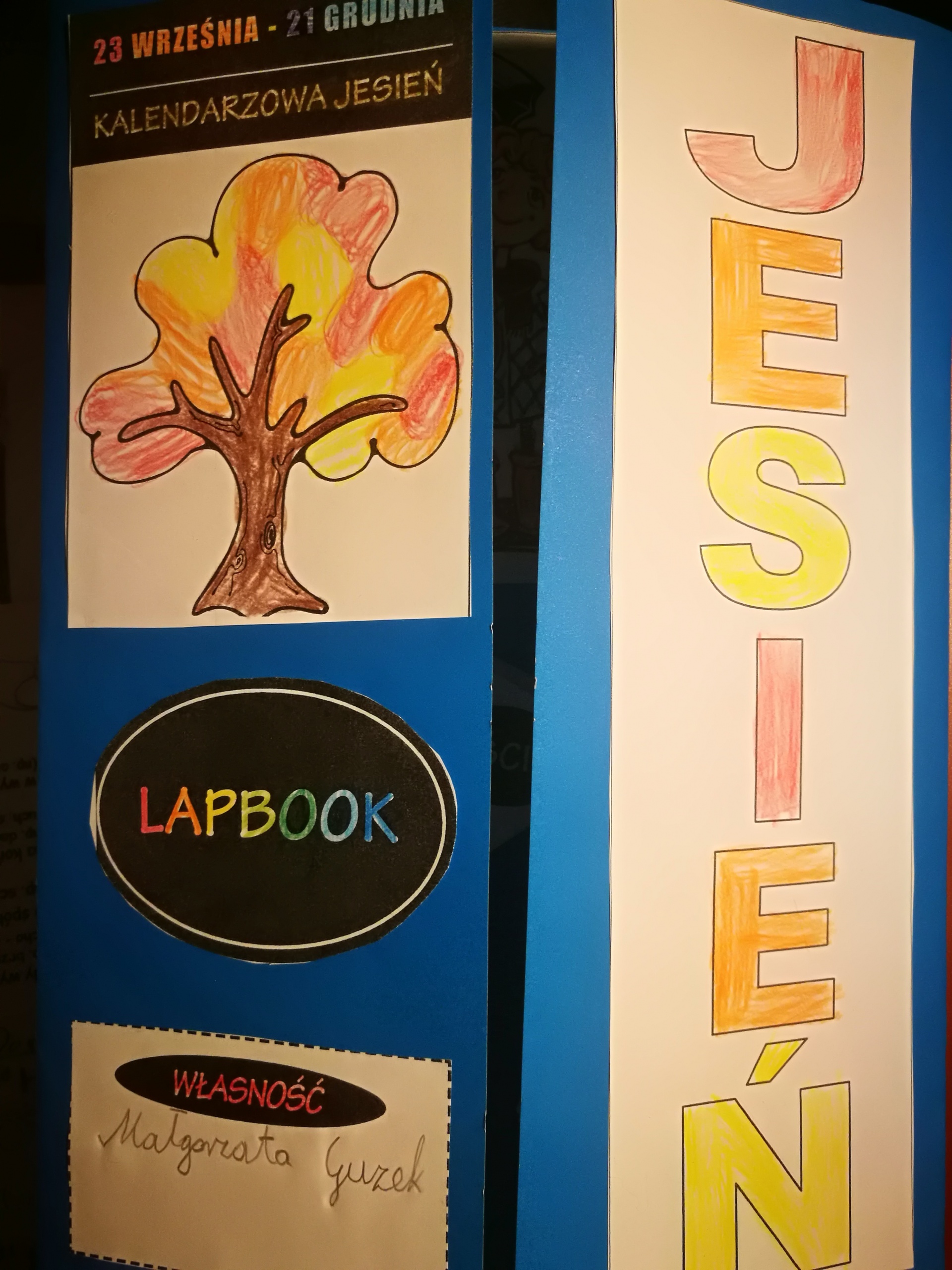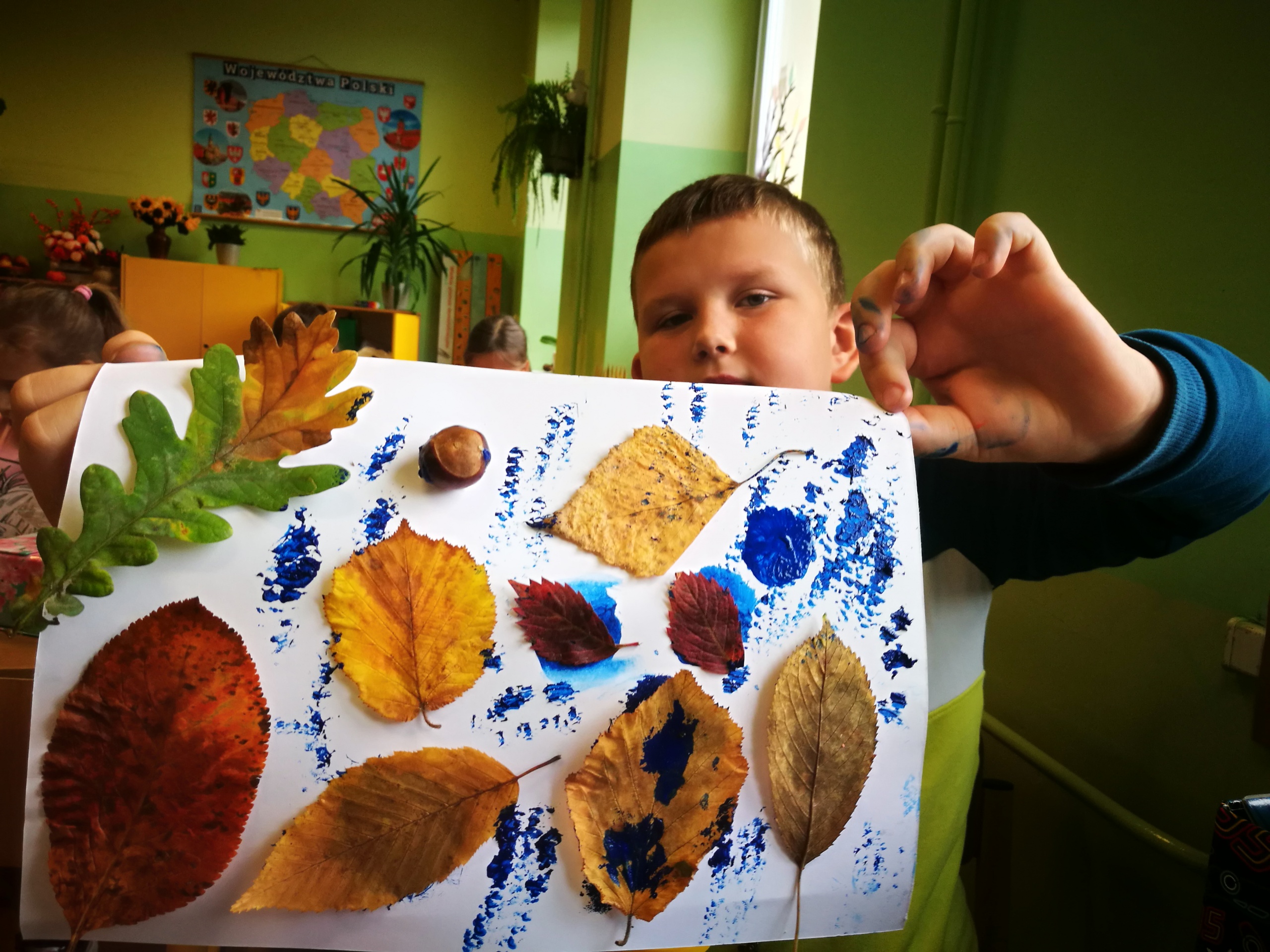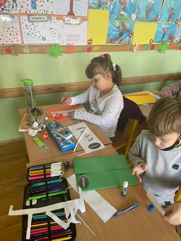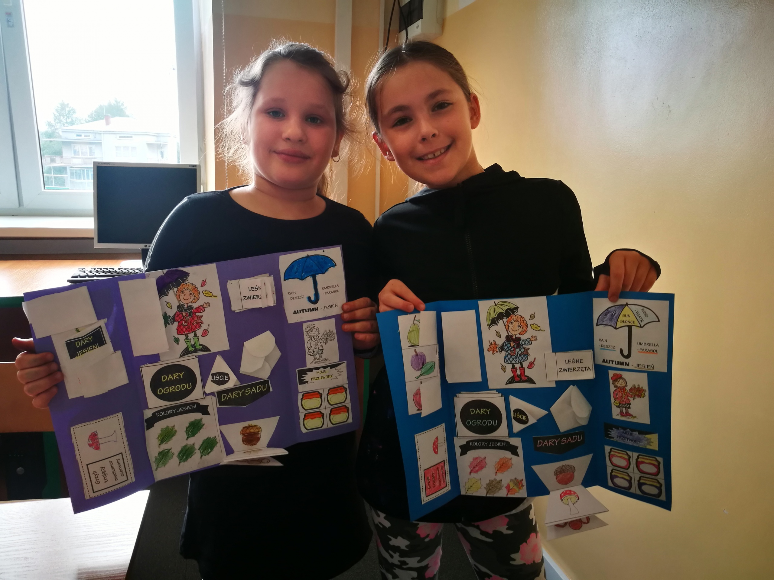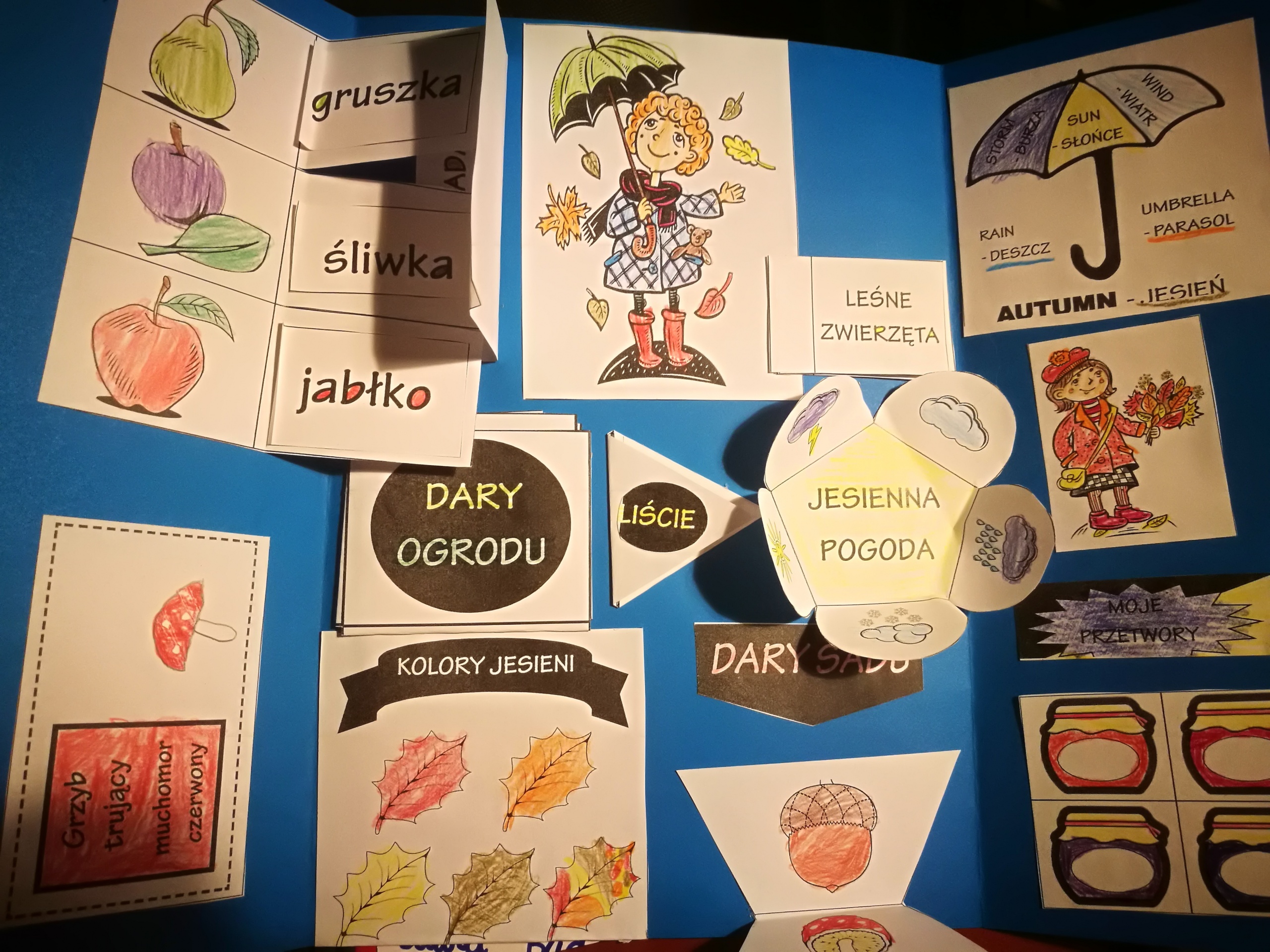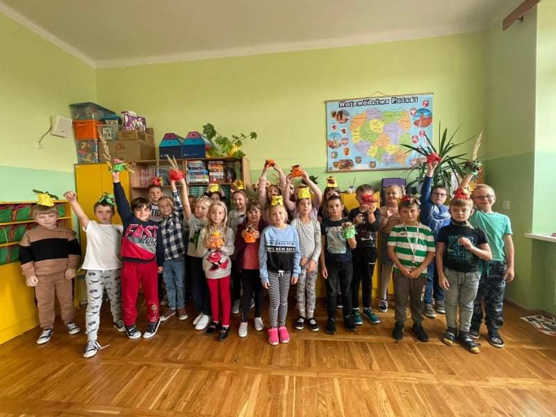 Uczniowie wykonali wspaniałe prace plastyczne, które stały się ozdobą naszych klas. Na podstawie poznanych wiadomości dzieci z klasy drugiej i trzeciej wykonały również jesienne lapbooki, w których omówiły budowę liści, ich klasyfikację; zaprezentowały ptaki, które odlatują z Polski, przylatują bądź zostają, wyjaśniły, dlaczego grzyby pojawiają się jesienią w lesie oraz omówiły ich podział na trujące i jadalne. Dzięki lapbookom dowiedzieliśmy się, czym jest hibernacja/sen zimowy, które zwierzęta trzeba dokarmiać zimą i dlaczego; dlaczego liście zmieniają kolor i spadają? Jesienny dzień zakończył się wykonaniem wystawki z przyniesionych darów jesieni.