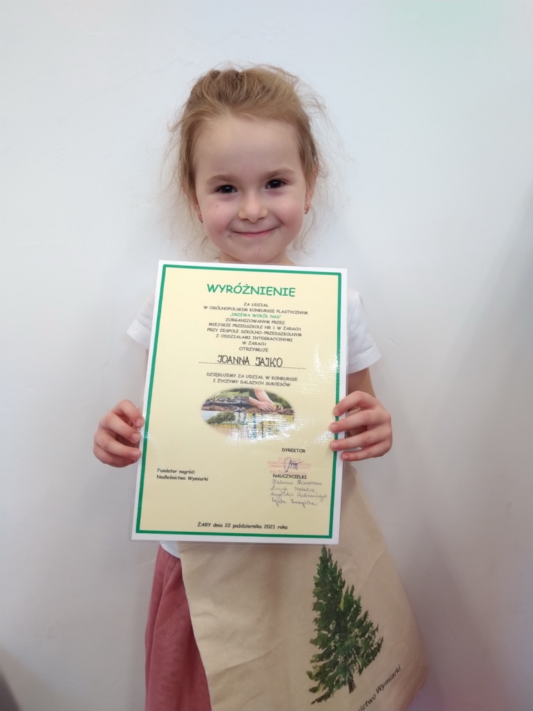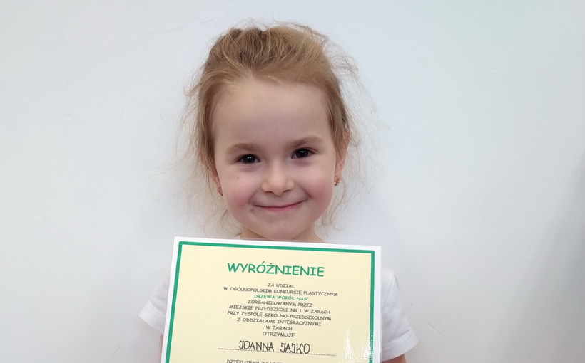 Z radością informujemy, że nasza wychowanka, Joanna Jajko zdobyła wyróżnienie w Ogólnopolskim Konkursie Plastycznym pt.: „Drzewa wokół nas”. Asi serdecznie gratulujemy i życzymy dalszych plastycznych sukcesów.