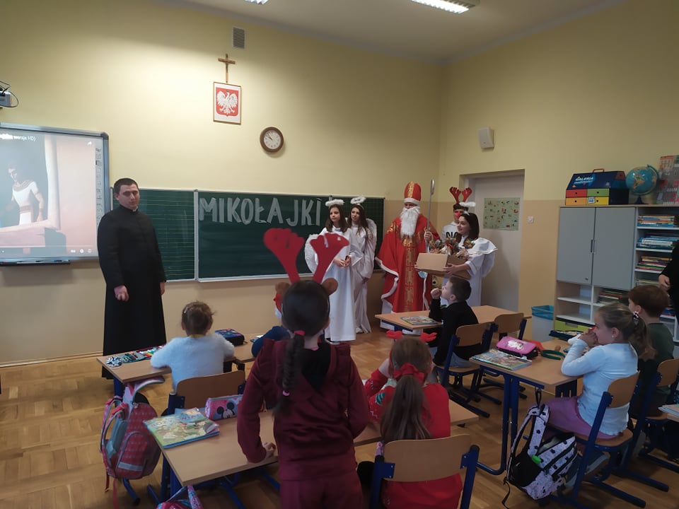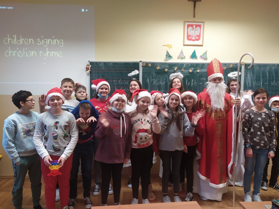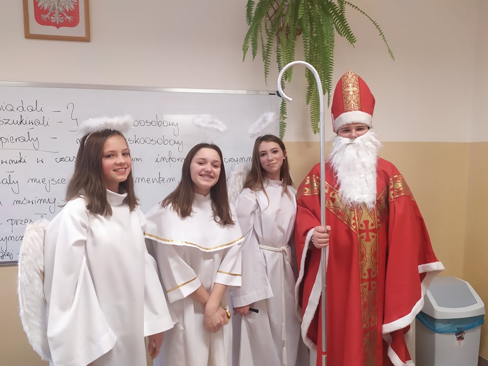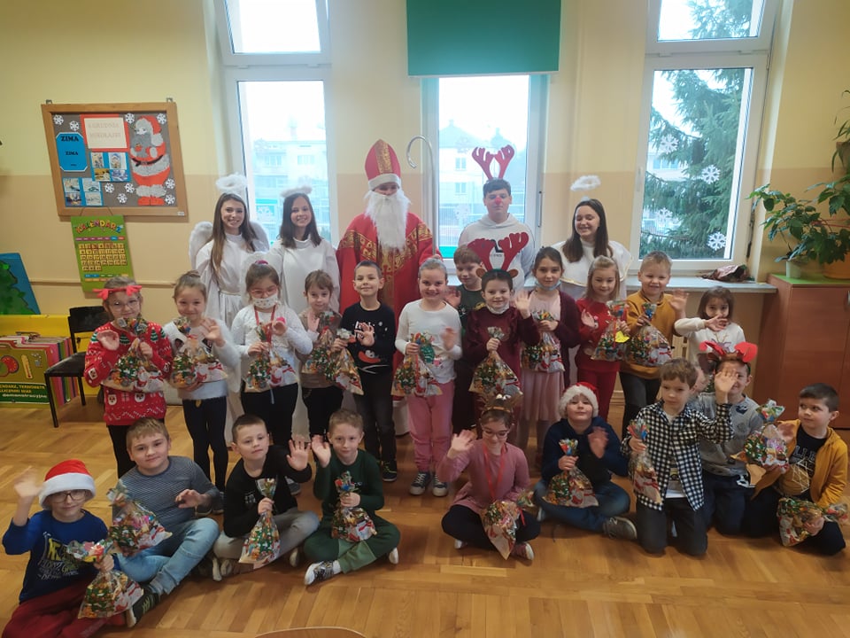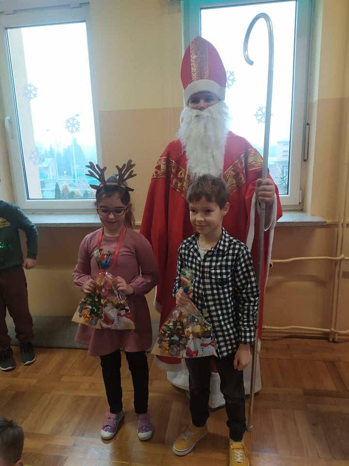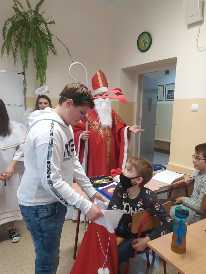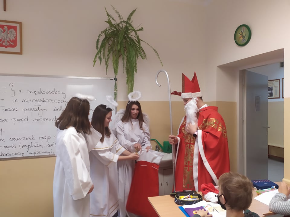 6 grudnia jest dniem wyjątkowym, to wtedy przychodzi ktoś, na kogo wszyscy z niecierpliwością czekają – św. Mikołaj! Ponieważ w naszej szkole są tylko grzeczne dzieci, wszystkie od samego rana z wielkim entuzjazmem nasłuchiwały, czy na korytarzu nie słychać anielskich śpiewów i dzwonków reniferów. Św. Mikołaj wraz z całym orszakiem odwiedził każdą klasę, a w swoim wielkim worze przyniósł najróżniejsze prezenty i słodkości. Uciechom nie było końca! Tym bardziej, że na każdego ucznia w mikołajowej czapce czekał jeszcze jeden prezent – dzień bez pytania. Dzieci solennie obiecały, że będą w nadchodzącym roku bardzo grzeczne, by zasłużyć na ponowną wizytę niezapomnianych gości.