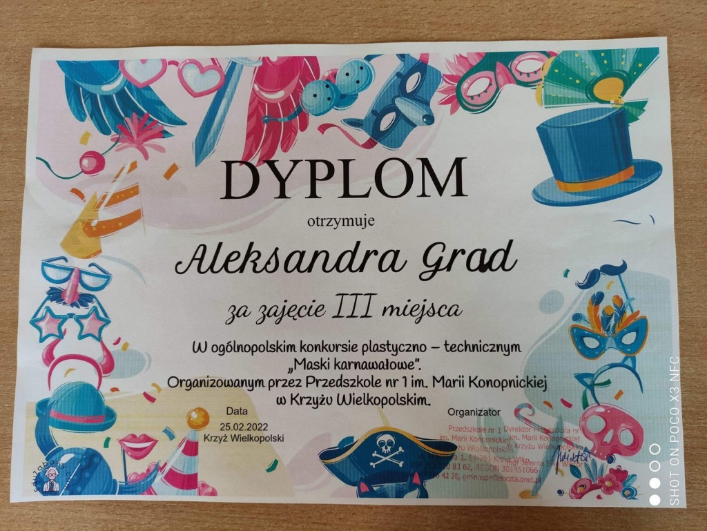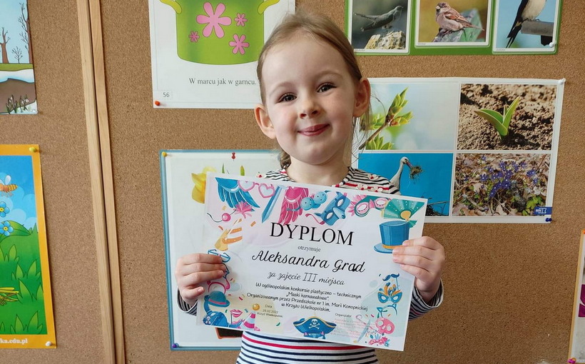W lutym w Przedszkolu nr 1 im. Marii Konopnickiej w Krzyżu Wielkopolskim odbył się konkurs plastyczno-techniczny „Maska karnawałowa”. Był on skierowany do dzieci w wieku przedszkolnym z całej Polski. Na konkurs dostarczono 113 pięknych prac, wykonanych różnymi technikami. Kilkoro dzieci z naszej placówki również wzięło udział w tej rywalizacji.