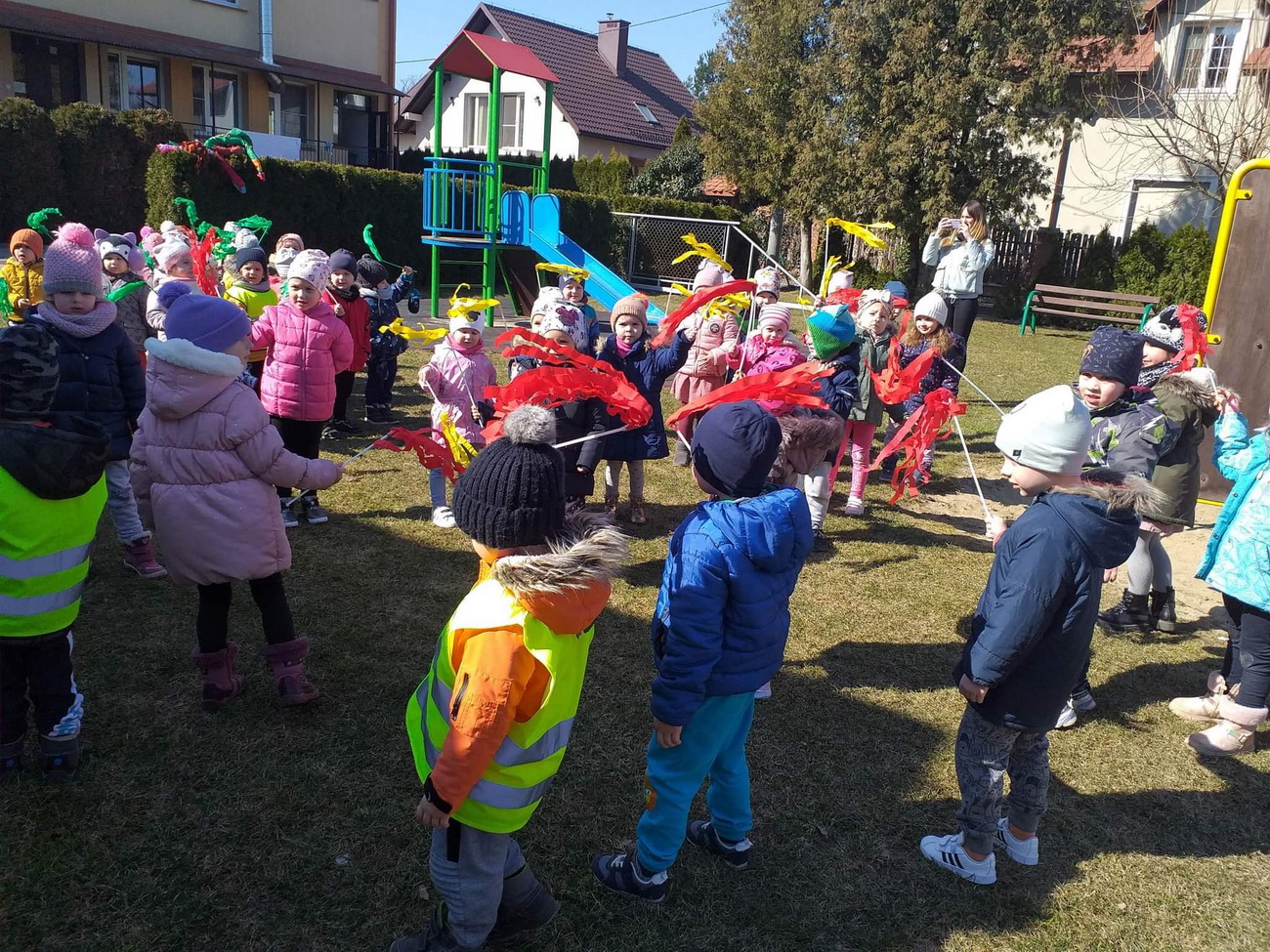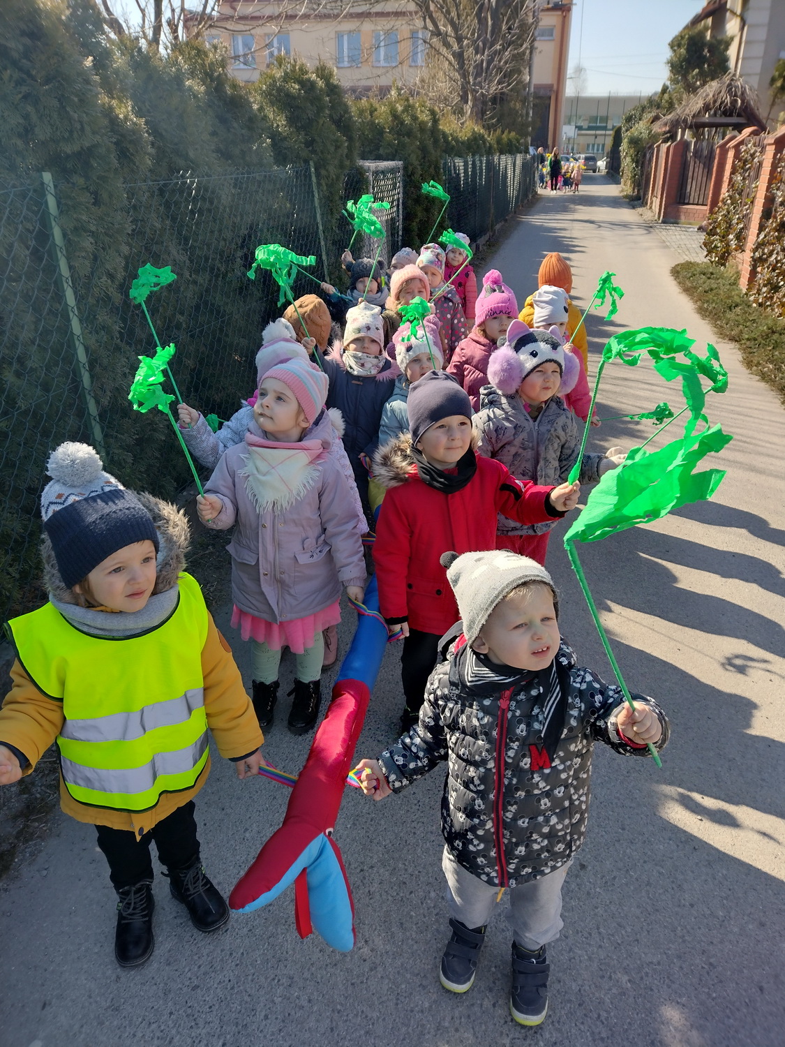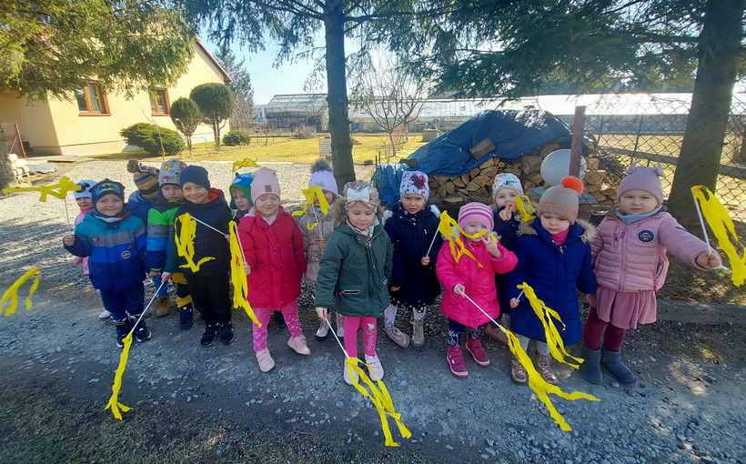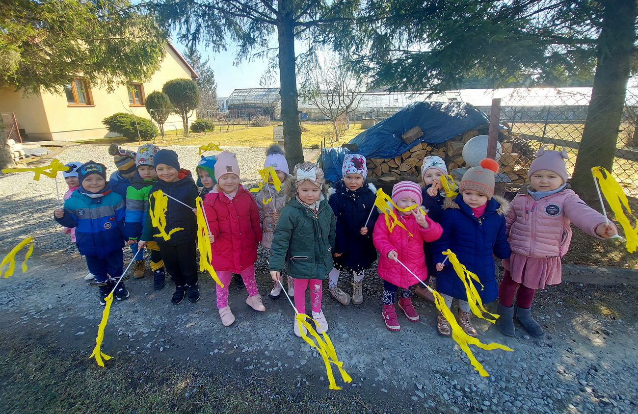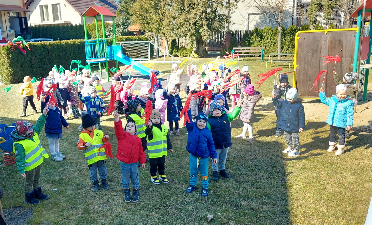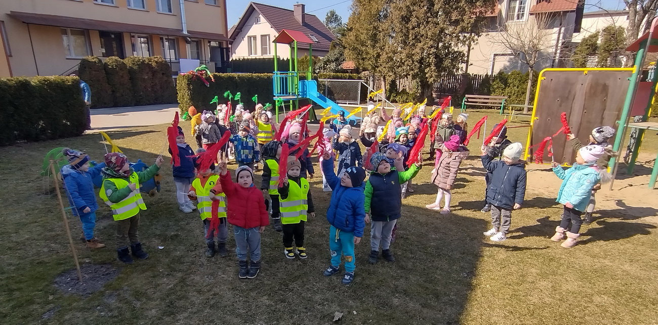 21 marca wszystkie grupy z przedszkola wzięły udział w “Zielonym korowodzie”, aby powitać nową porę roku – wiosnę. Zgodnie z tradycją, na czele korowodu stanęła marzanna, czyli symbol pożegnania zimy. Dzieci śpiewały piosenki o pani wiośnie i obserwowały bogactwa budzącej się do życia przyrody. Wcześniej każda grupa przygotowała kolorowe gaiki z bibułki. Wymachując nimi, dzieci głośno powtarzały, że “żegnają zimę, witają wiosnę”. Podczas przemarszu wszyscy poczuli pierwsze promyki wiosennego słońca. Oby zostały z nami na dłużej.