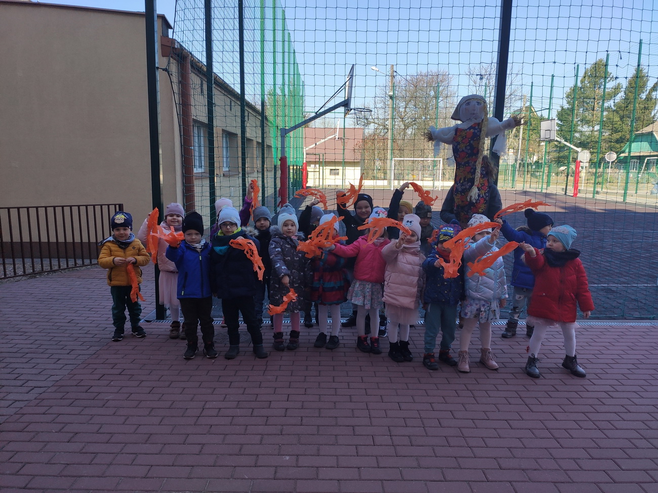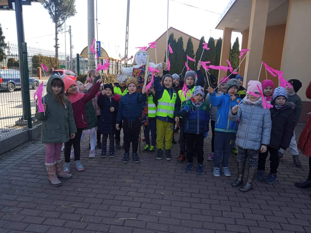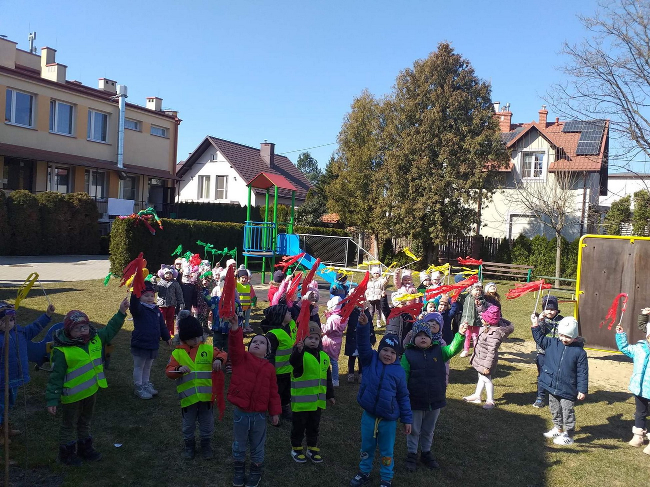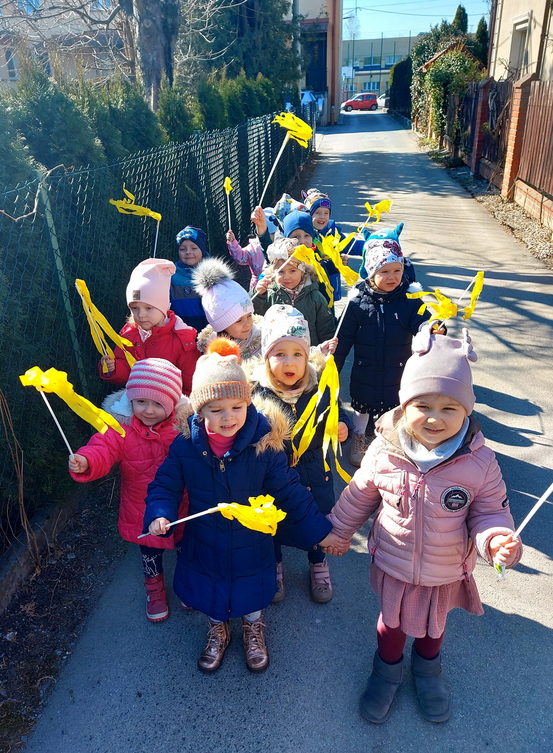 21 marca wszystkie grupy z przedszkola wzięły udział w “Zielonym korowodzie”, aby powitać nową porę roku – wiosnę. Zgodnie z tradycją, na czele korowodu stanęła marzanna, czyli symbol pożegnania zimy. Dzieci śpiewały piosenki o pani wiośnie i obserwowały bogactwa budzącej się do życia przyrody. Wcześniej każda grupa przygotowała kolorowe gaiki z bibułki. Wymachując nimi, dzieci głośno powtarzały, że “żegnają zimę, witają wiosnę”. Podczas przemarszu wszyscy poczuli pierwsze promyki wiosennego słońca. Oby zostały z nami na dłużej.