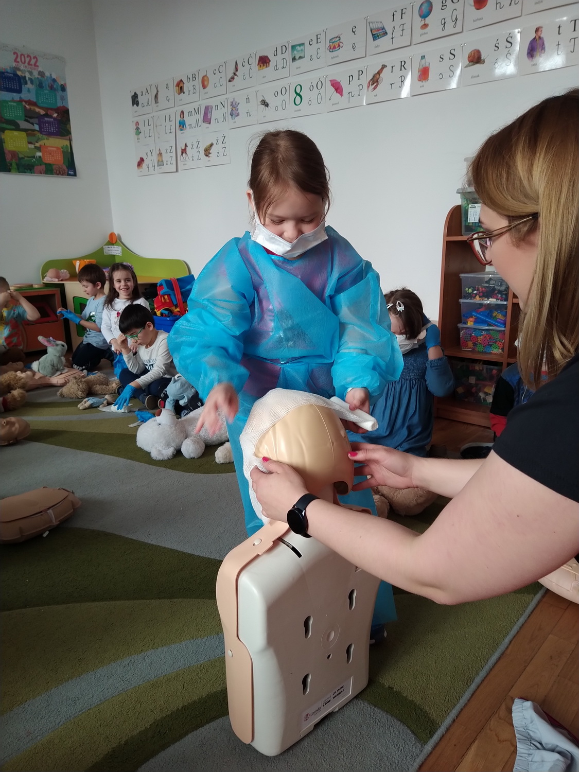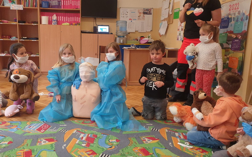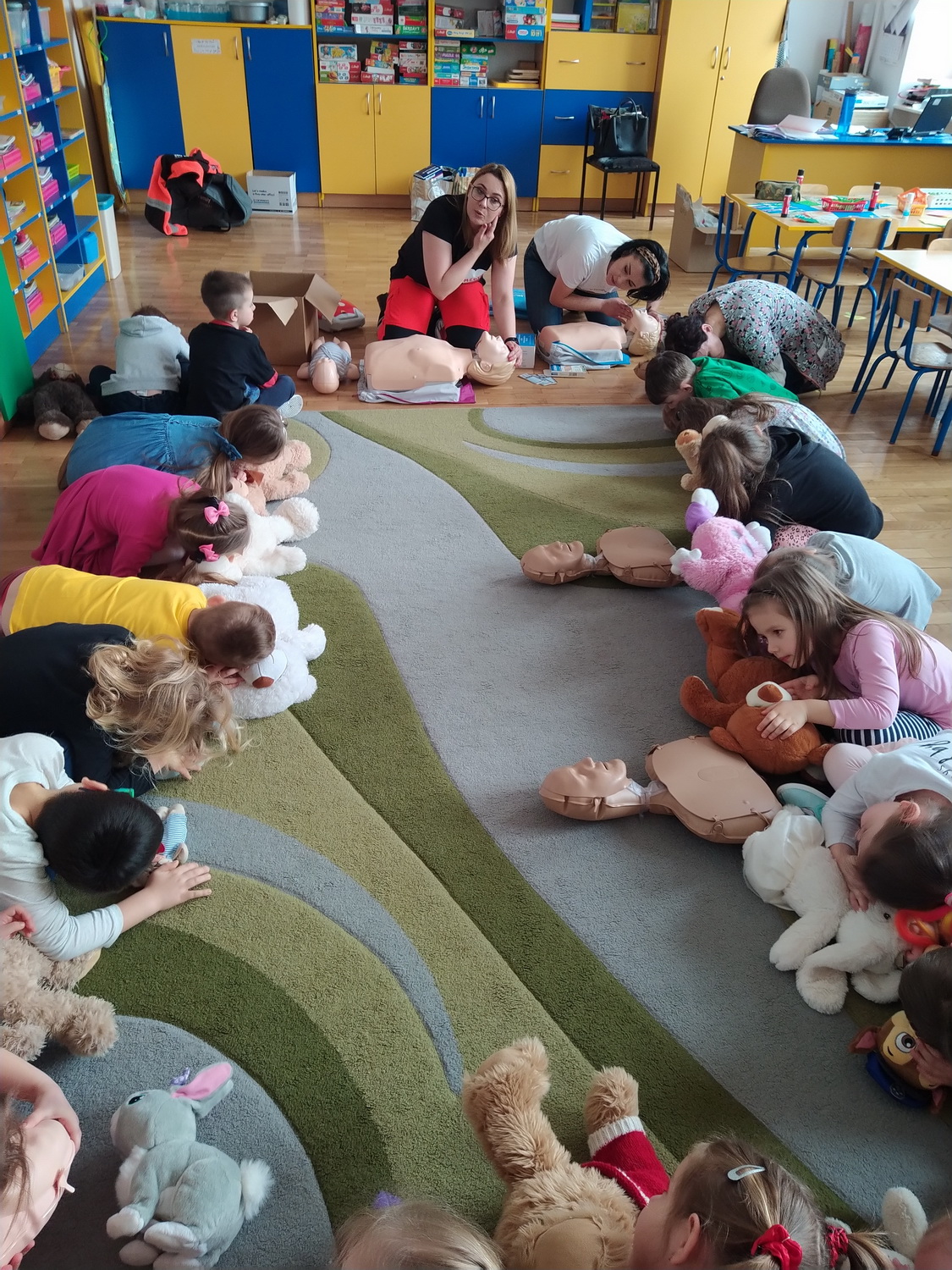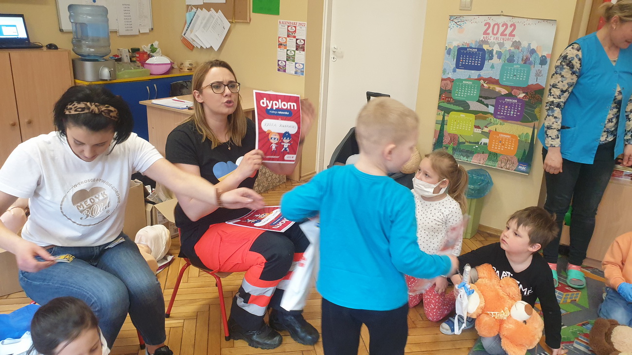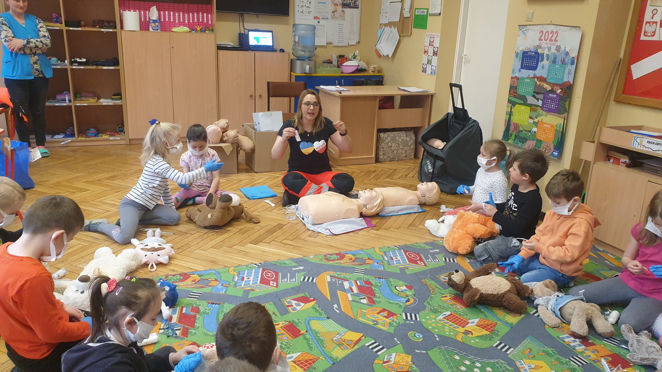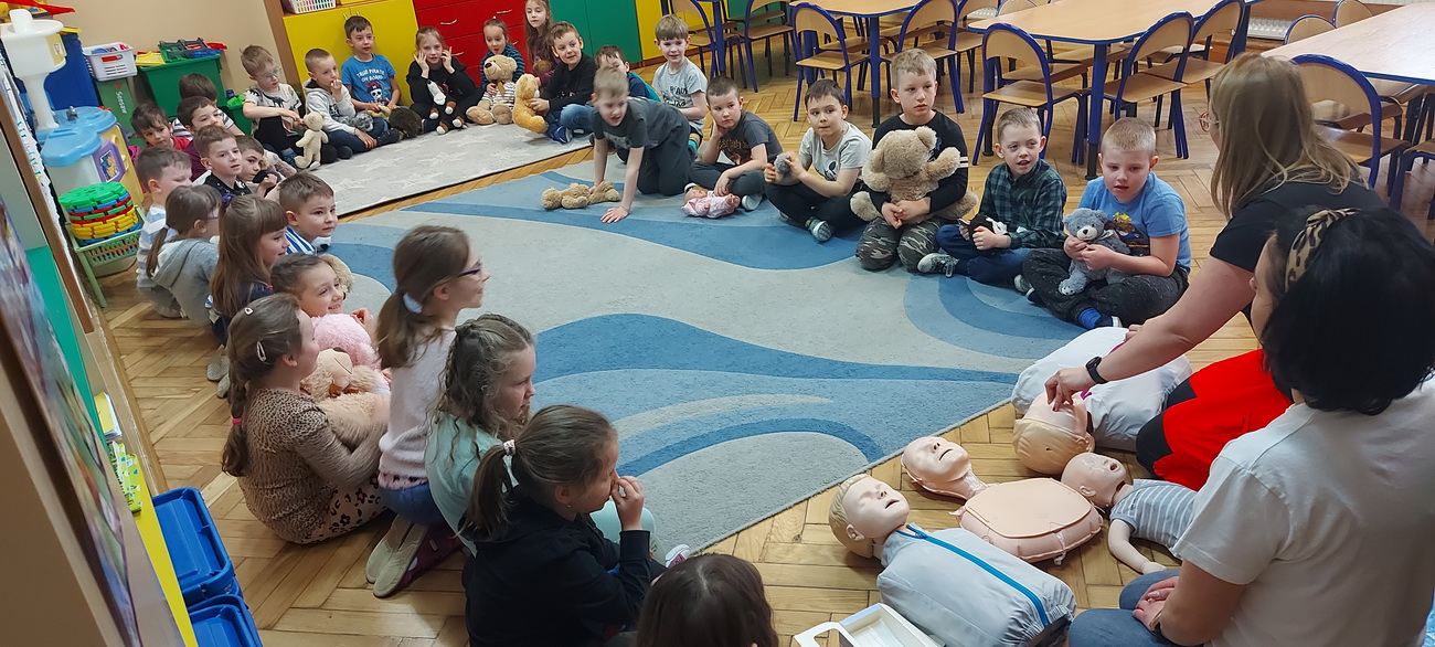 Z takim właśnie przekazem 29 marca do naszego przedszkola przyjechali ratownicy medyczni z Centrum Medycznego „Medyk”, którzy w najstarszych grupach przedszkolnych przeprowadzili zajęcia edukacyjne z zakresu udzielania pierwszej pomocy przedmedycznej. Przedszkolaki uczyły się prawidłowych zachowań i skutecznego działania w nagłych, nieprzewidzianych sytuacjach zagrożenia życia, utrwaliły znajomość numerów alarmowych oraz obserwowały czynności ratownicze w czasie zasłabnięć, zranień, zwichnięć i złamań. Wiele emocji wzbudził pokaz resuscytacji wykonany na fantomie. W końcu nadszedł czas, aby wykorzystać zdobytą wiedzę w praktyce i uratować swojego ukochanego misia z opresji. Mali ratownicy spisali się na medal!
