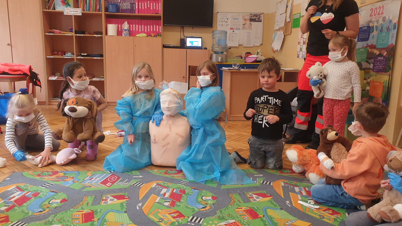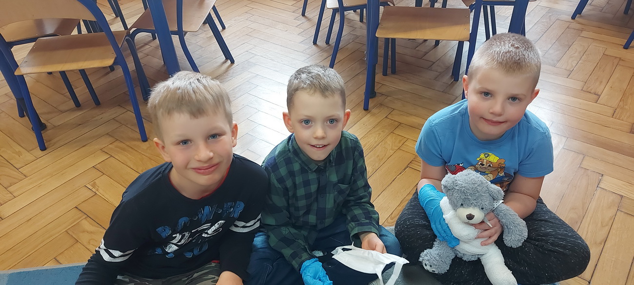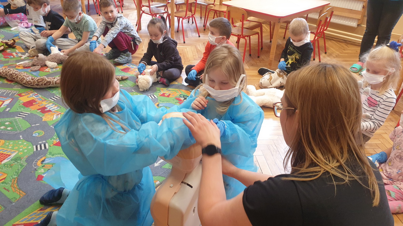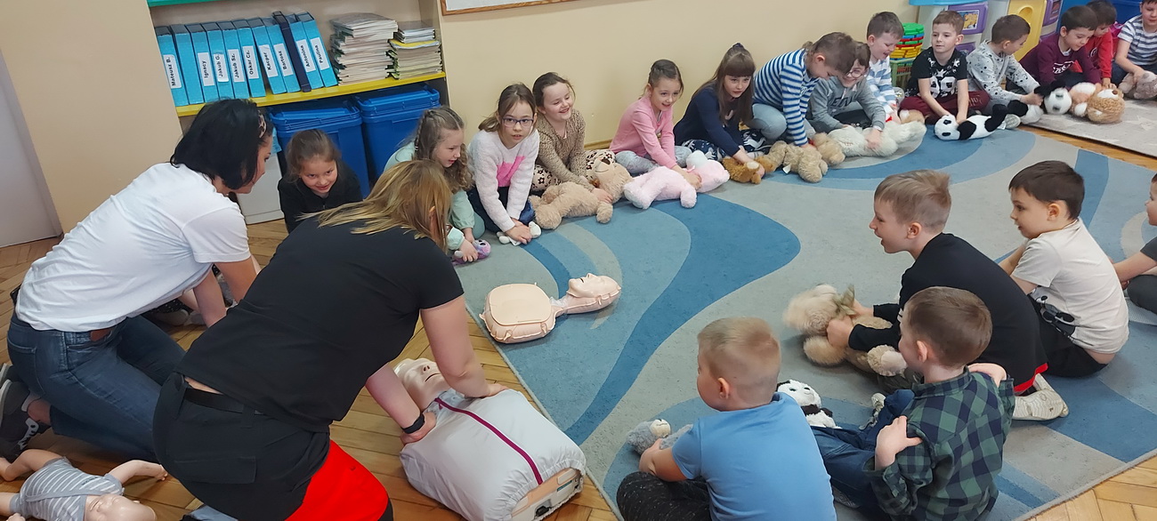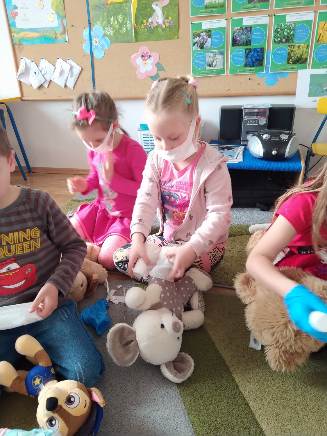 Z takim właśnie przekazem 29 marca do naszego przedszkola przyjechali ratownicy medyczni z Centrum Medycznego „Medyk”, którzy w najstarszych grupach przedszkolnych przeprowadzili zajęcia edukacyjne z zakresu udzielania pierwszej pomocy przedmedycznej. Przedszkolaki uczyły się prawidłowych zachowań i skutecznego działania w nagłych, nieprzewidzianych sytuacjach zagrożenia życia, utrwaliły znajomość numerów alarmowych oraz obserwowały czynności ratownicze w czasie zasłabnięć, zranień, zwichnięć i złamań. Wiele emocji wzbudził pokaz resuscytacji wykonany na fantomie. W końcu nadszedł czas, aby wykorzystać zdobytą wiedzę w praktyce i uratować swojego ukochanego misia z opresji. Mali ratownicy spisali się na medal!