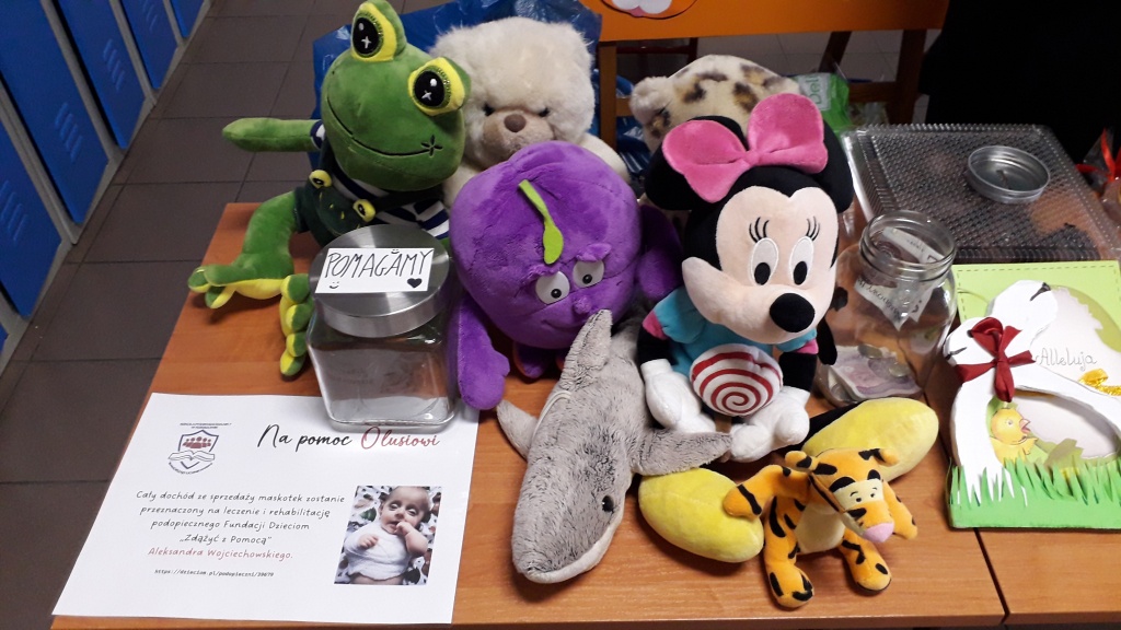 Przypominamy, że do 31 maja trwa zbiórka plastikowych nakrętek, z której dochód zostanie przekazany na leczenie małego Olka z Sanoka. Chłopiec choruje na wrodzoną łamliwość kości i potrzebuje permanentnej rehabilitacji. Dodatkowo do 13 kwietnia, przy drzwiach wejściowych do szkoły będzie trwał kiermasz pluszowych maskotek. Całkowity dochód z ich sprzedaży zostanie przekazany na subkonto Aleksandra w Fundacji Dzieciom “Zdążyć z pomocą”.