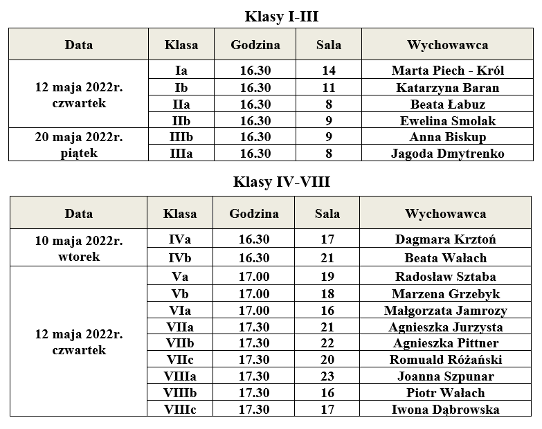 Informujemy, że spotkania wychowawców klas szkoły podstawowej z rodzicami będą odbywać się w formie stacjonarnej wg harmonogramu zamieszczonego poniżej: