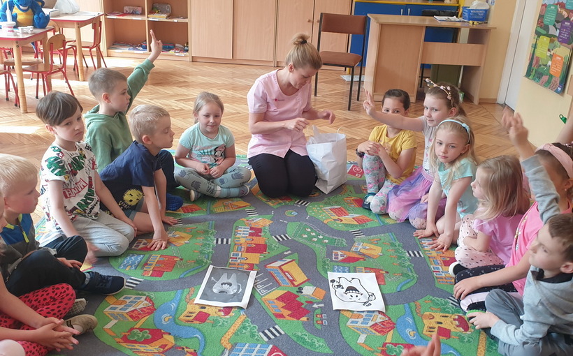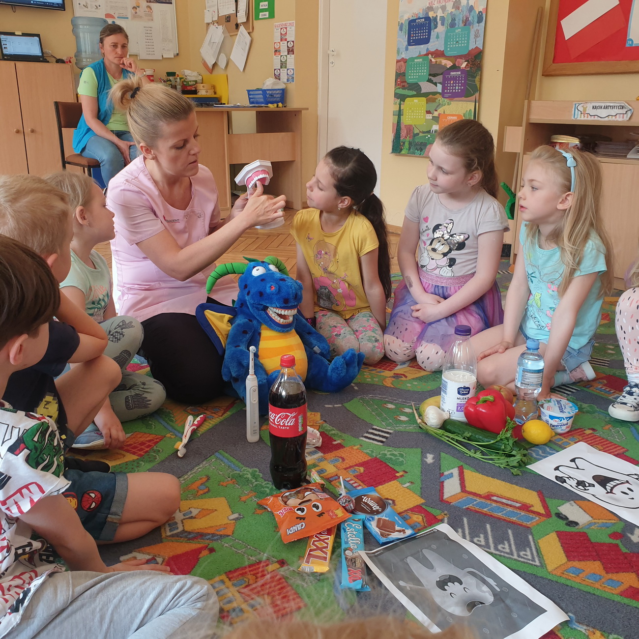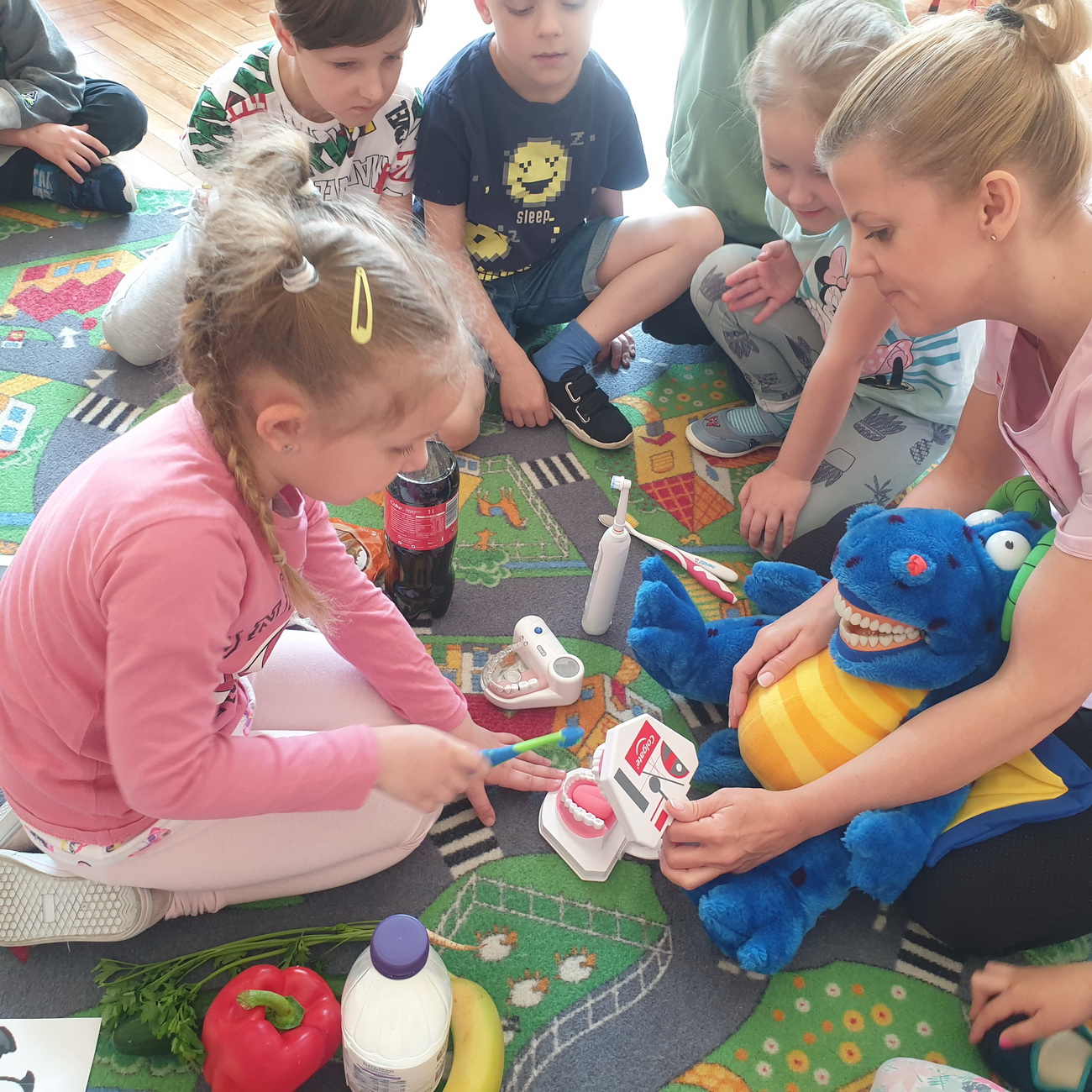 W ostatnim tygodniu maja grupę Pszczółki odwiedziła mama Blanki, która pracuje jako higienistka stomatologiczna. Pani Katarzyna zapoznała nasze przedszkolaki ze swoją pracą. Przybliżyła zasady zdrowego żywienia, które sprzyjają utrzymaniu zdrowych ząbków. Następnie zademonstrowała dzieciom sposób, w jaki należy właściwie szczotkować zęby, aby były zdrowe i lśniące. Przedszkolaki wzięły również udział w ciekawych zabawach. Na zakończenie na Pszczółki czekała miła niespodzianka. Każdy otrzymał pamiątkowy dyplom, naklejki oraz pasty do zębów. Mamy nadzieję, że żaden przedszkolak nie będzie się już bał wizyty u stomatologa. Jeszcze raz serdecznie dziękujemy za miłą wizytę.