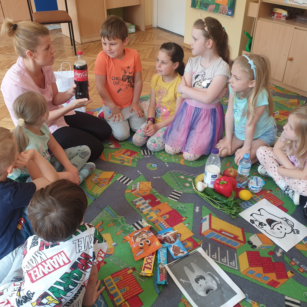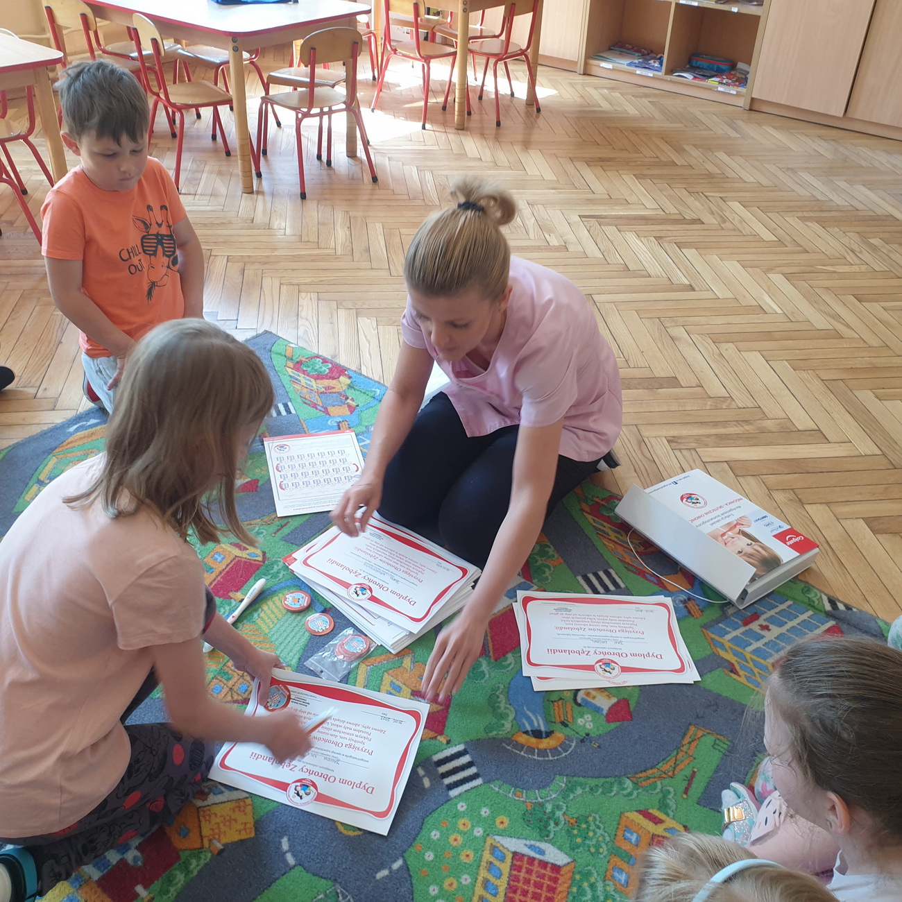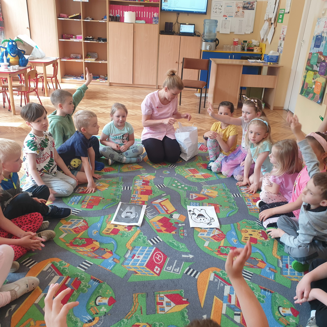 W ostatnim tygodniu maja grupę Pszczółki odwiedziła mama Blanki, która pracuje jako higienistka stomatologiczna. Pani Katarzyna zapoznała nasze przedszkolaki ze swoją pracą. Przybliżyła zasady zdrowego żywienia, które sprzyjają utrzymaniu zdrowych ząbków. Następnie zademonstrowała dzieciom sposób, w jaki należy właściwie szczotkować zęby, aby były zdrowe i lśniące. Przedszkolaki wzięły również udział w ciekawych zabawach. Na zakończenie na Pszczółki czekała miła niespodzianka. Każdy otrzymał pamiątkowy dyplom, naklejki oraz pasty do zębów. Mamy nadzieję, że żaden przedszkolak nie będzie się już bał wizyty u stomatologa. Jeszcze raz serdecznie dziękujemy za miłą wizytę.