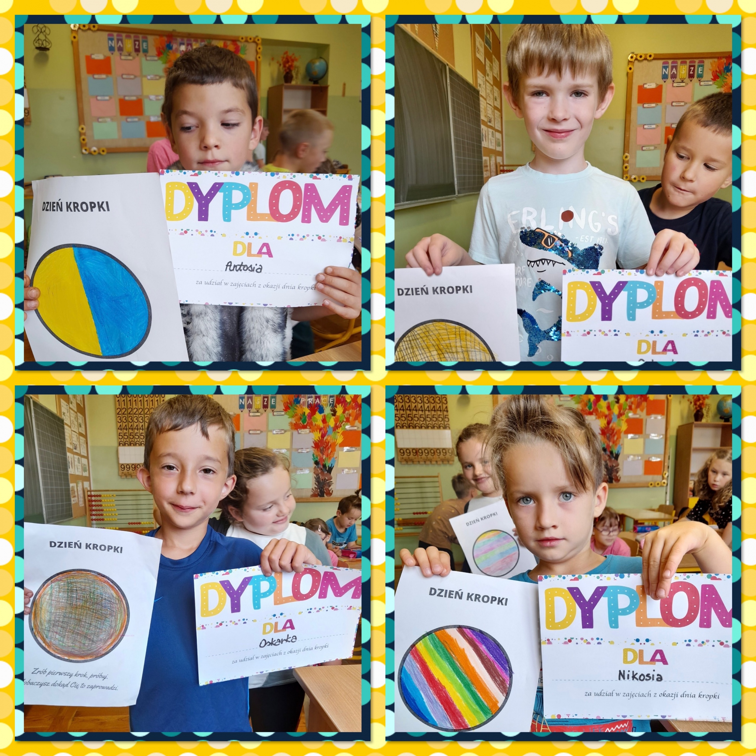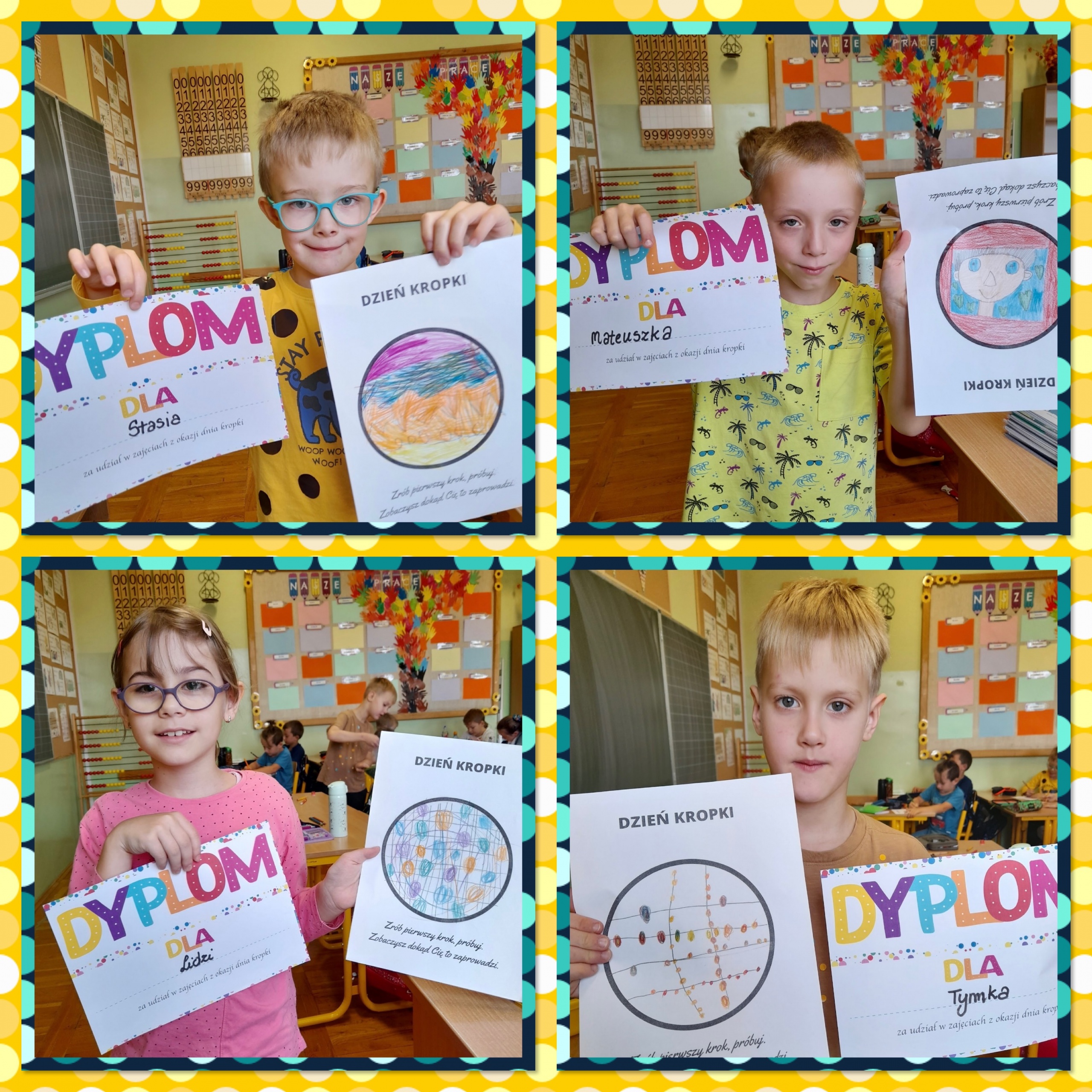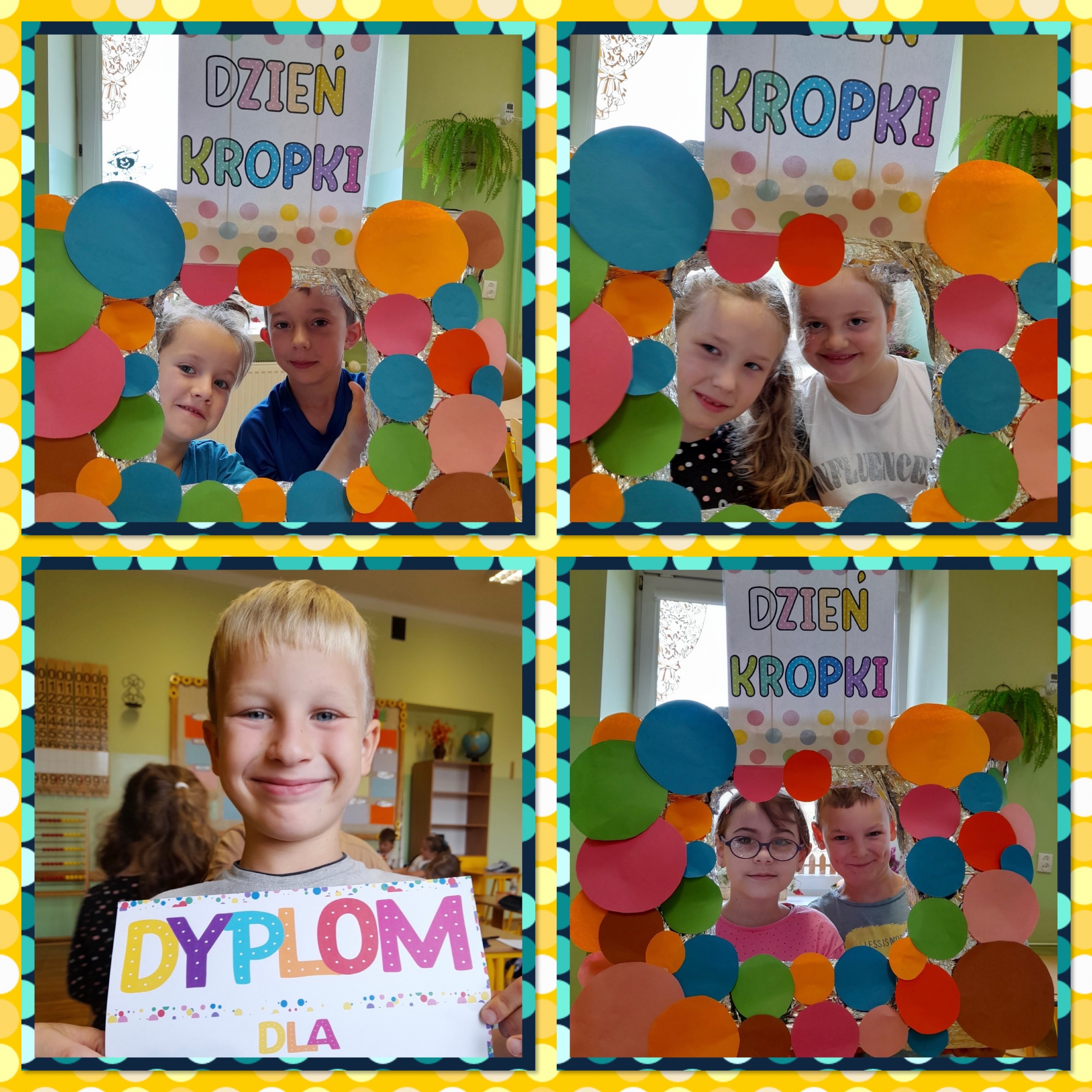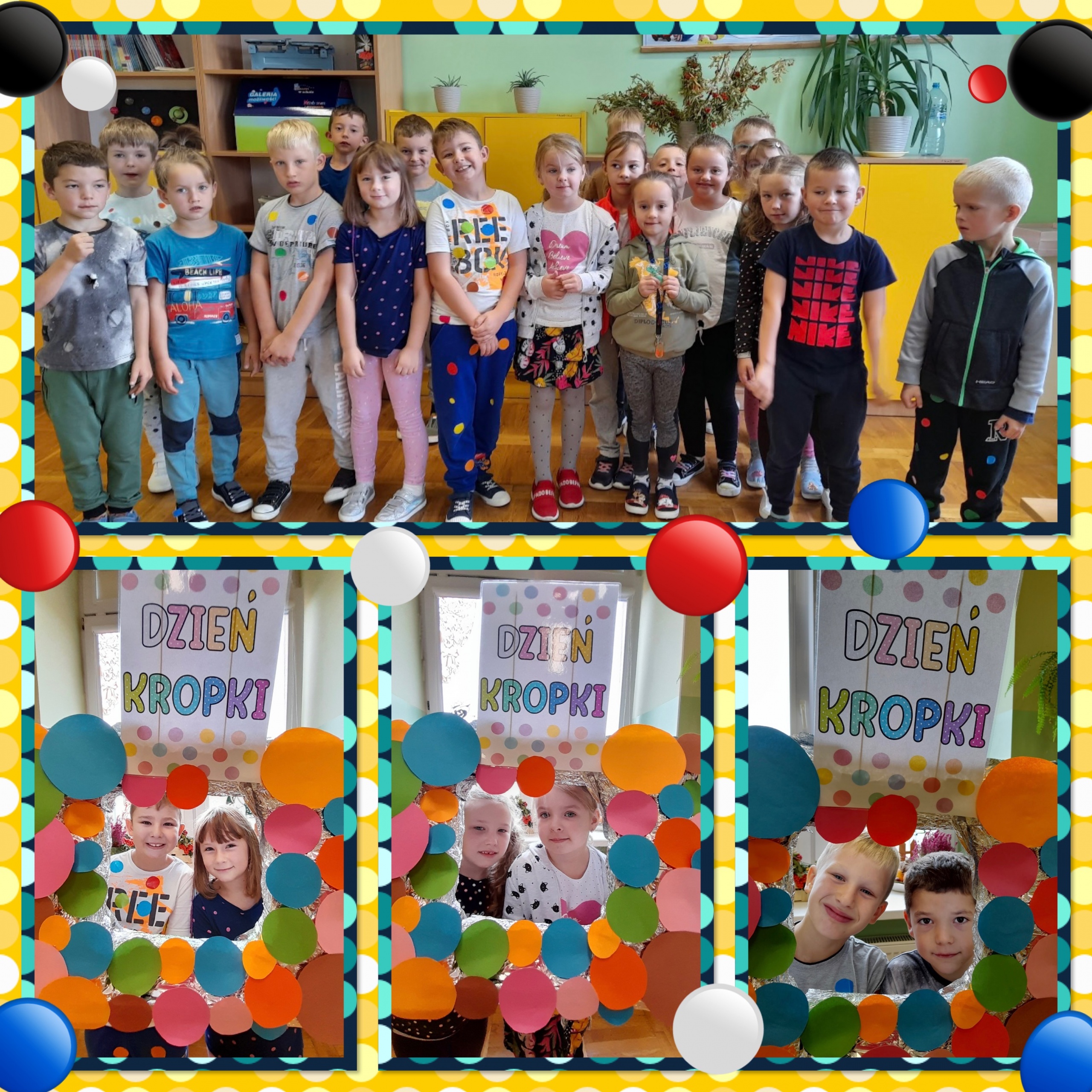 Od rana na korytarzach naszej szkoły królowały stylizacje w kropki. Uczniowie klas 1a, 1b oraz 3b podczas zajęć wzięły udział w kropkowych wyzwaniach i mogli stworzyć swoje indywidualne kropki. Każda z nich jest niepowtarzalna i unikatowa, tak jak talenty i mocne strony naszych uczniów. Dużym zainteresowaniem cieszyła się też sesja w fotobudce.