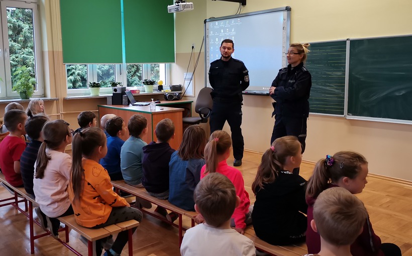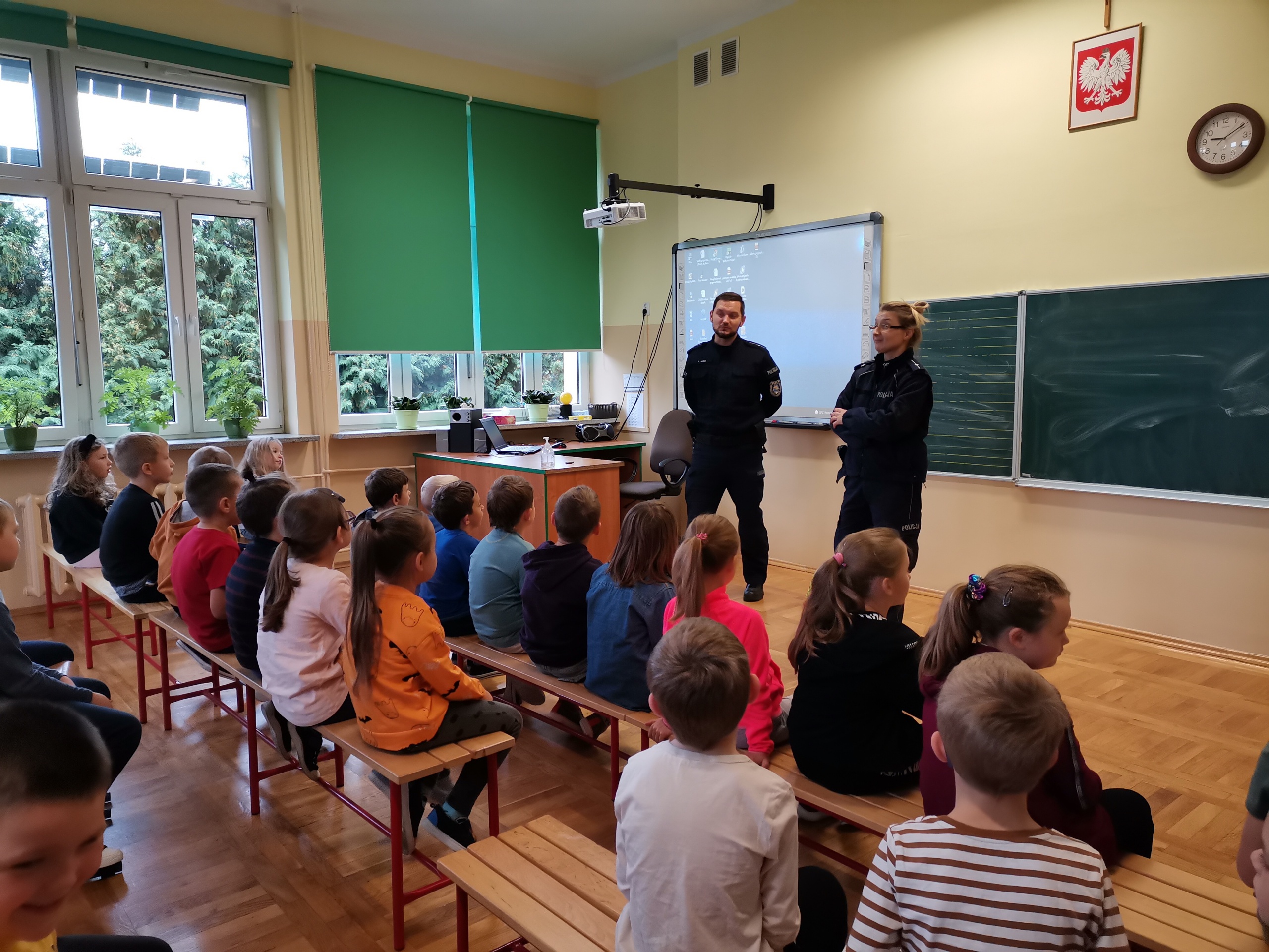 W czwartek, 22 września nasi uczniowie mieli okazję sprawdzić oraz poszerzyć swoją wiedzę, dotyczącą właściwego zachowania na drodze, podczas spotkania z policjantami, którzy przyjechali do naszej szkoły. Osobisty kontakt był także okazją do zadawania pytań, z czego dzieci chętnie korzystały. Czekamy na kolejne spotkania!