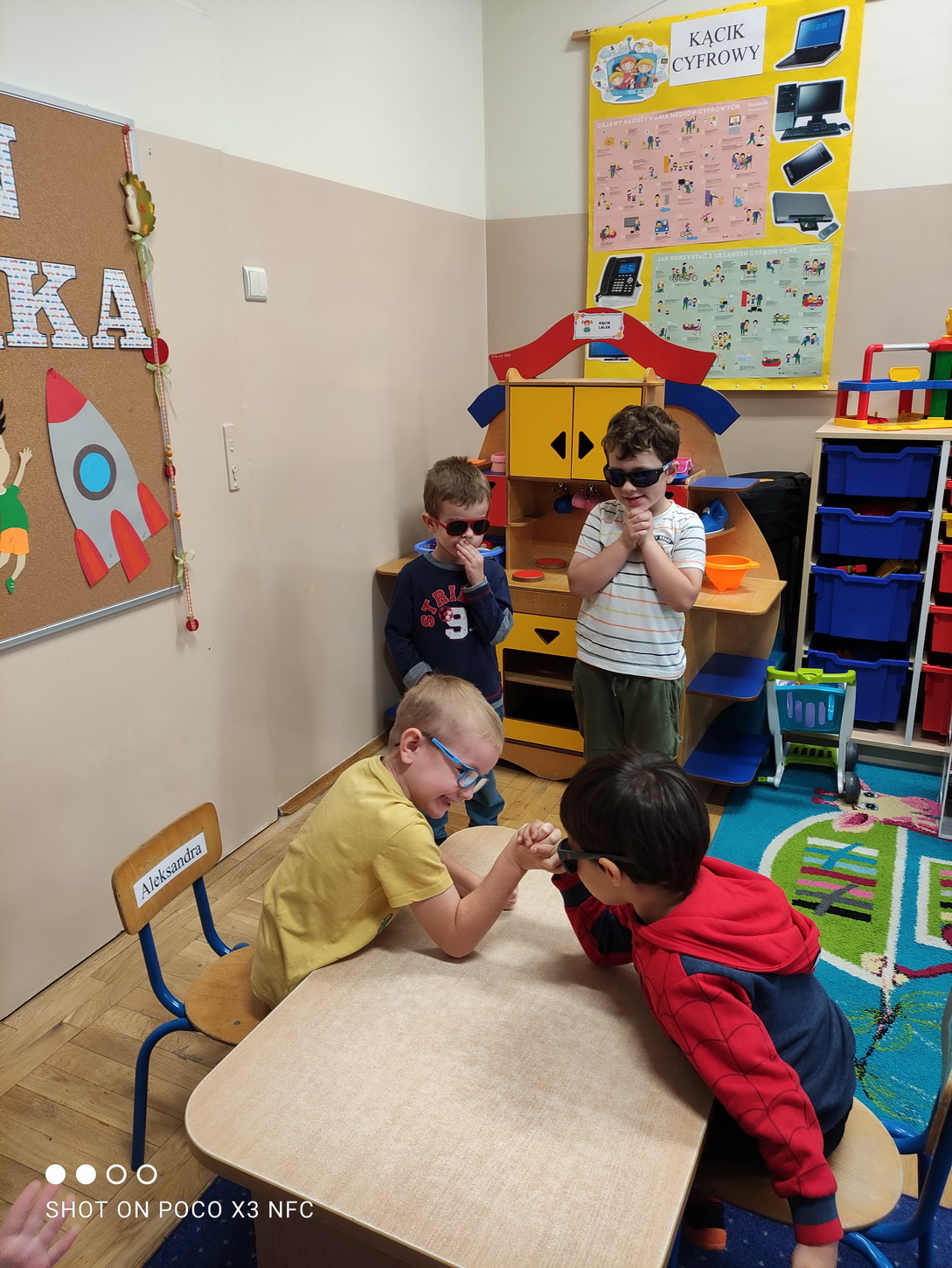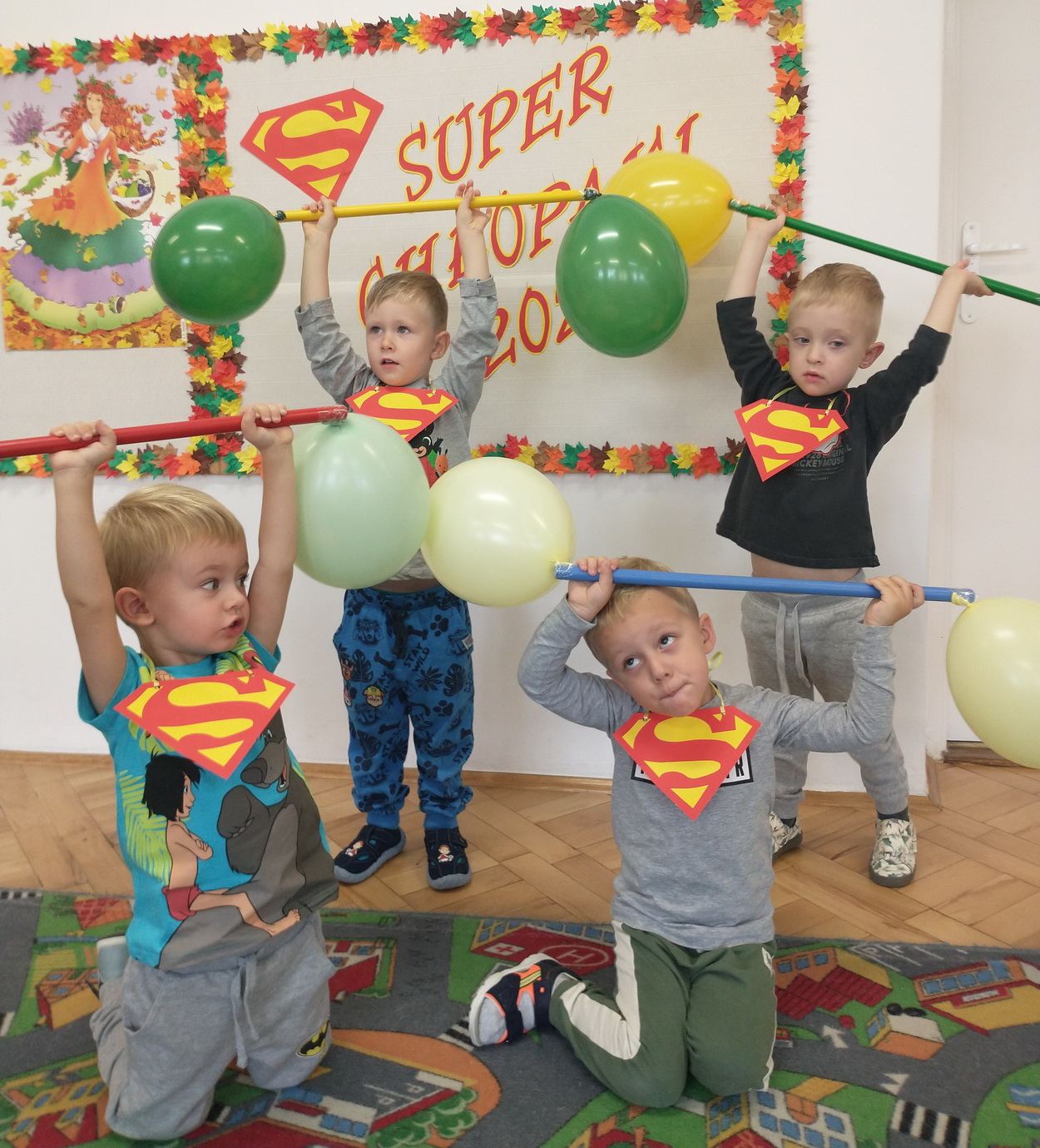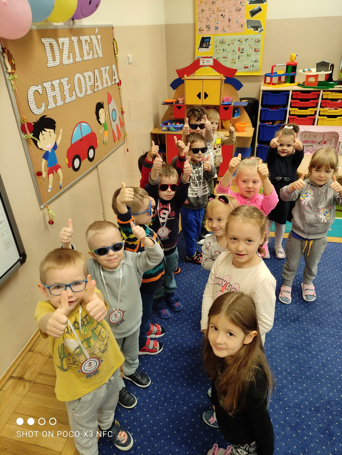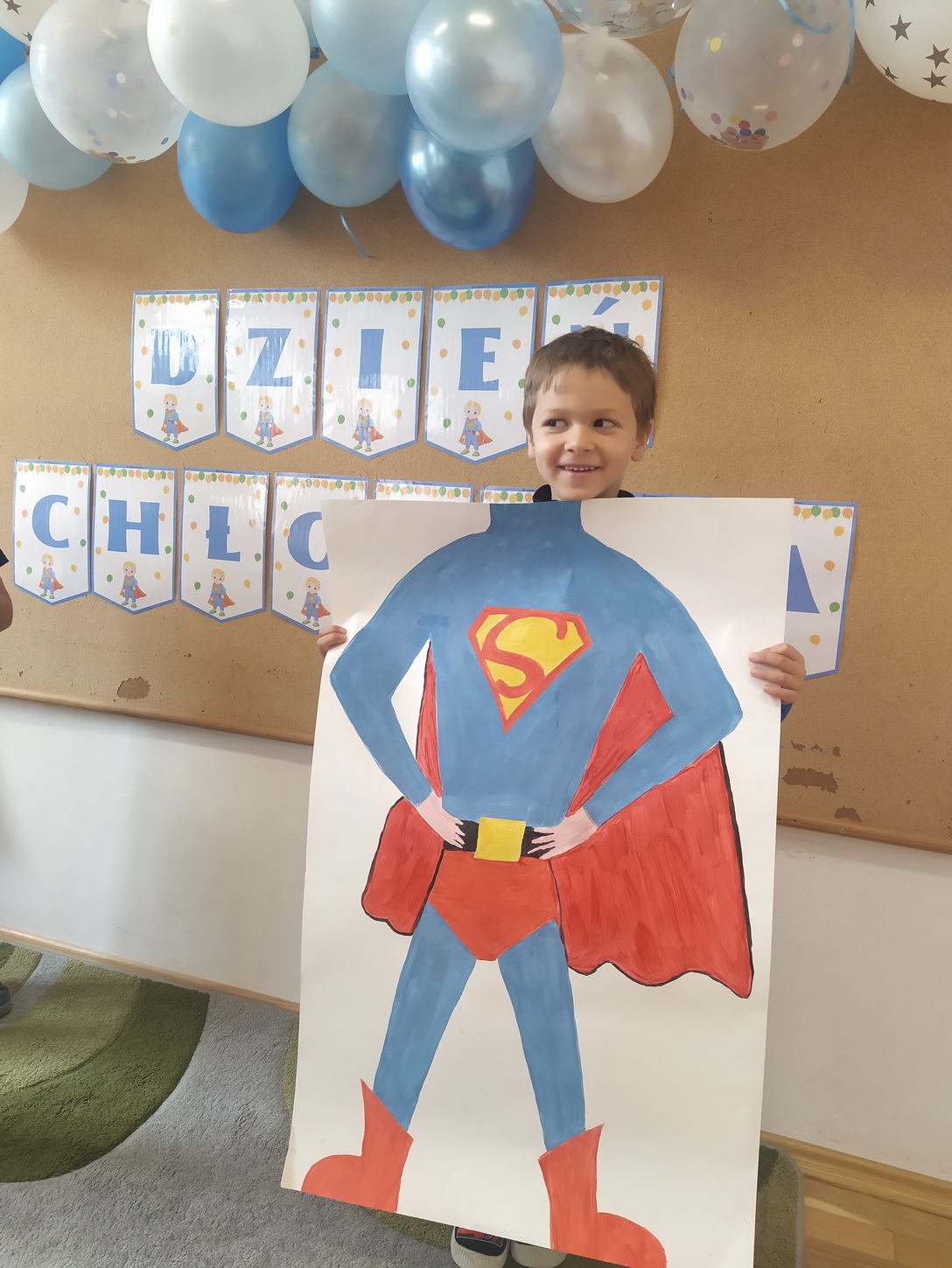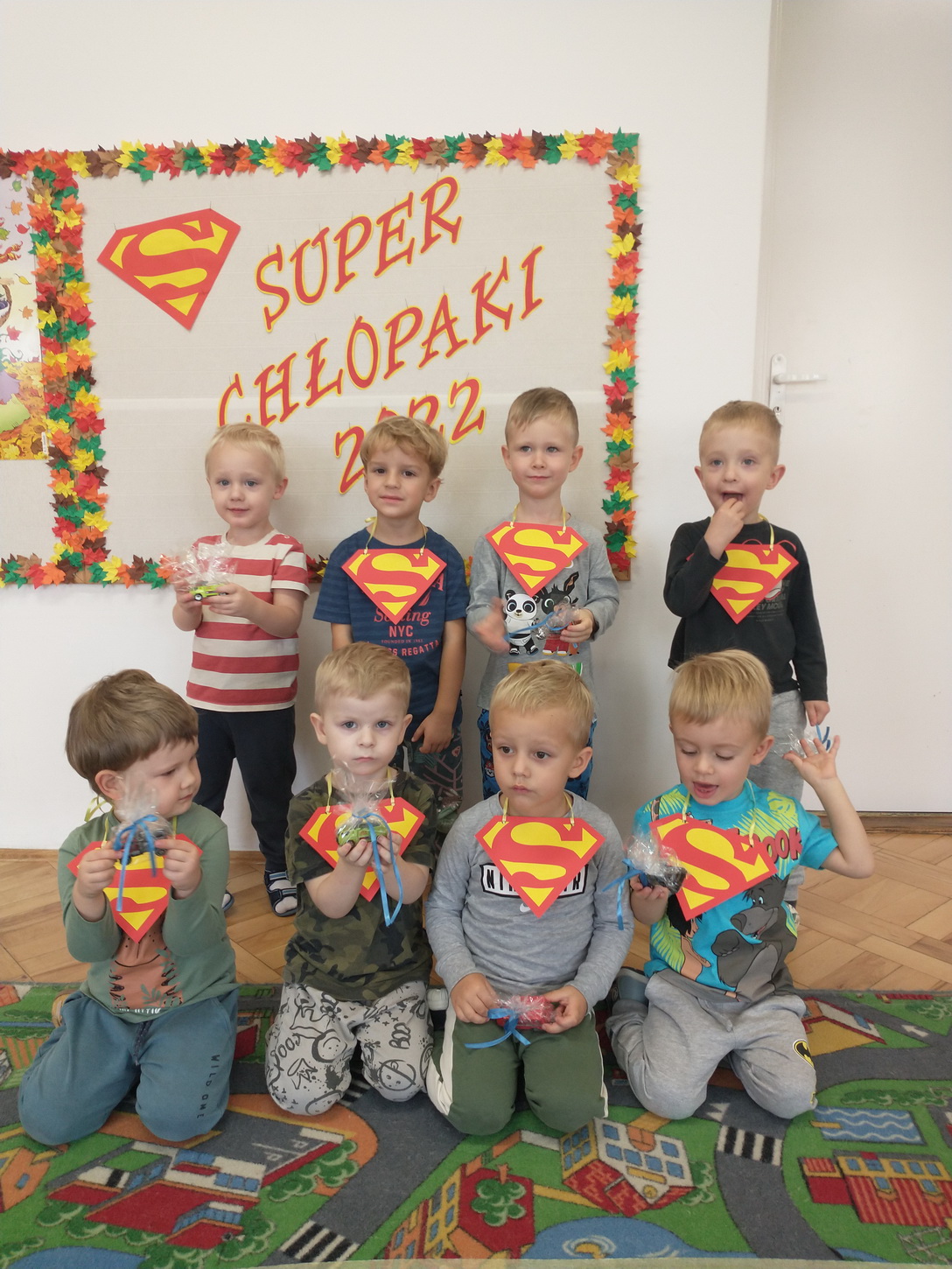 30 września obchodziliśmy w naszym przedszkolu szczególne święto, czyli Dzień Chłopaka. Aby sprawić radość chłopcom, dziewczynki zaśpiewały im uroczyste „Sto lat” oraz przygotowały drobne upominki. Podczas wspólnych zabaw i tańców, znalazł się czas na odznaczenie chłopców medalami „Superchłopaka”. Dzień pełen wrażeń, atrakcji i radości zakończył się sesją zdjęciową. Z przyjemnością i uśmiechem na twarzy będziemy wspominać to wydarzenie!