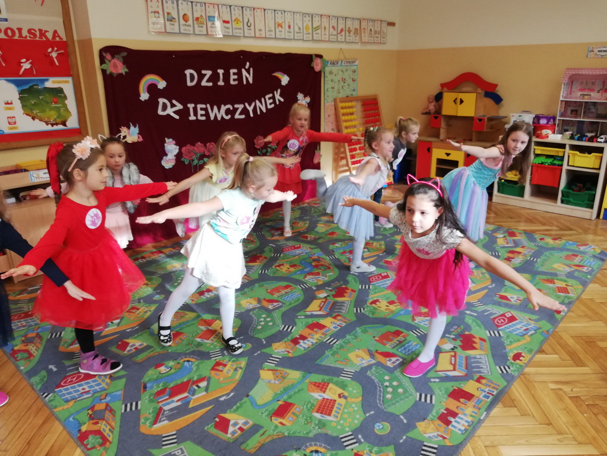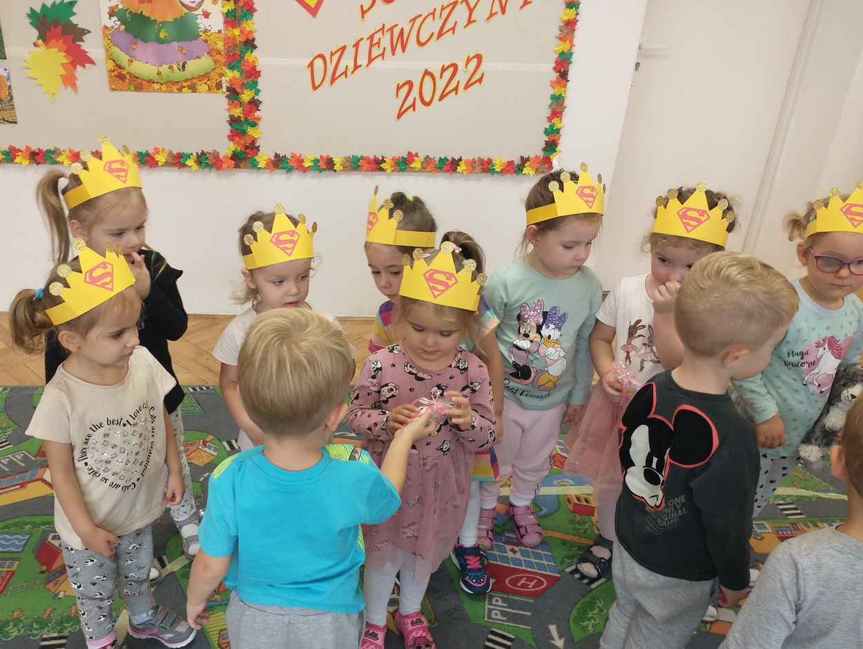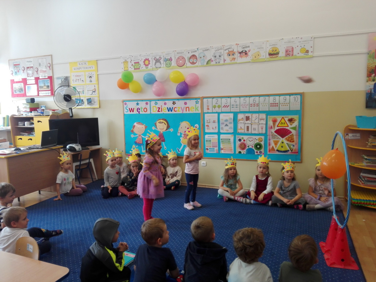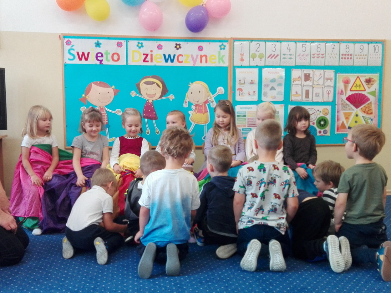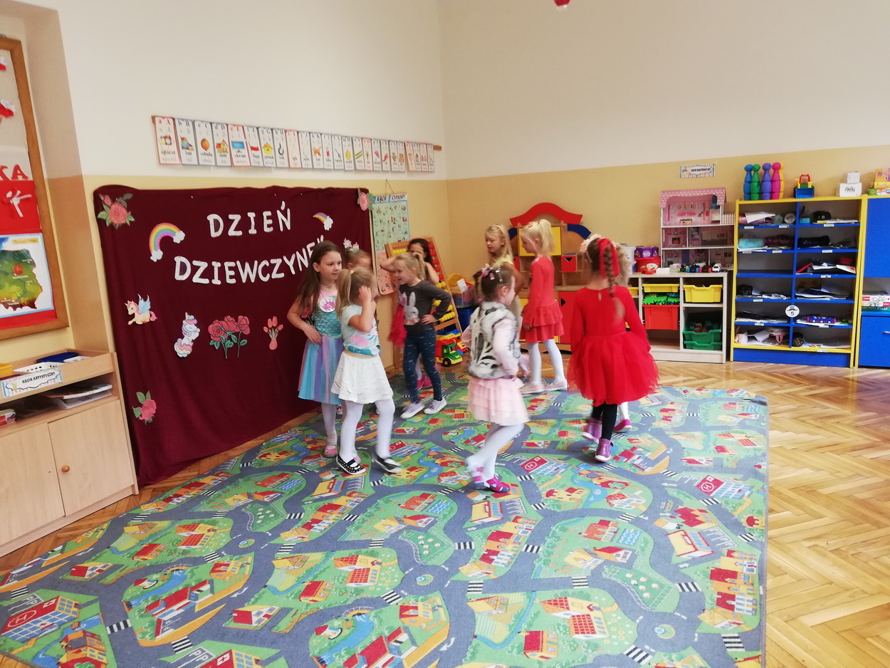 Dzień Dziewczynek to wyjątkowe wydarzenie, na które nasze małe damy czekały już od dłuższego czasu. Radosna atmosfera panowała od samego rana. Chłopcy złożyli życzenia, tradycyjnie zaśpiewali swoim koleżankom uroczyste „Sto lat” i wręczyli piękne laurki oraz niespodzianki. Chłopcy bardzo mocno starali się, aby ten dzień uczynić wyjątkowo miłym. Jako mali dżentelmeni wyręczali dziewczynki w codziennych obowiązkach, między innymi w porządkowaniu sali po zabawie. Było można usłyszeć taneczną muzykę, w rytm której bawiły się zarówno dziewczynki jak i chłopcy. Wiele radości sprawiły dzieciom przygotowane z tej okazji zabawy i konkurencje. Uśmiechnięte buzie przedszkolaków, a zwłaszcza dziewczynek świadczyły o miło spędzonym czasie.