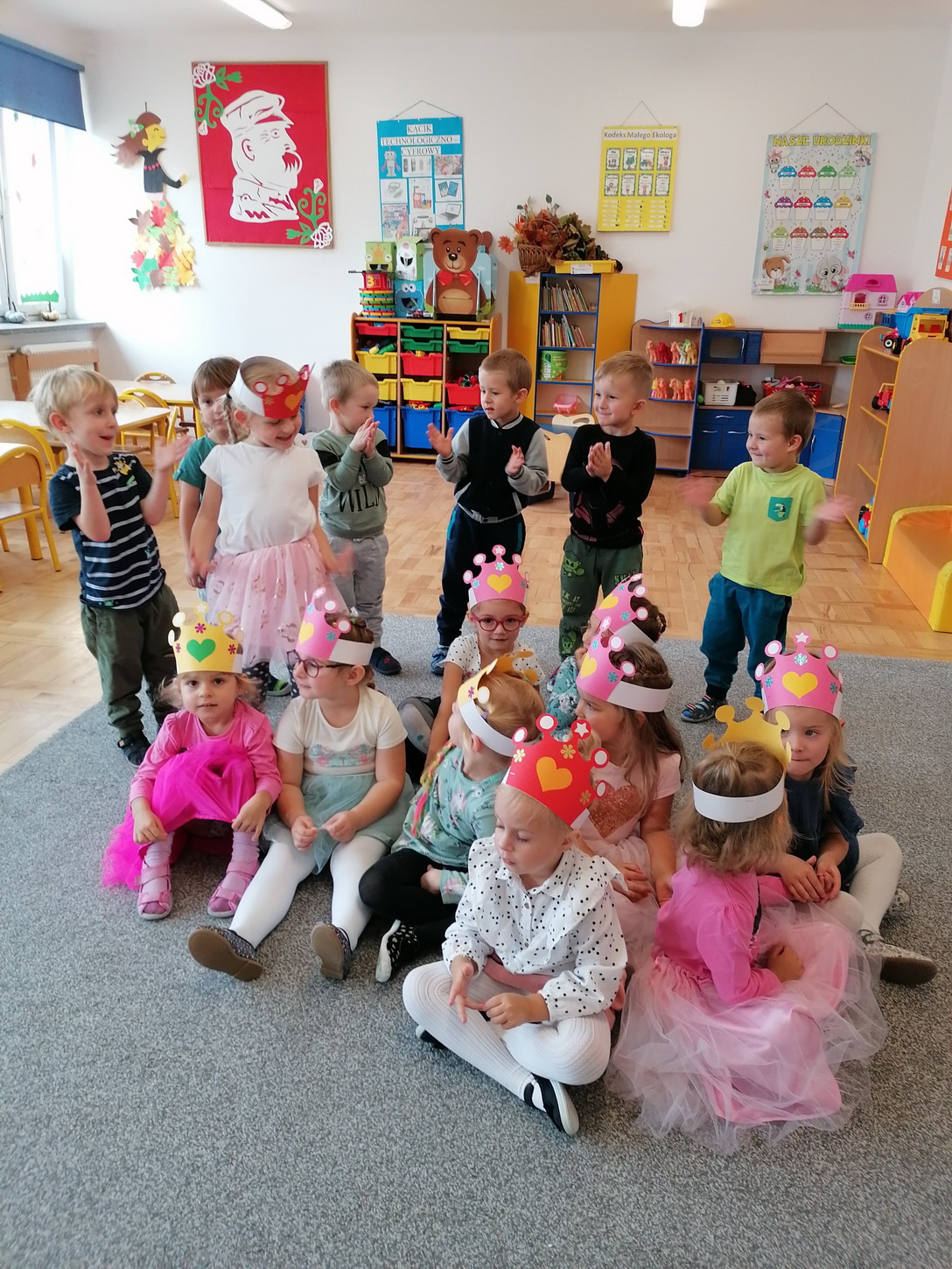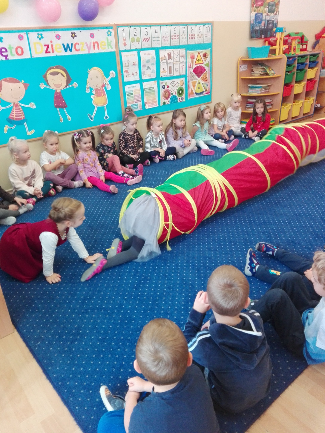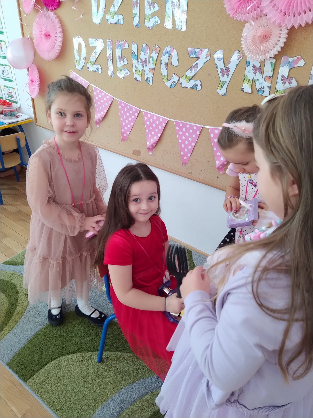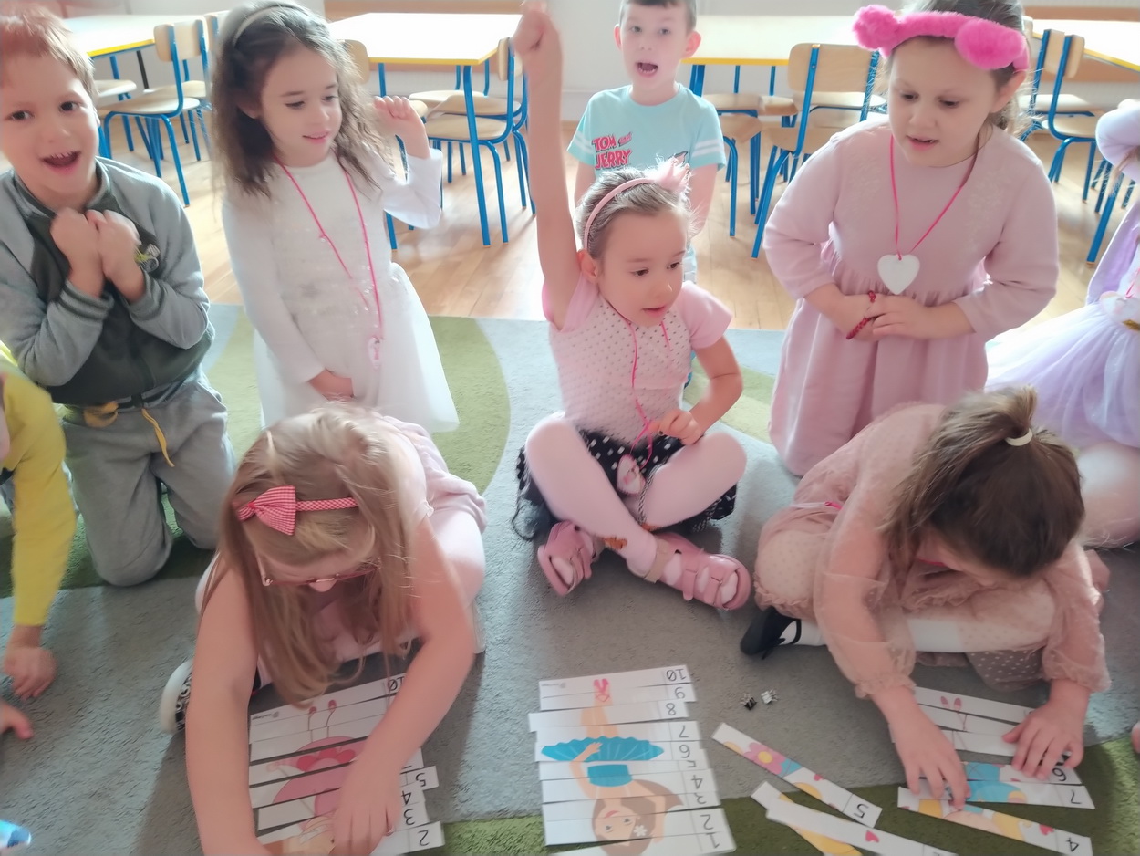 Dzień Dziewczynek to wyjątkowe wydarzenie, na które nasze małe damy czekały już od dłuższego czasu. Radosna atmosfera panowała od samego rana. Chłopcy złożyli życzenia, tradycyjnie zaśpiewali swoim koleżankom uroczyste „Sto lat” i wręczyli piękne laurki oraz niespodzianki. Chłopcy bardzo mocno starali się, aby ten dzień uczynić wyjątkowo miłym. Jako mali dżentelmeni wyręczali dziewczynki w codziennych obowiązkach, między innymi w porządkowaniu sali po zabawie. Było można usłyszeć taneczną muzykę, w rytm której bawiły się zarówno dziewczynki jak i chłopcy. Wiele radości sprawiły dzieciom przygotowane z tej okazji zabawy i konkurencje. Uśmiechnięte buzie przedszkolaków, a zwłaszcza dziewczynek świadczyły o miło spędzonym czasie.
