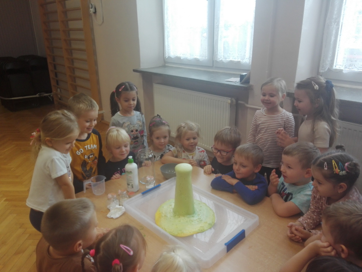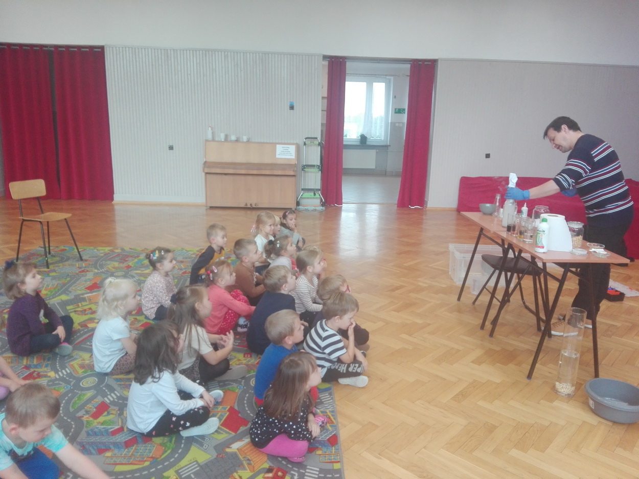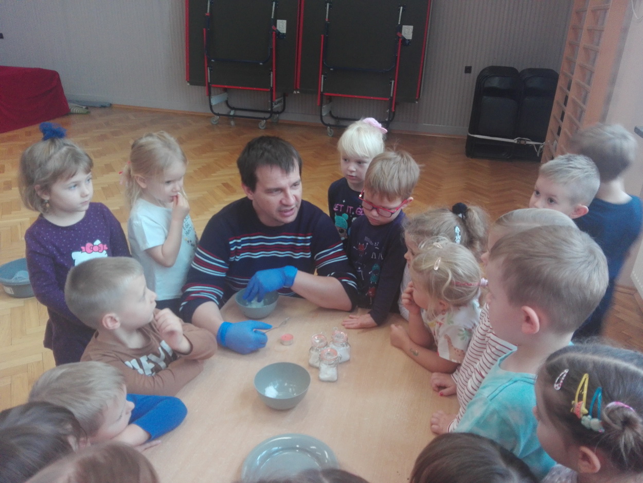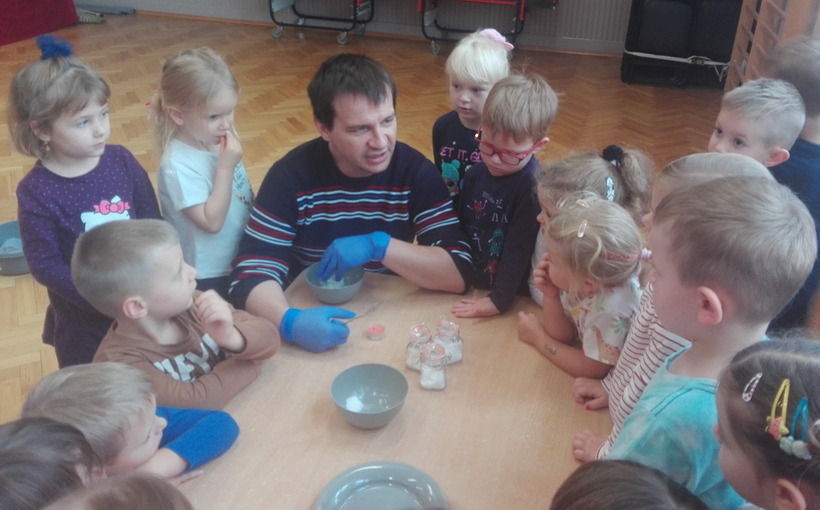 Dzieci z grup: Misie, Żabki oraz Słoneczka miały możliwość poczuć się jak prawdziwi naukowcy. Wspólnie z prowadzącym warsztaty “Świat eksperymentów” odkrywały i wyjaśniały zjawiska, które zachodzą obok nas. Przedszkolaki zobaczyły, na jakich zasadach działa silnik odrzutowca, poznały m.in. moc wulkanu, jak reaguje płomień i woda na brak tlenu. Mali badacze byli zgodni, że eksperymentowanie oraz przeprowadzanie doświadczeń jest niezwykle ciekawe i pouczające. Kto wie, może już w niejednej głowie tworzy się coś niezwykłego i odkrywczego?
