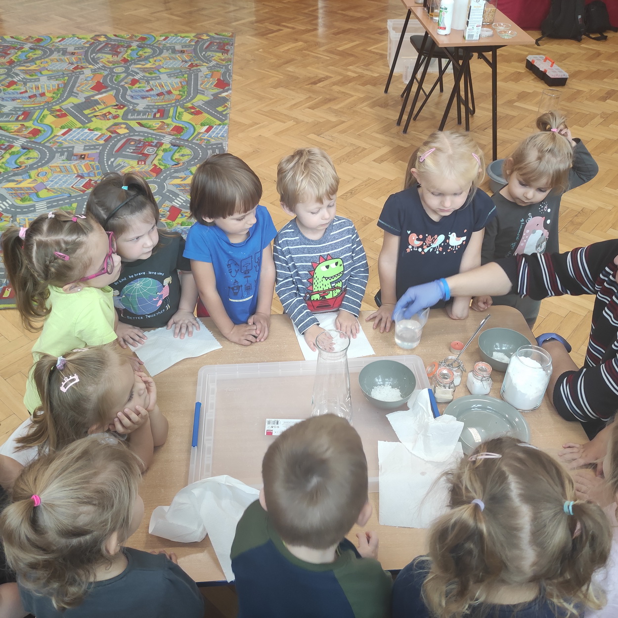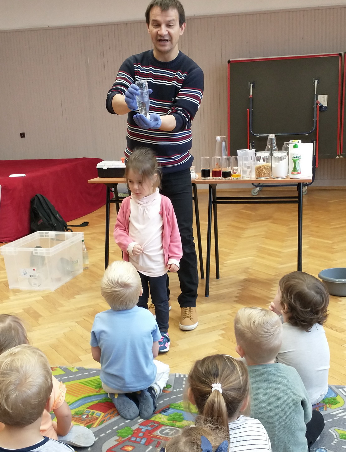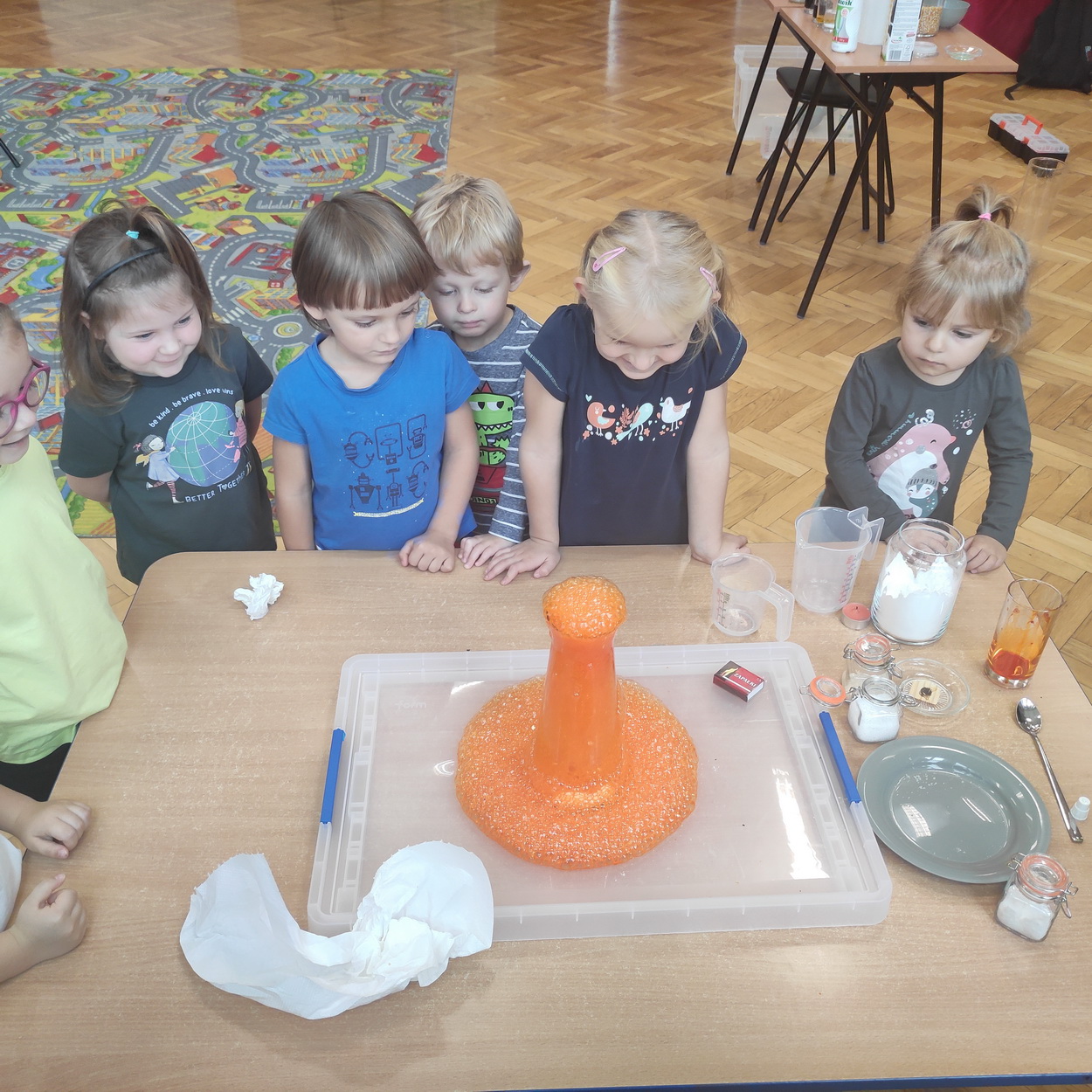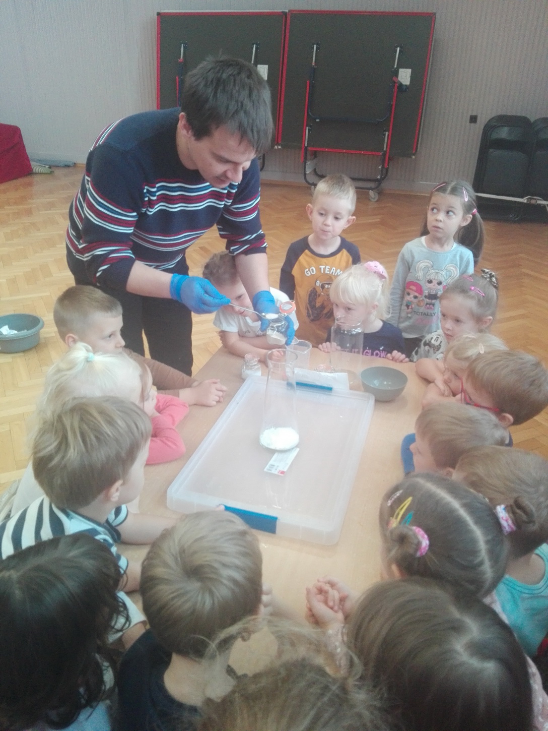 Dzieci z grup: Misie, Żabki oraz Słoneczka miały możliwość poczuć się jak prawdziwi naukowcy. Wspólnie z prowadzącym warsztaty “Świat eksperymentów” odkrywały i wyjaśniały zjawiska, które zachodzą obok nas. Przedszkolaki zobaczyły, na jakich zasadach działa silnik odrzutowca, poznały m.in. moc wulkanu, jak reaguje płomień i woda na brak tlenu. Mali badacze byli zgodni, że eksperymentowanie oraz przeprowadzanie doświadczeń jest niezwykle ciekawe i pouczające. Kto wie, może już w niejednej głowie tworzy się coś niezwykłego i odkrywczego?